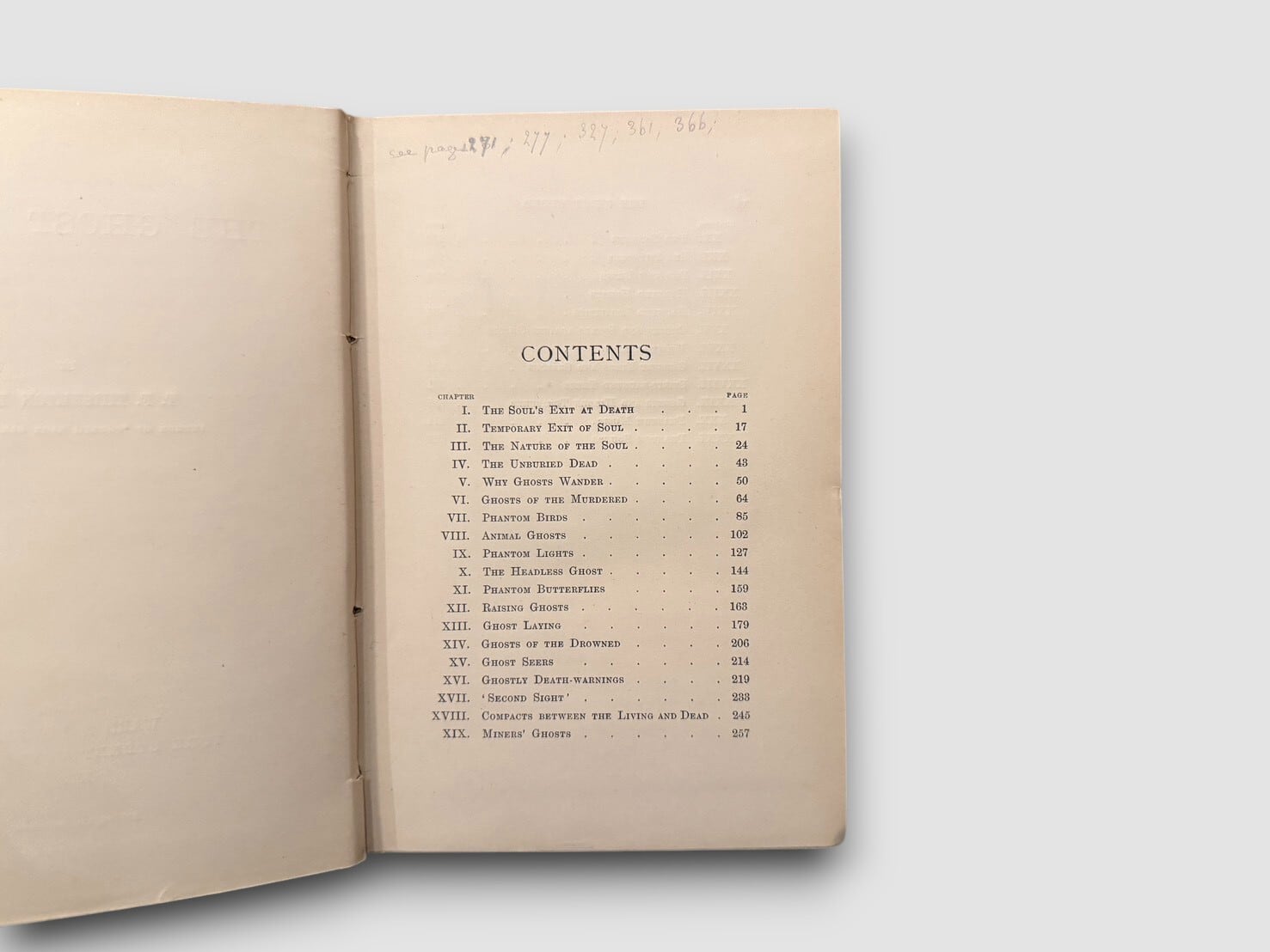 ヨーロッパを中心に伝わる幽霊観や死後観に関連する資料をまとめた民俗学的研究書。魂の離脱、未埋葬の死者、死者の彷徨、動物に関する幽霊譚、怪火、幽霊の衣服、幽霊の季節性、隠された財宝にまつわる伝承など、複数のテーマが章ごとに紹介されている。1893年に刊行された初版。珍しい1冊。
