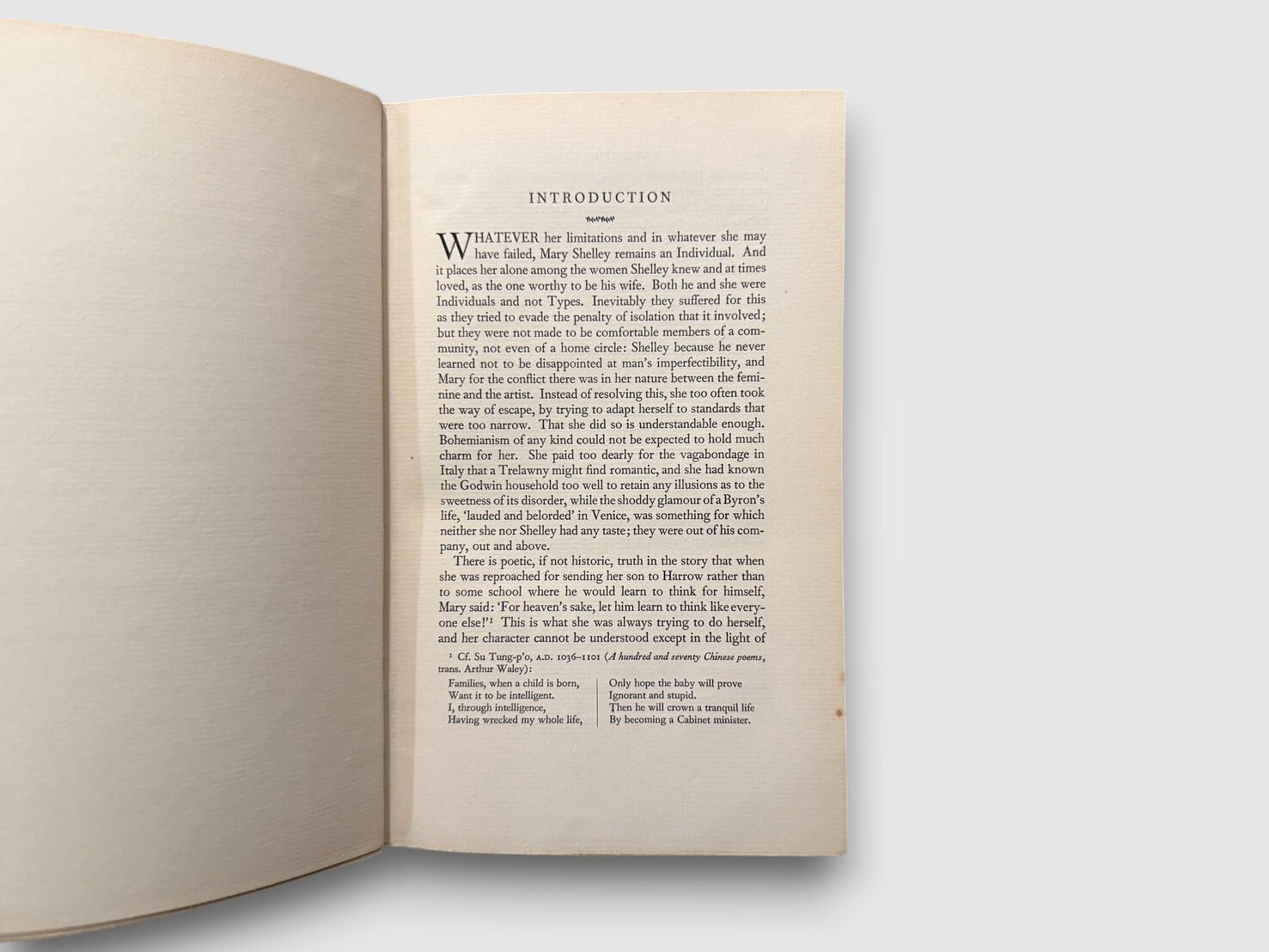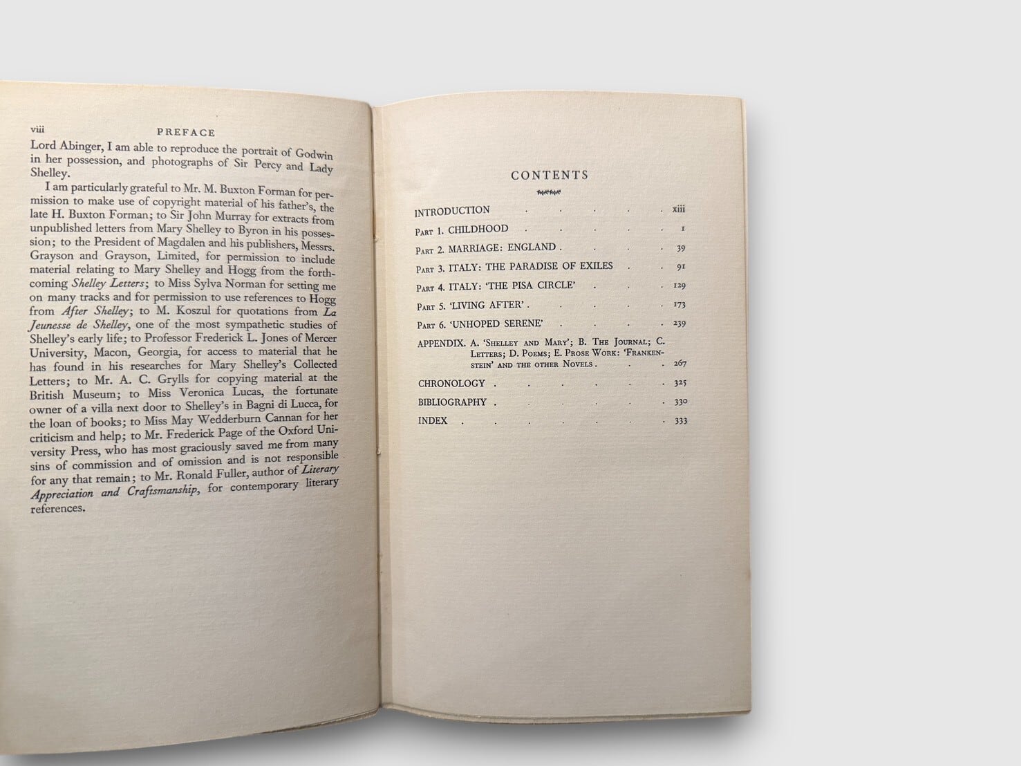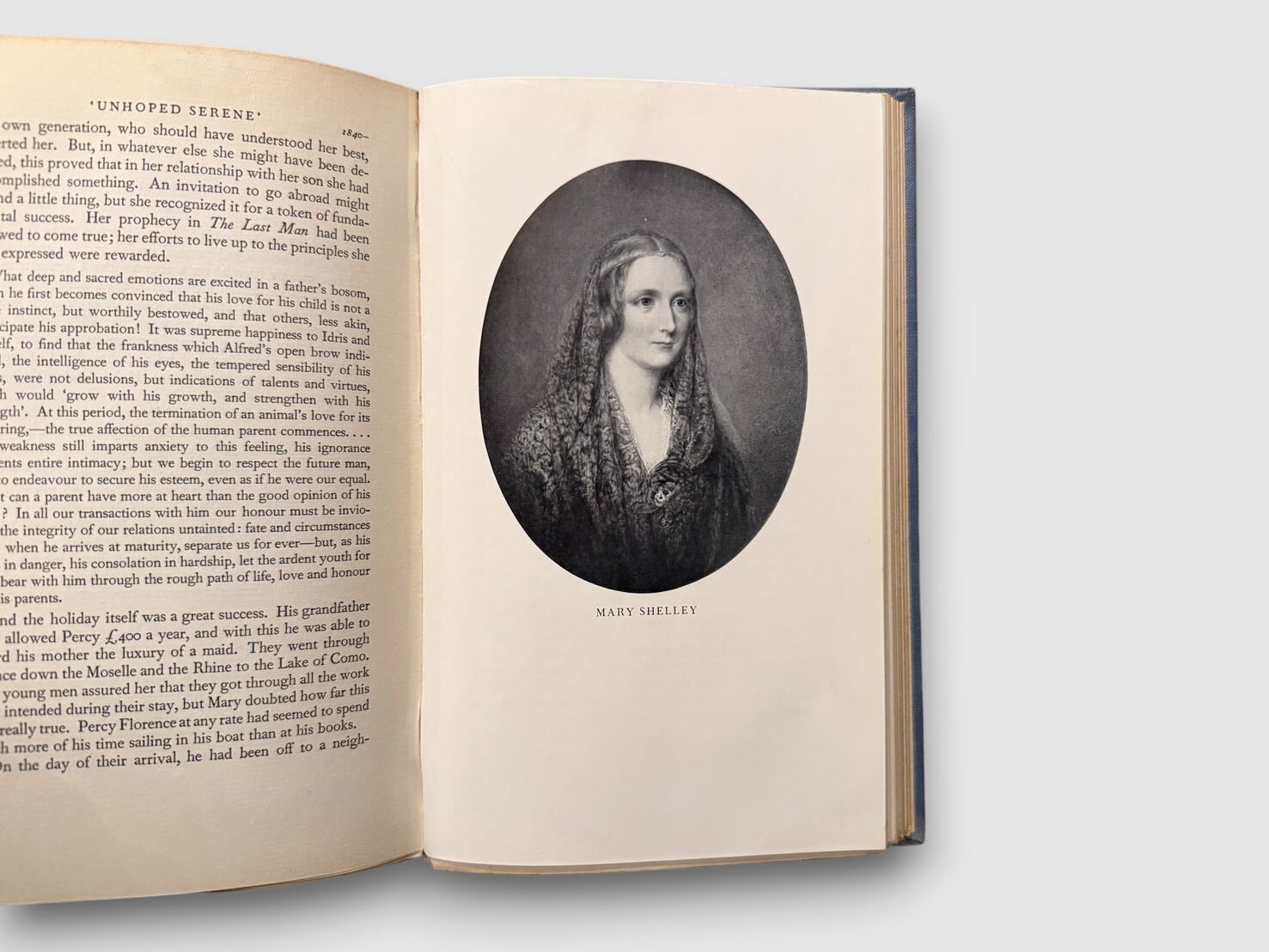 メアリー・シェリー(1797–1851)の本格的な伝記。オックスフォード大学出版局より1938年に刊行された初版。著者 R. Glynn Grylls(筆名、本名 Dorothy Margaret Stuart)は、英国文学・詩・歴史を専門とする伝記作家で、本書では『Frankenstein』の作者としての顔だけでなく、家族の中で育まれた知的環境、パーシー・シェリーとの関係、ヨーロッパ各地を転々とした亡命・放浪の日々、晩年の生活と作家としての成熟まで、メアリーの人生を多面的に描き出している。文学史・伝記研究のコレクションとしてもおすすめの一冊。