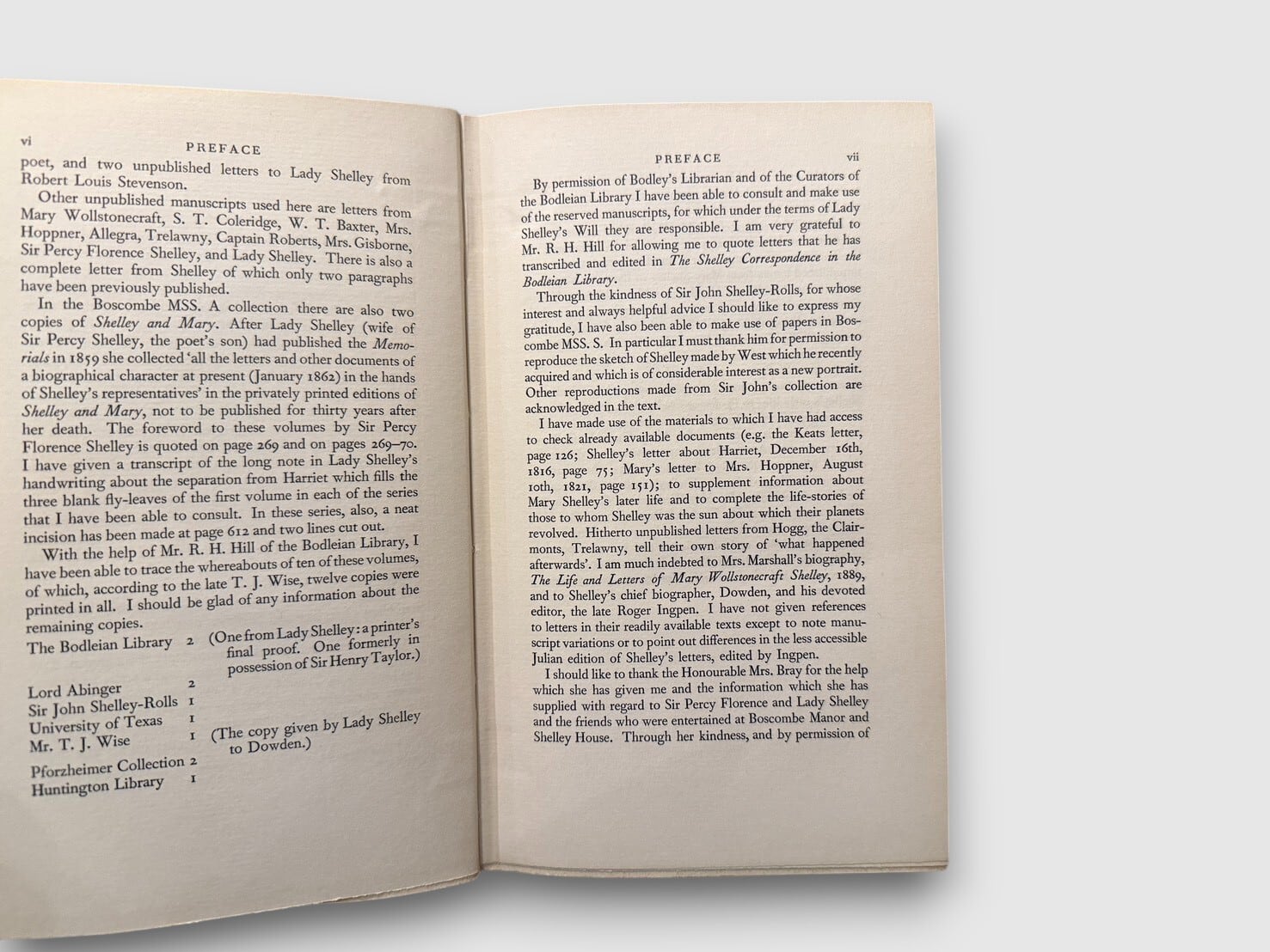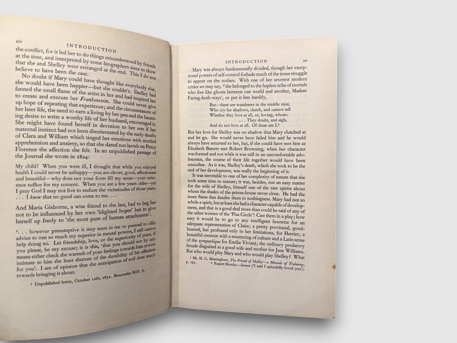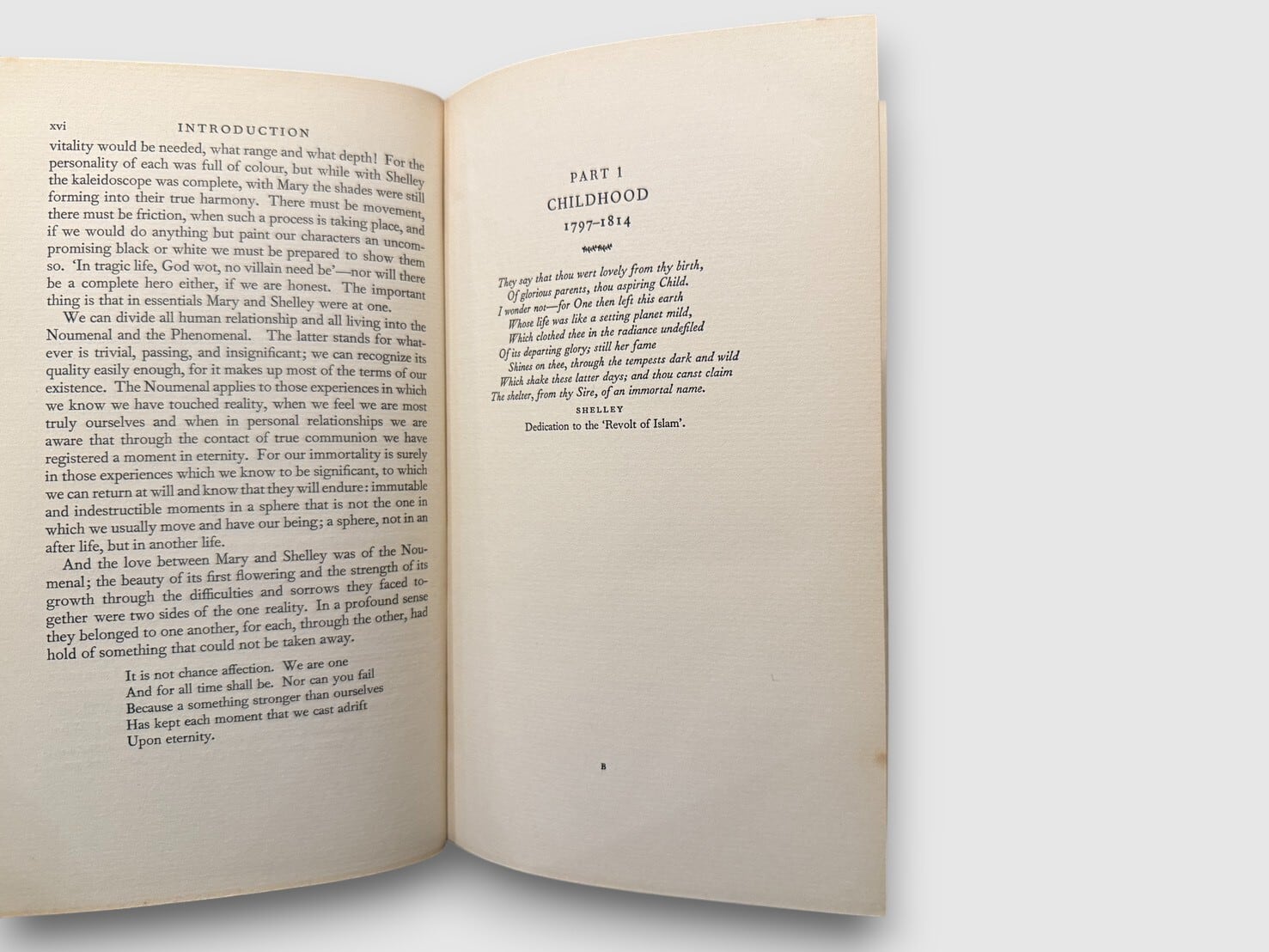 メアリー・シェリー(1797–1851)の本格的な伝記。オックスフォード大学出版局より1938年に刊行された初版。著者 R. Glynn Grylls(筆名、本名 Dorothy Margaret Stuart)は、英国文学・詩・歴史を専門とする伝記作家で、本書では『Frankenstein』の作者としての顔だけでなく、家族の中で育まれた知的環境、パーシー・シェリーとの関係、ヨーロッパ各地を転々とした亡命・放浪の日々、晩年の生活と作家としての成熟まで、メアリーの人生を多面的に描き出している。文学史・伝記研究のコレクションとしてもおすすめの一冊。