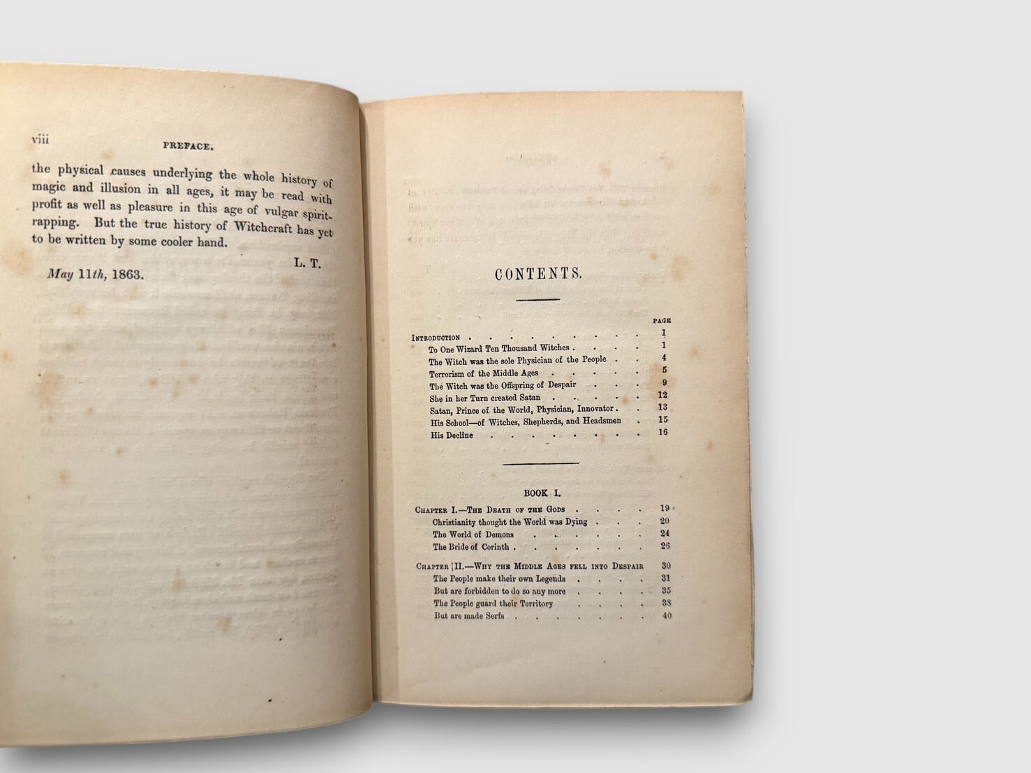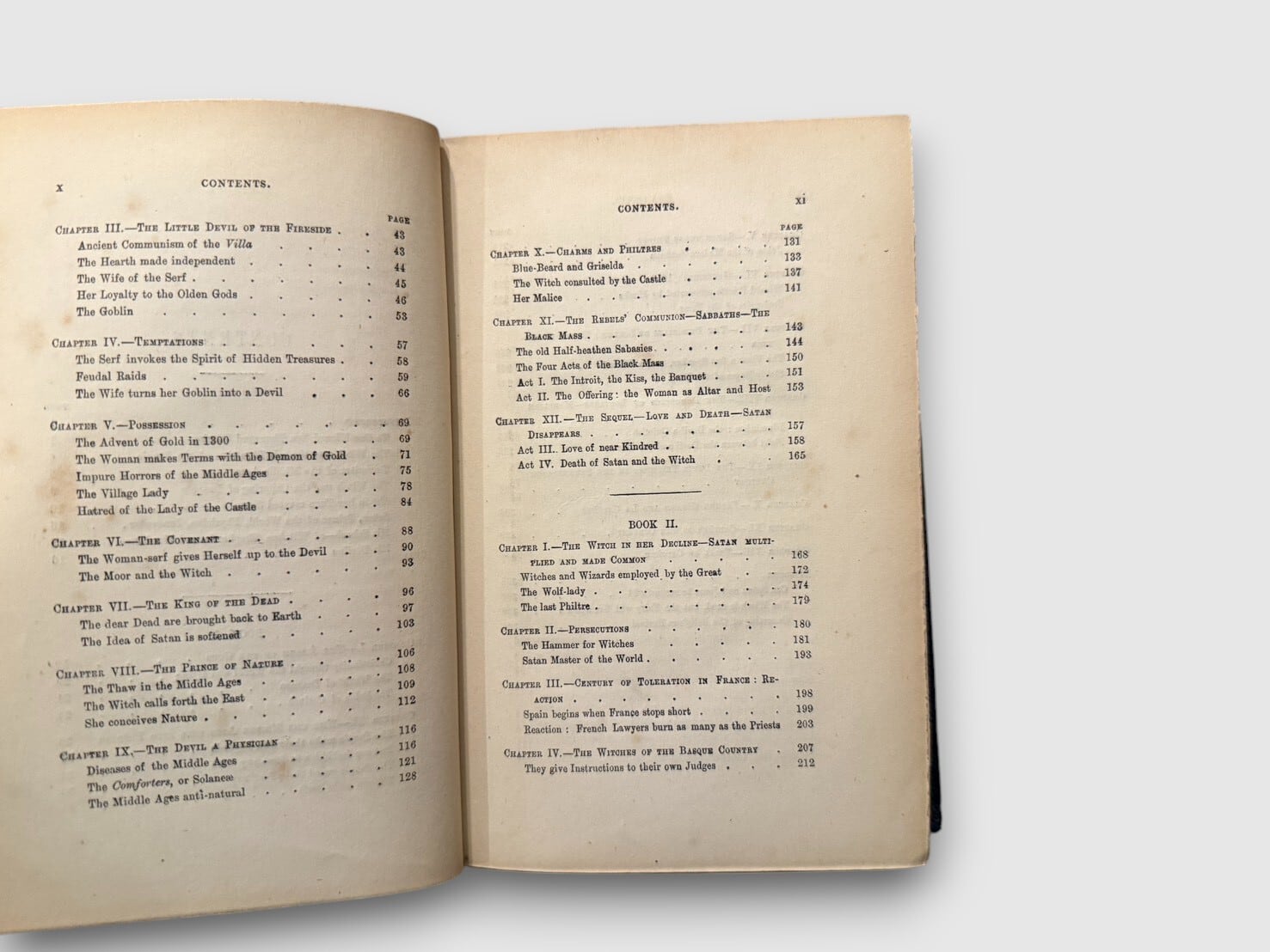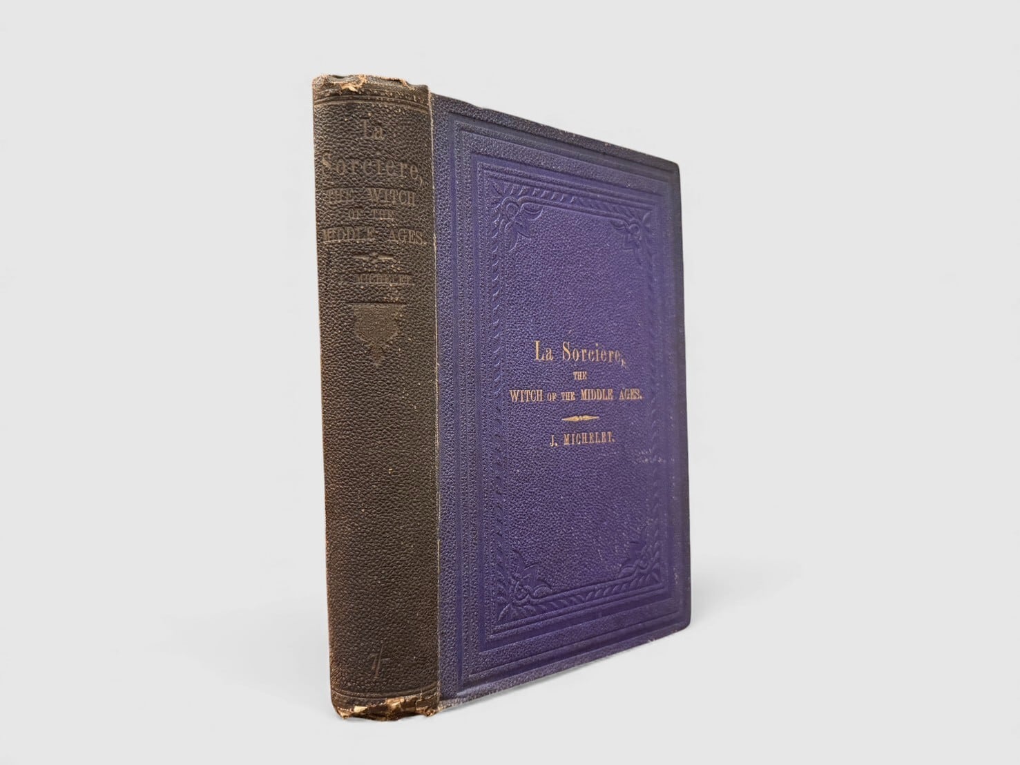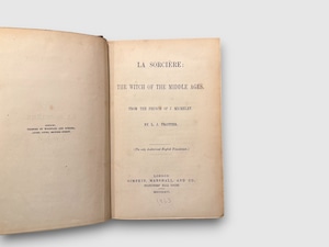 フランスの歴史家ジュール・ミシュレによる『La Sorcière(魔女)』英語版初版(1863年)。中世の迷信・恐怖・農村の民俗、異端審問、悪魔観、疫病と宗教像の交錯、魔女裁判の実例など、中世ヨーロッパの宗教文化が抱えていた闇と構造を照らし出す豊かな内容で構成されている。ミシュレが描いた魔女像は、単なる“迷信の象徴”にとどまらず、しばしば 抑圧への反応や民衆文化のエネルギーを象徴する存在 として読まれてきたため、後の魔女研究・文化史研究でもたびたび参照される古典的著作となっている。非常に珍しい1冊。