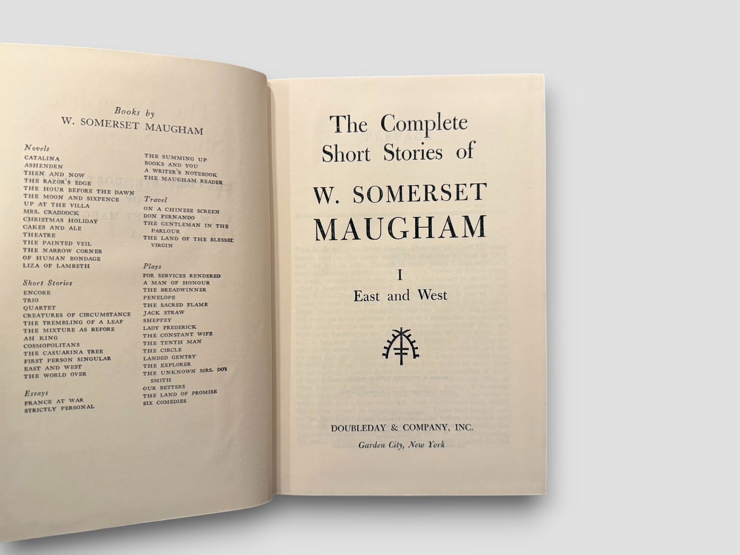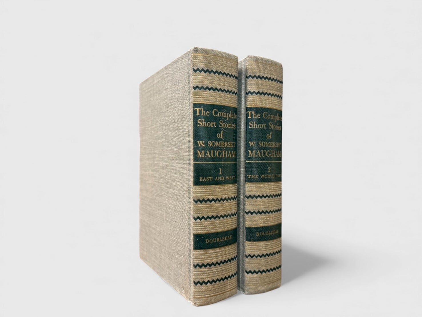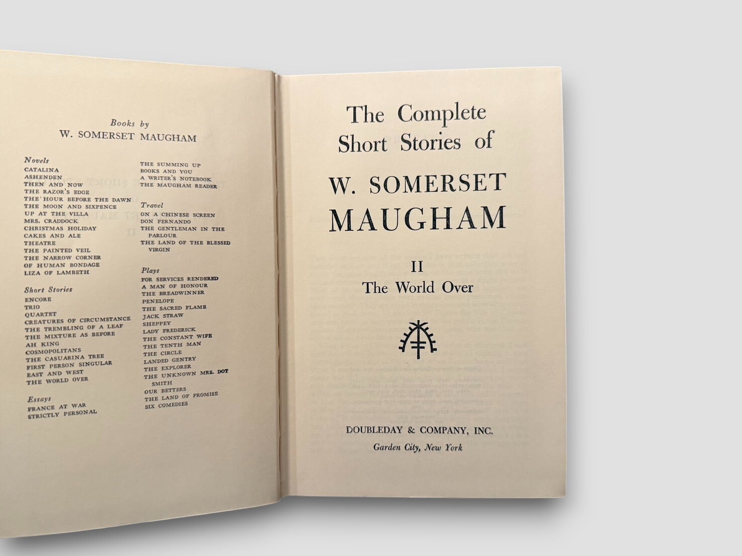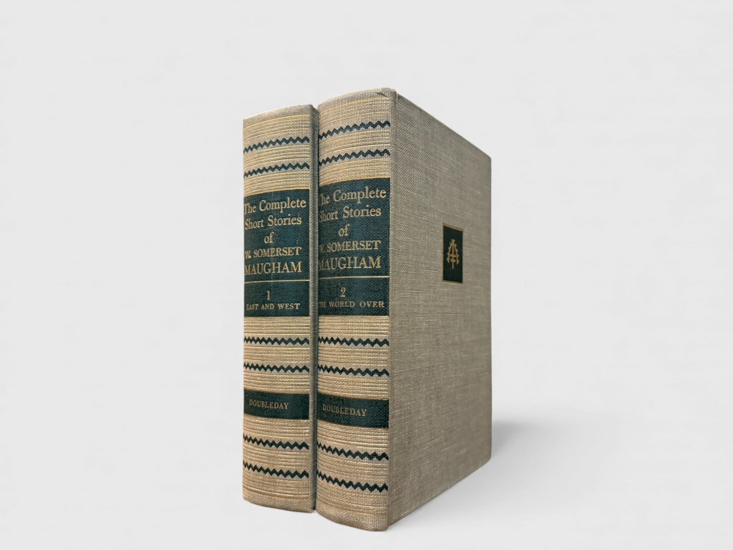 W・サマセット・モームの短篇世界を二巻に収めた Doubleday 版のセット。Volume I “East and West”、Volume II “The World Over” の構成で、モームが長い文業の中で生み出した短篇作品のほぼ全体を収めた決定版的な編集となっている。各巻の冒頭にあるモーム自身による長い序文も魅力的な、スリップケース付きの全2巻本揃。