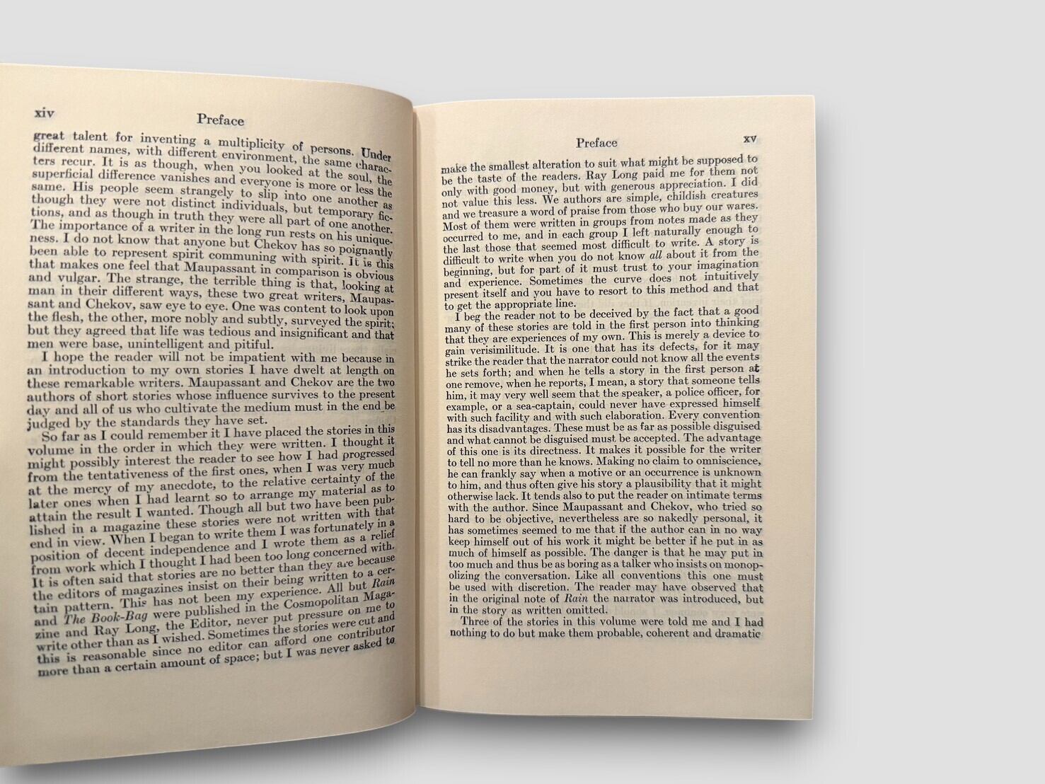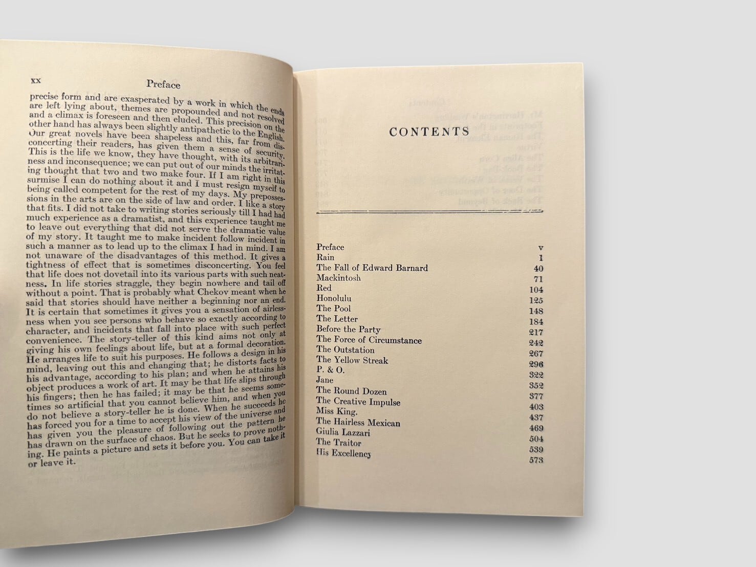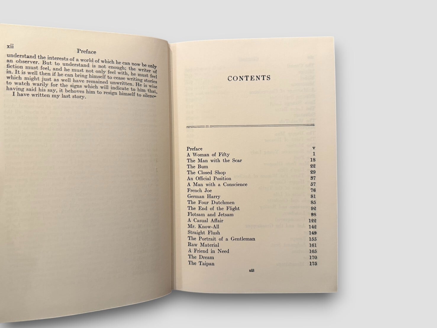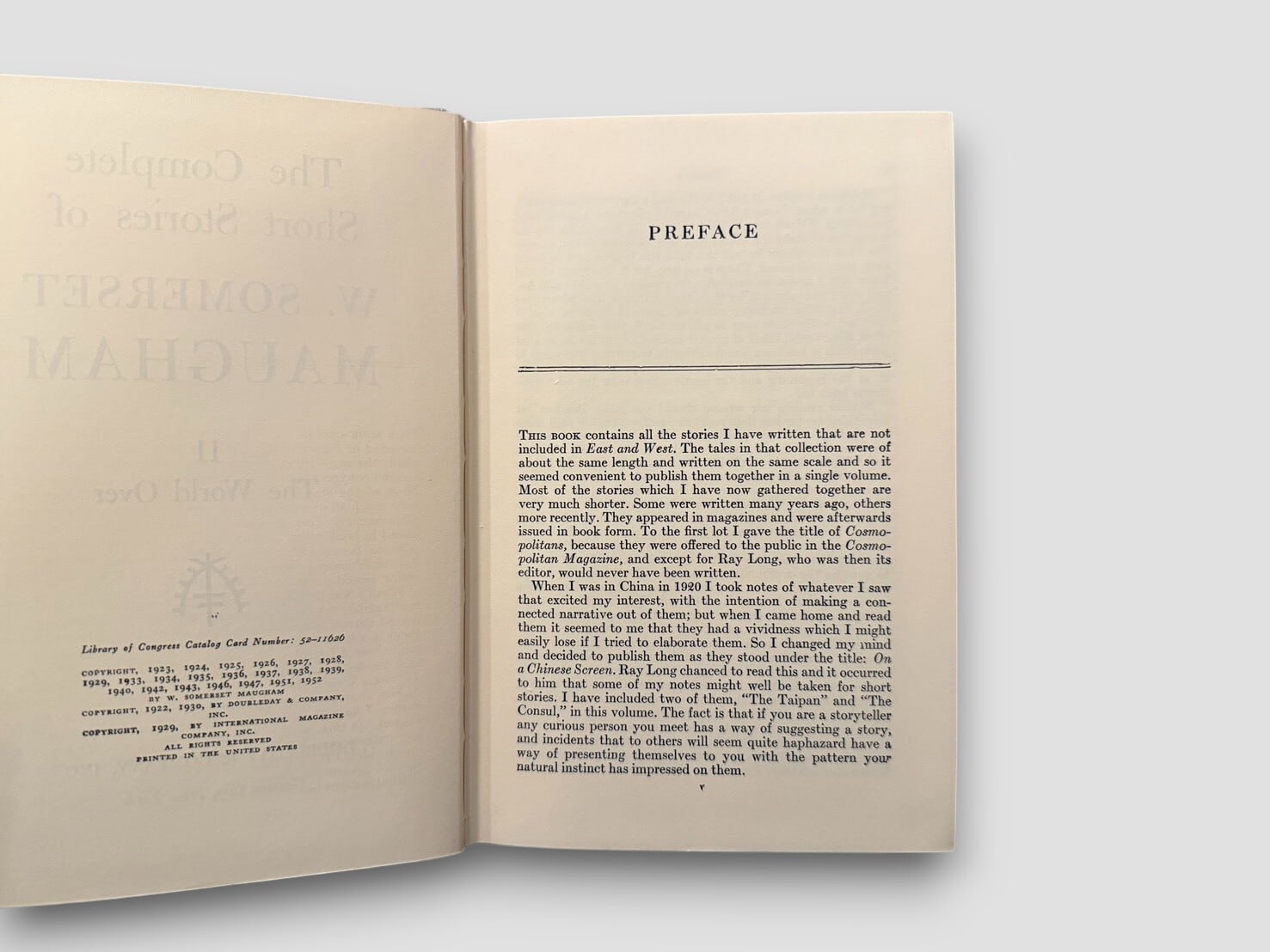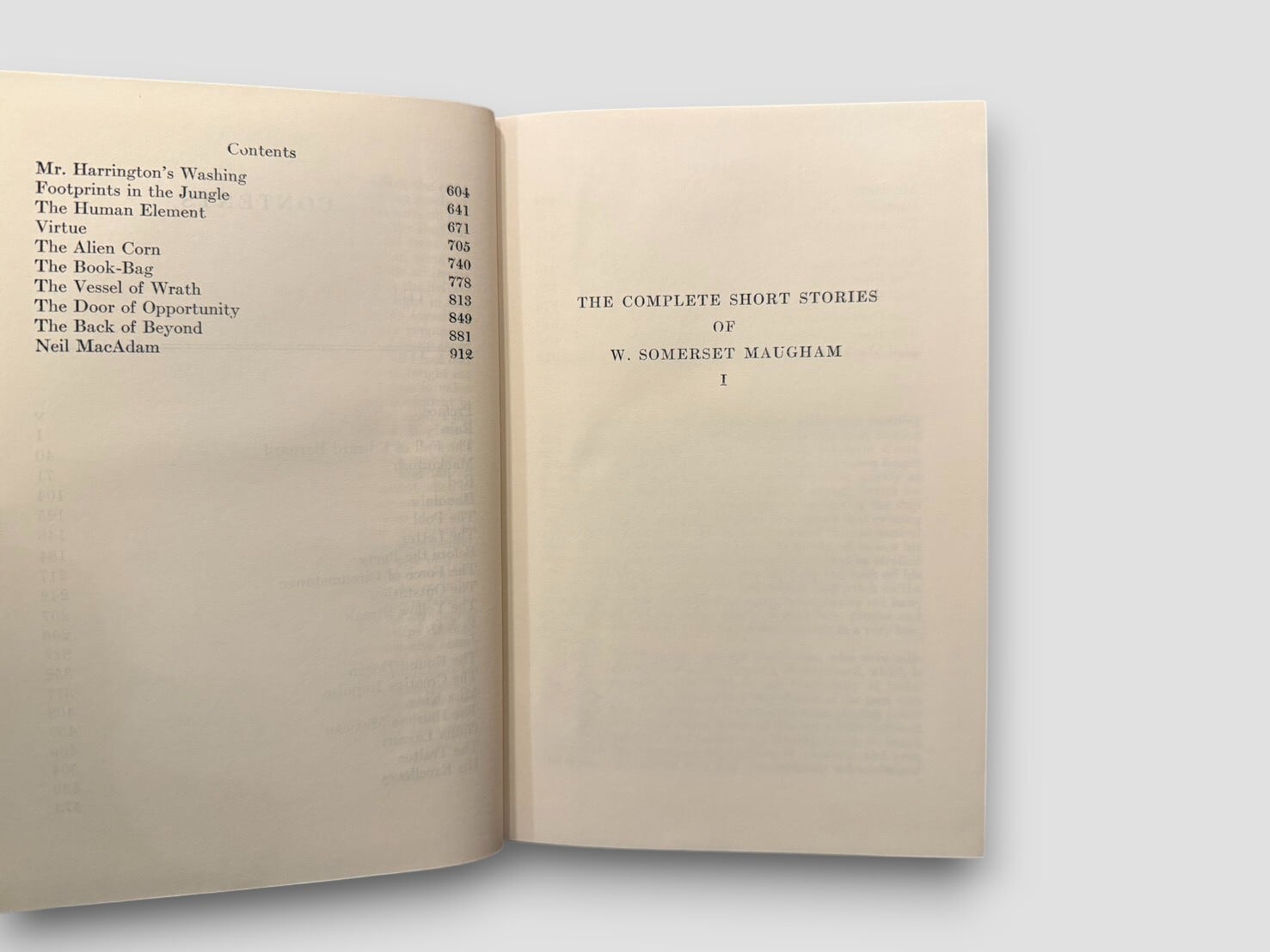 W・サマセット・モームの短篇世界を二巻に収めた Doubleday 版のセット。Volume I “East and West”、Volume II “The World Over” の構成で、モームが長い文業の中で生み出した短篇作品のほぼ全体を収めた決定版的な編集となっている。各巻の冒頭にあるモーム自身による長い序文も魅力的な、スリップケース付きの全2巻本揃。