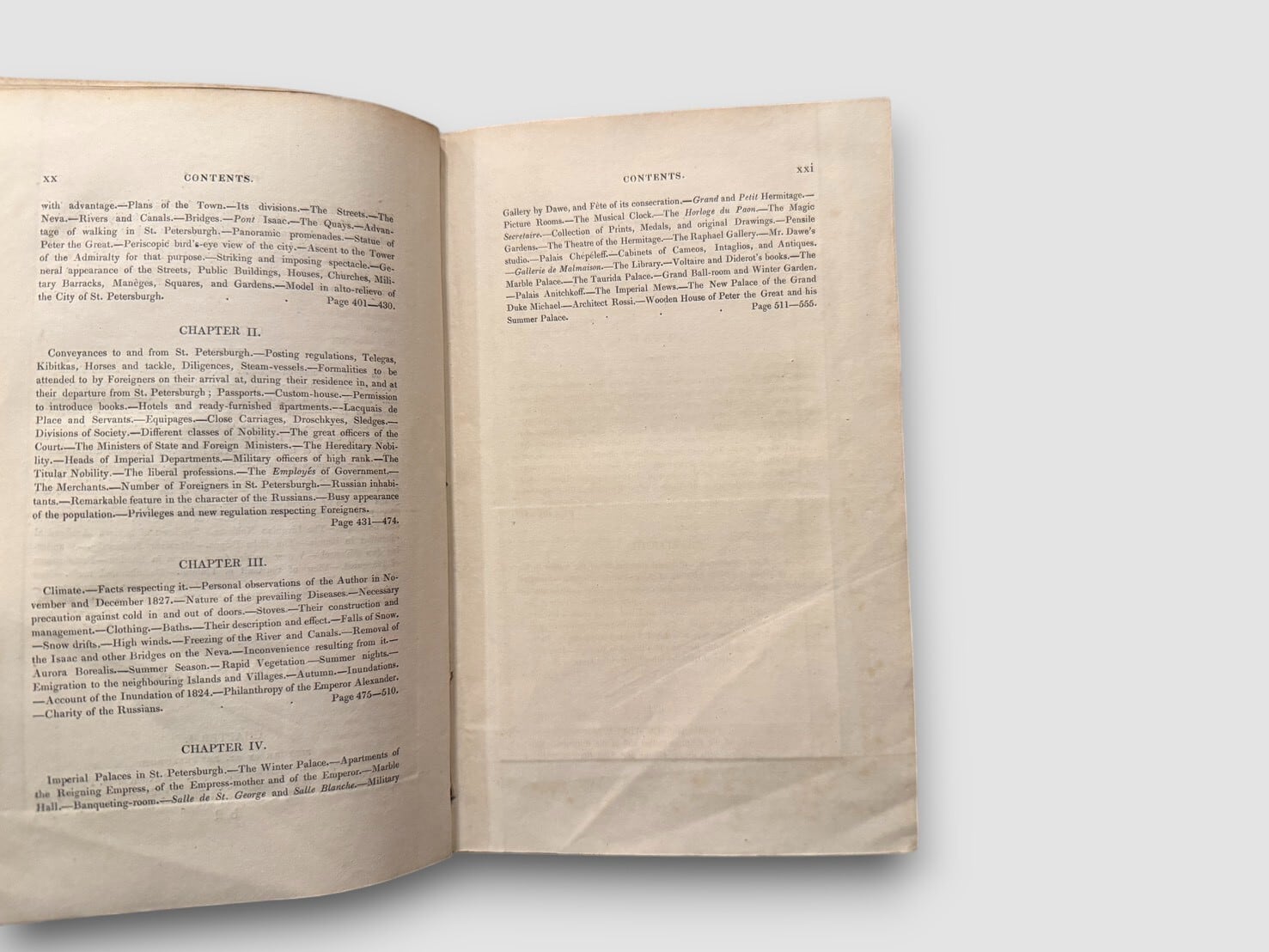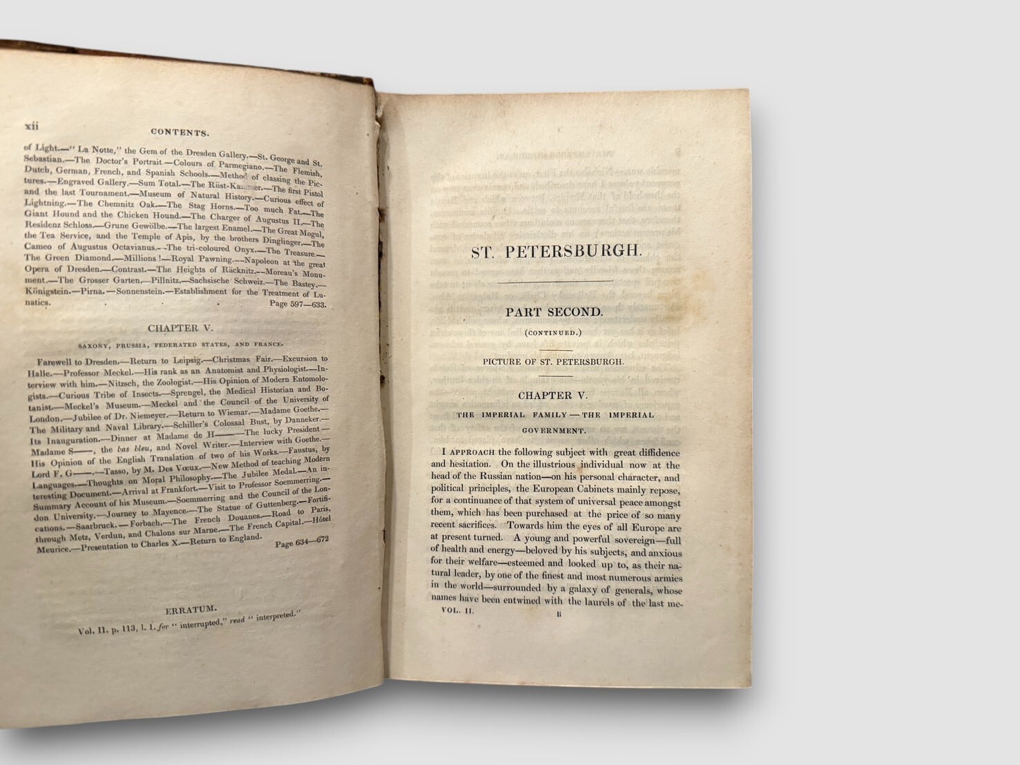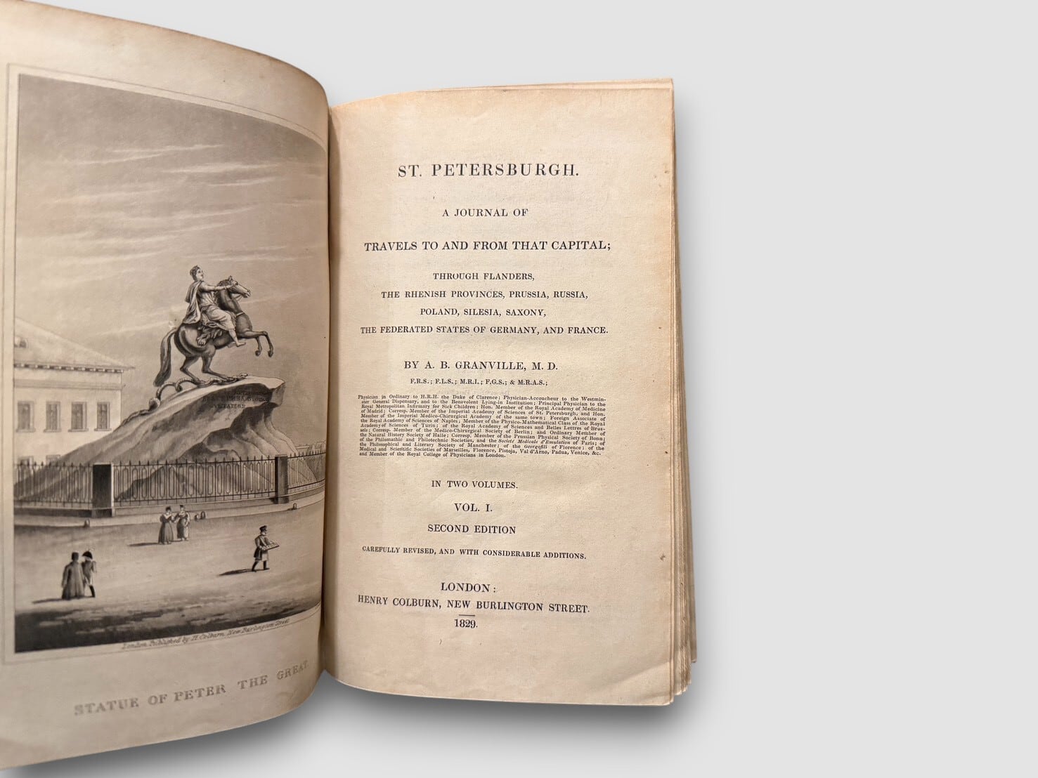 医師・旅行家として知られる A. B. Granville による、ロシア帝国の首都サンクトペテルブルクまでの旅と、同市の政治・文化・社会・科学・芸術についての詳細な観察を記した大部の旅行記。本書は 1829年刊行の第2版(Second Edition) で、初版に比べ「carefully revised, and with considerable additions」と明記されるように大幅な増補改訂が施されている。ヨーロッパ諸国を経由してロシアへ至る長大な旅の記録は、19世紀初頭の国際社会・都市文化・帝政ロシアの制度・科学教育・宮廷の様子などを多角的に描き出し、文化史・都市史・旅行文学のいずれの観点からも高い価値をもつ。全2巻本揃。