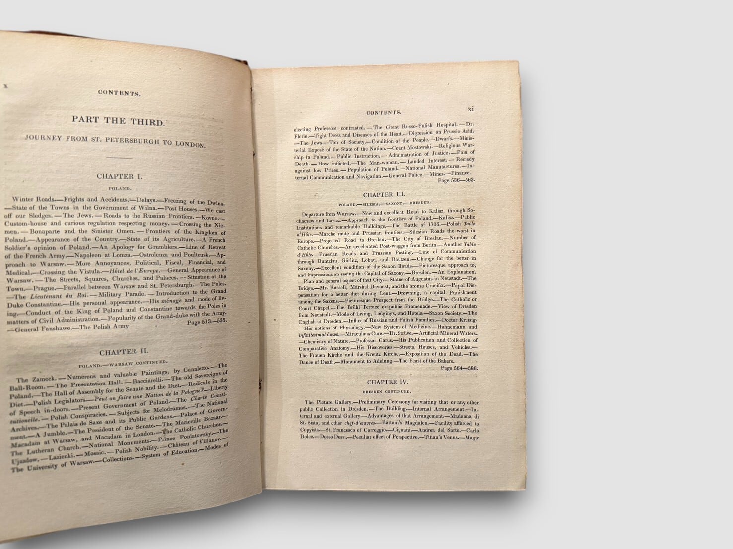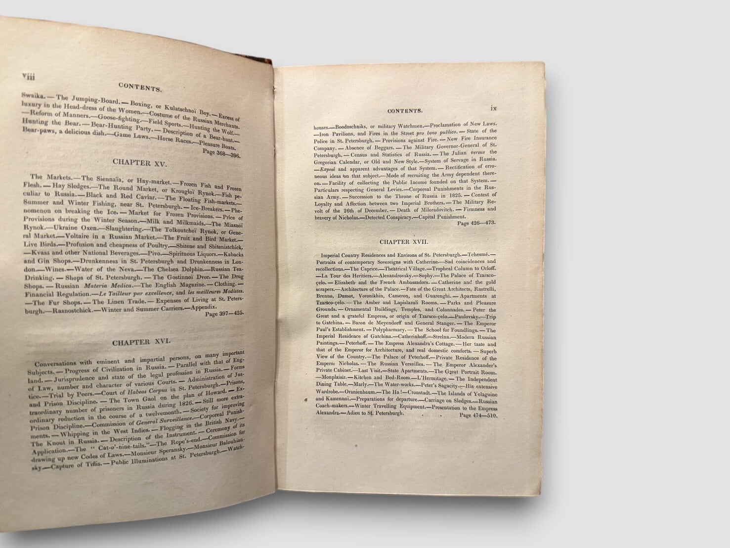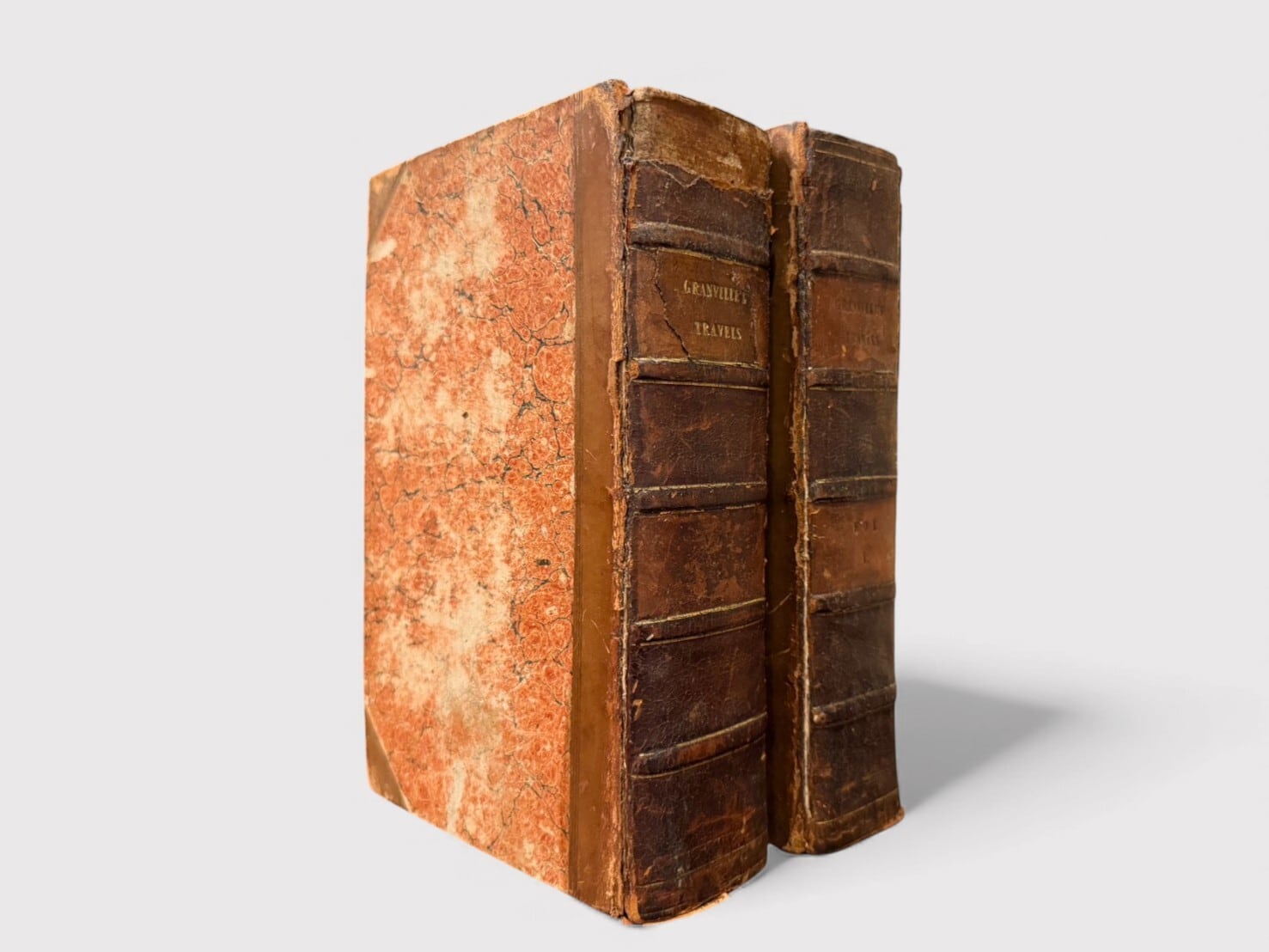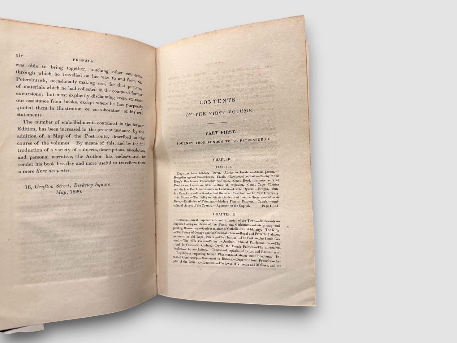 医師・旅行家として知られる A. B. Granville による、ロシア帝国の首都サンクトペテルブルクまでの旅と、同市の政治・文化・社会・科学・芸術についての詳細な観察を記した大部の旅行記。本書は 1829年刊行の第2版(Second Edition) で、初版に比べ「carefully revised, and with considerable additions」と明記されるように大幅な増補改訂が施されている。ヨーロッパ諸国を経由してロシアへ至る長大な旅の記録は、19世紀初頭の国際社会・都市文化・帝政ロシアの制度・科学教育・宮廷の様子などを多角的に描き出し、文化史・都市史・旅行文学のいずれの観点からも高い価値をもつ。全2巻本揃。