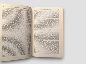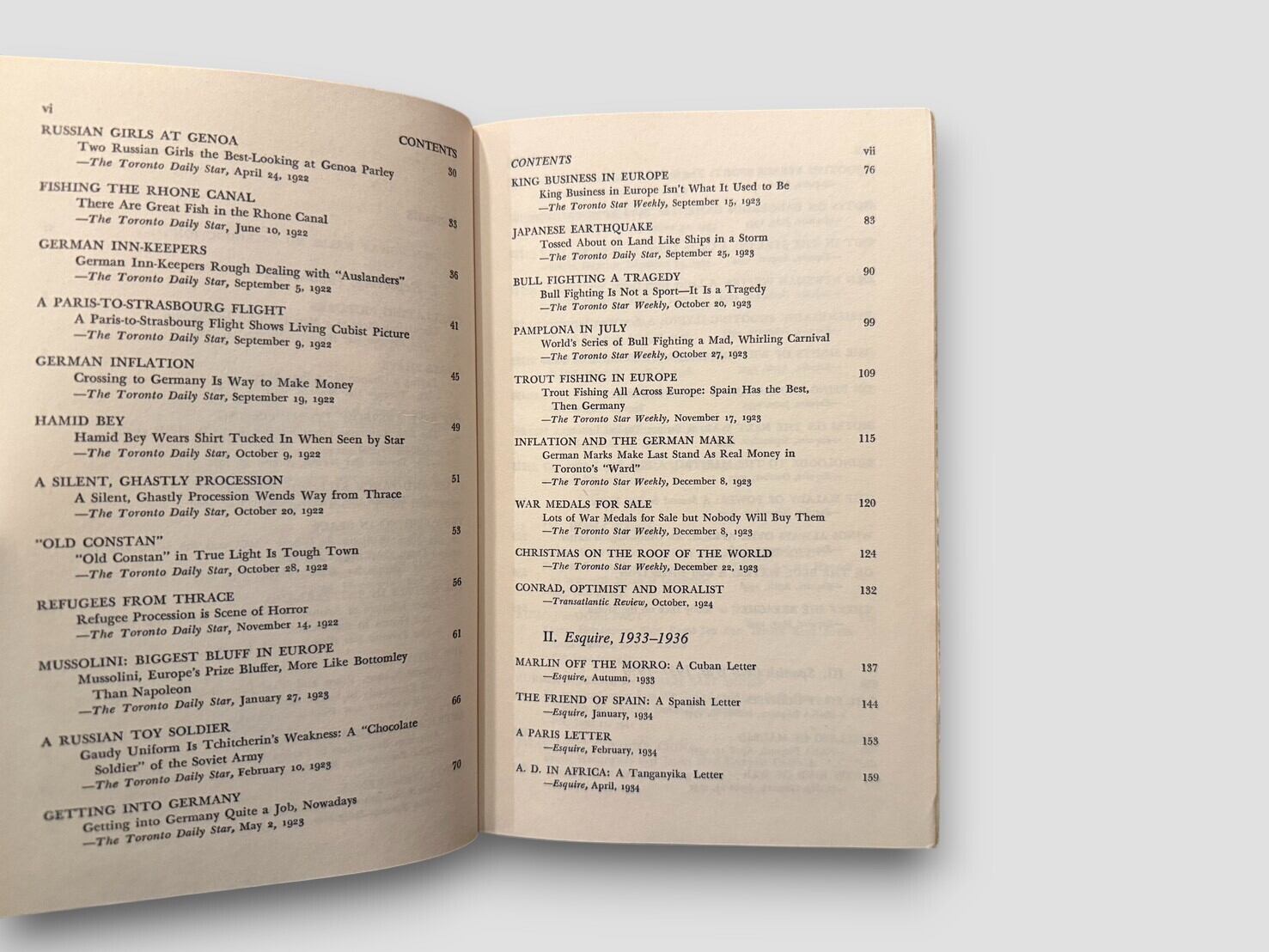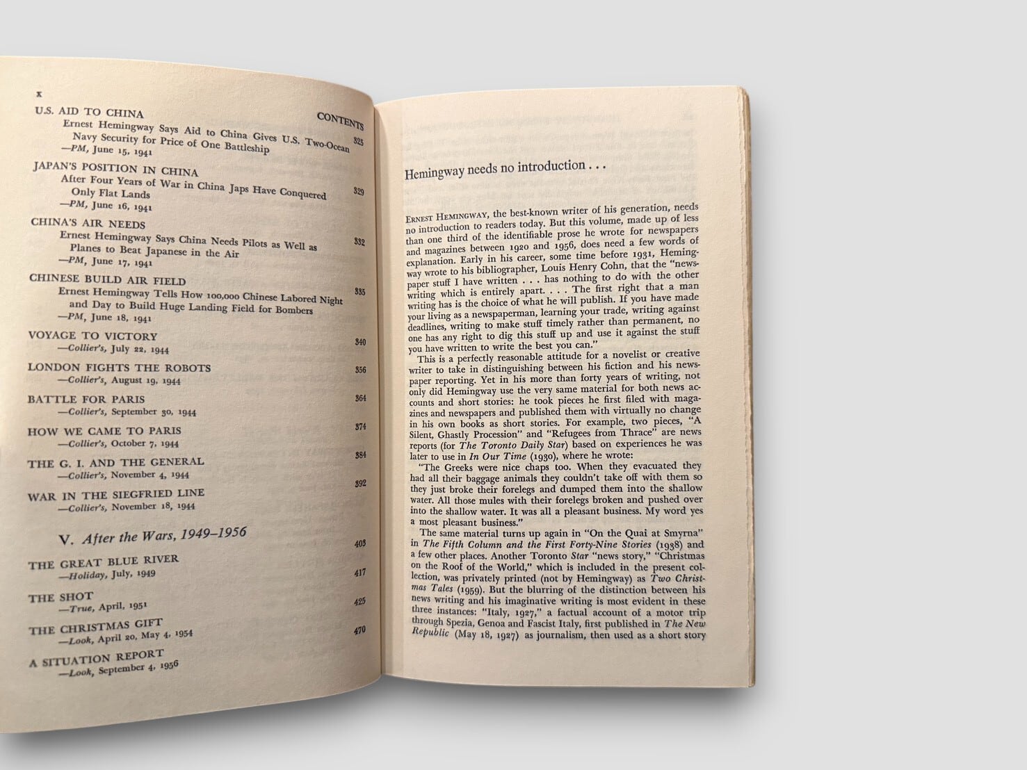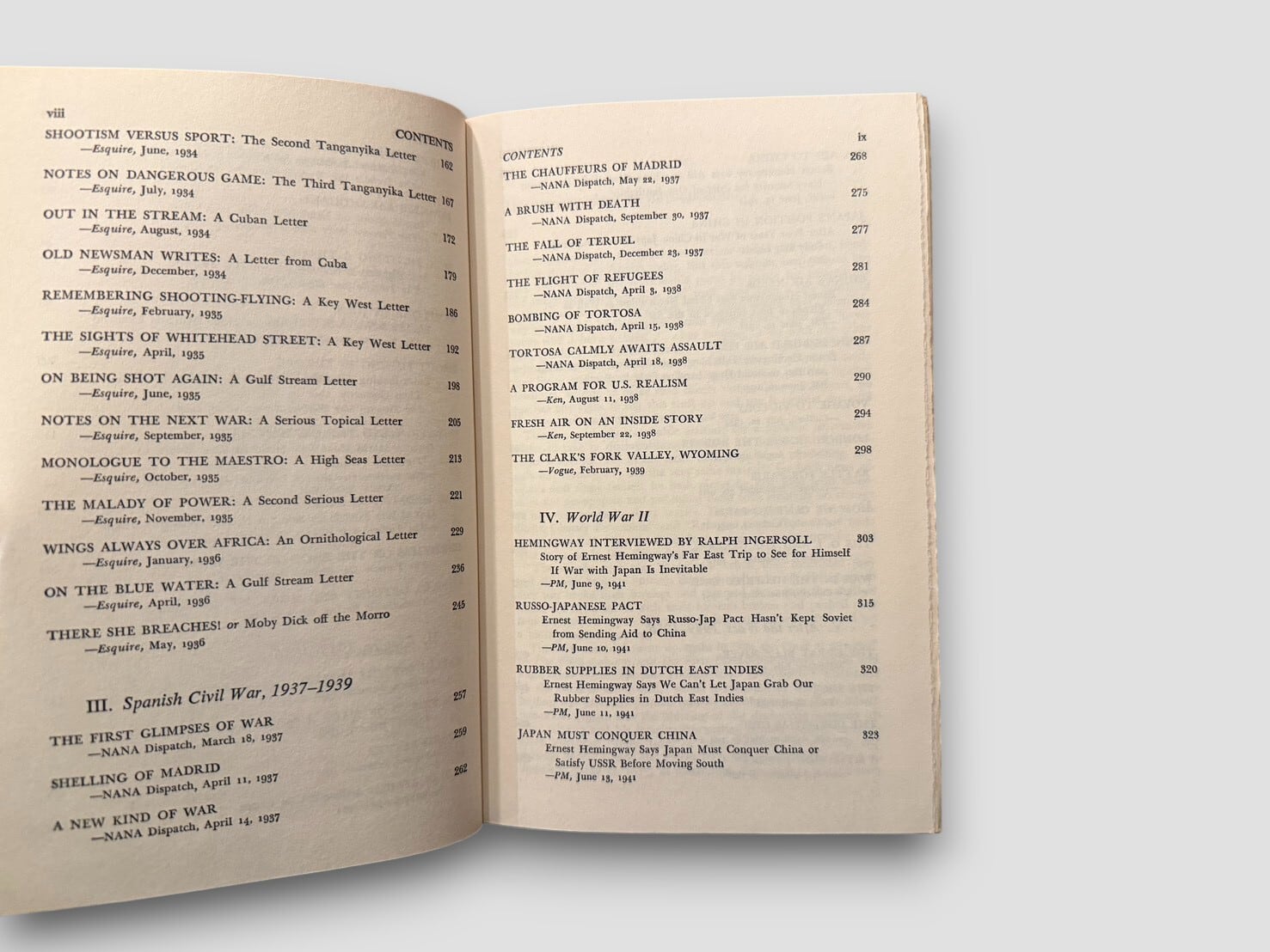 ヘミングウェイが新聞・雑誌に寄稿した記事を年代順に収めたアンソロジー。1920年代の記者時代の作品にはじまり、スペイン内戦、第二次世界大戦、欧州諸国やアフリカ、カリブ海地域での取材記事が続き、四十年近い活動の軌跡が一冊にまとめられている。国際情勢や社会状況を扱った記事も多く、文学作品とは異なる“報道人ヘミングウェイ”の姿を知る上で貴重な資料となっている。1967年初版で、オリジナルのジャケットが残る点も本書の特徴である。