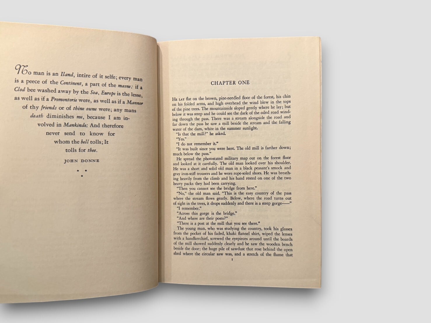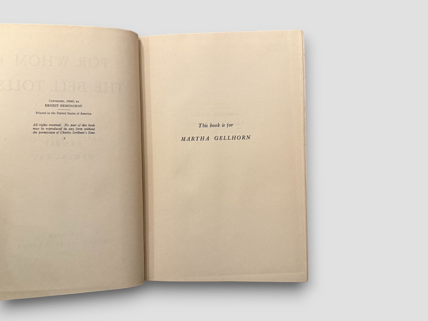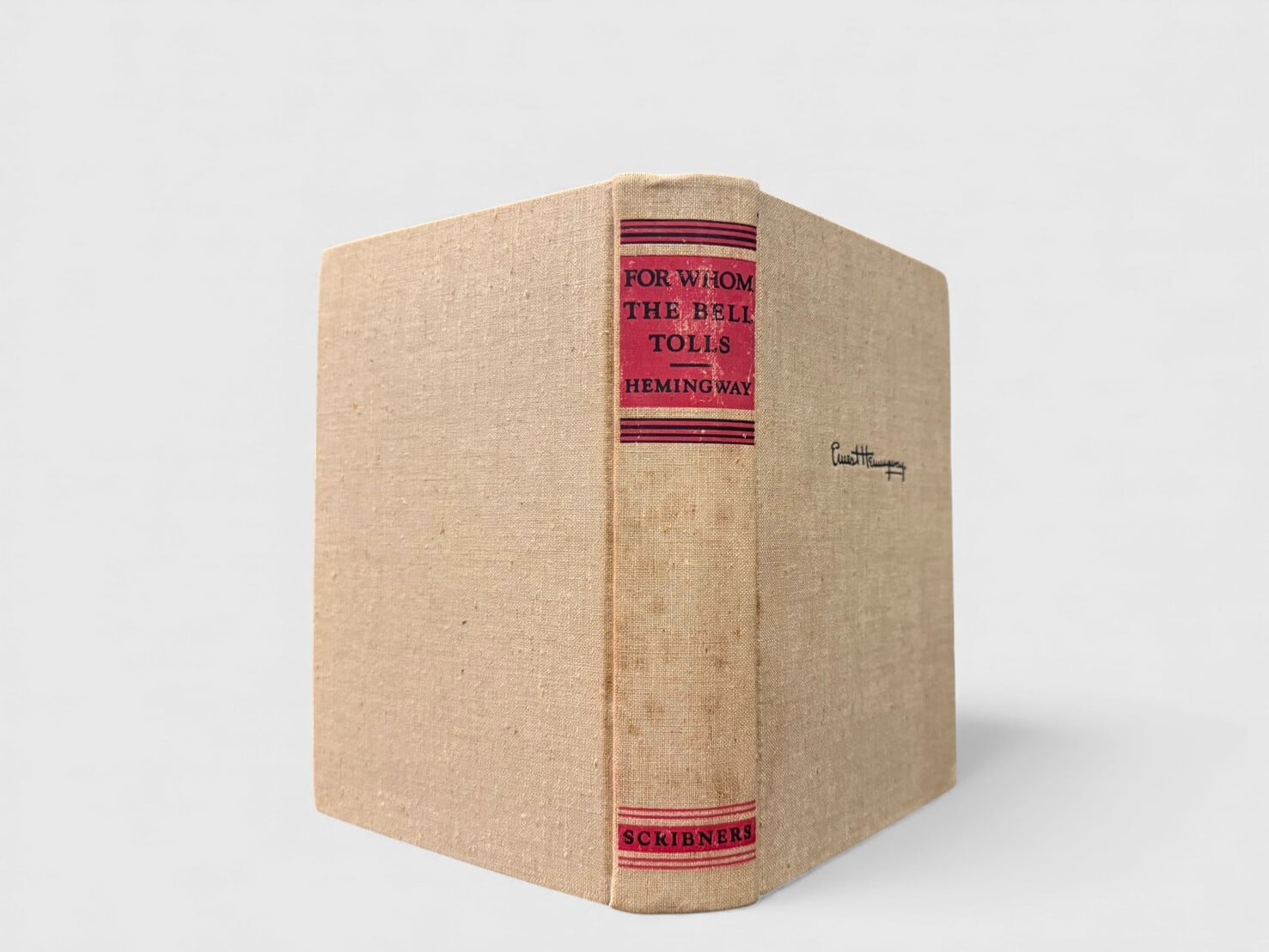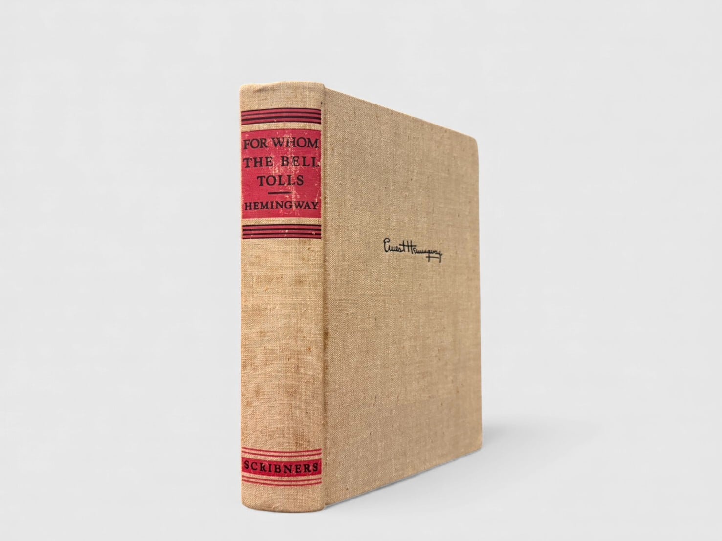 スペイン内戦を舞台に、アメリカ人義勇兵ロバート・ジョーダンの三日間を描いたヘミングウェイの代表作『誰がために鐘は鳴る』。戦時下の緊張と、そこで出会う人々の関係が物語の中心に据えられ、John Donne の有名な一節に由来する“鐘”の象徴が作品全体の背景に流れている。本書は 1940年の初版・初刷(Scribner’s “A”) にあたり、献辞ページには Martha Gellhorn の名が記されている。オリジナルジャケットは欠けているが、当時の仕様であるベージュクロス装丁と赤黒の背デザインが残されている貴重な1冊。