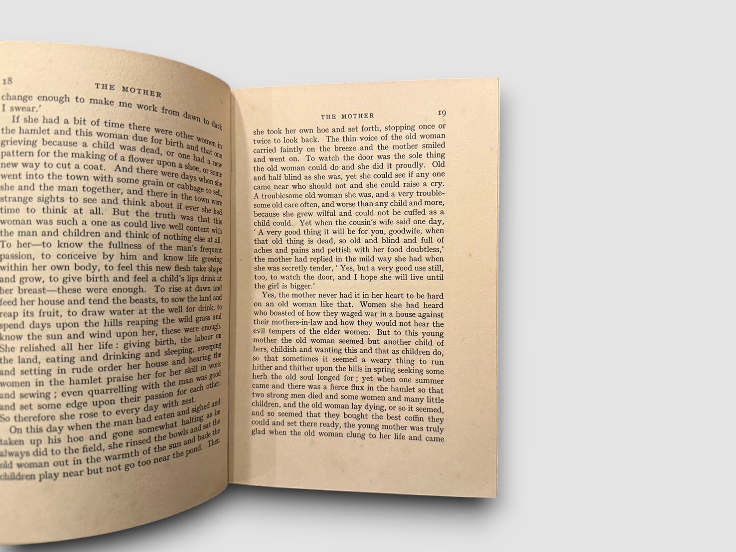 アメリカの小説家パール・S・バックによる、中国農村の日常を背景に、家族の営みと生活の厳しさを描いた作品。主人公である母親を中心に、農村社会の暮らしや人々の関係が淡々と描写されており、パールが繰り返し扱ってきたテーマに通じる内容となっている。本書は 1934年に英国で刊行された初版。
