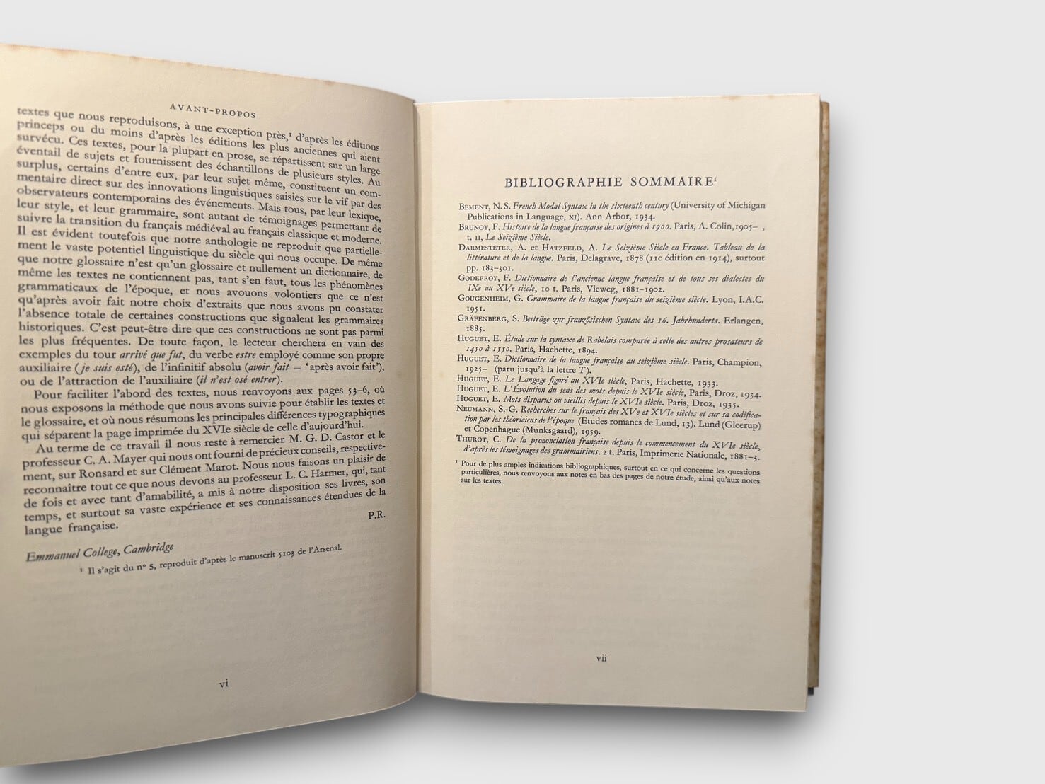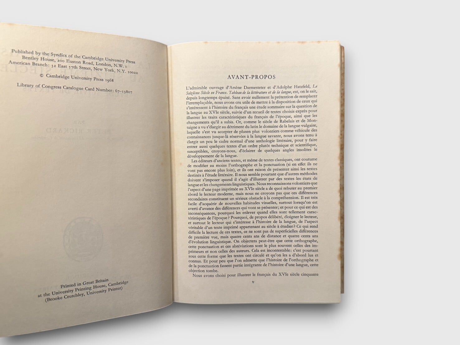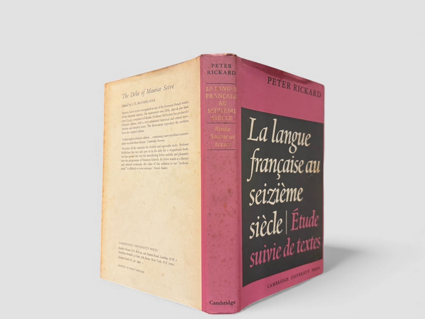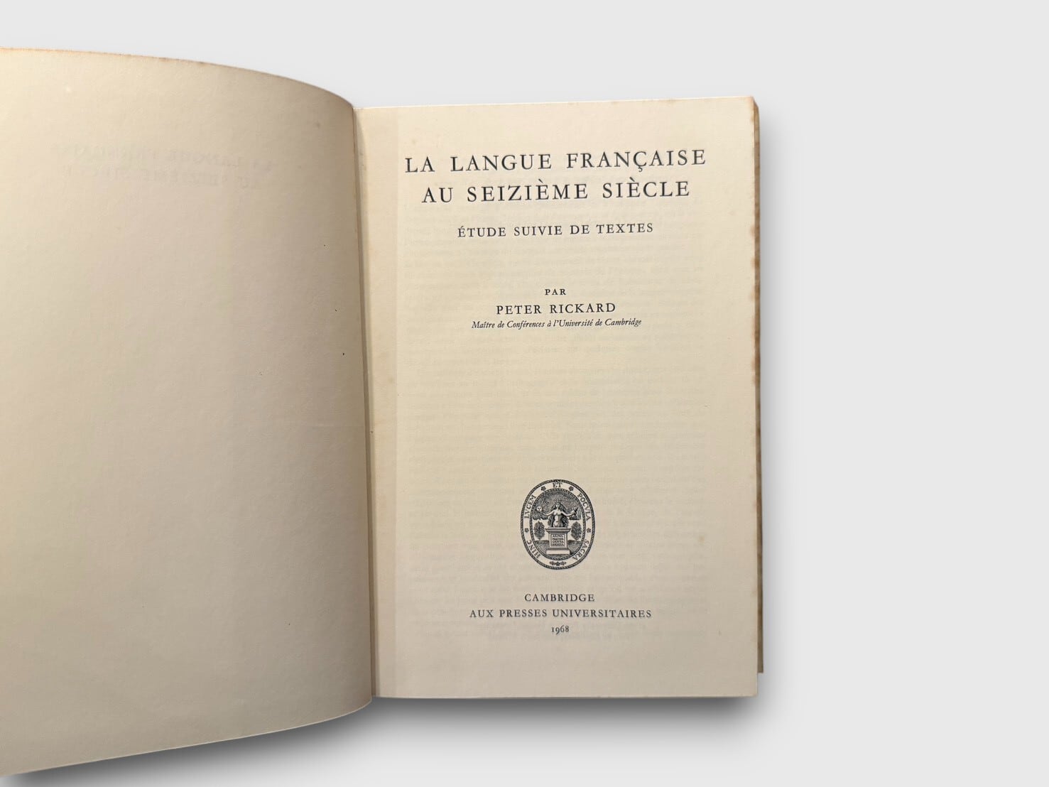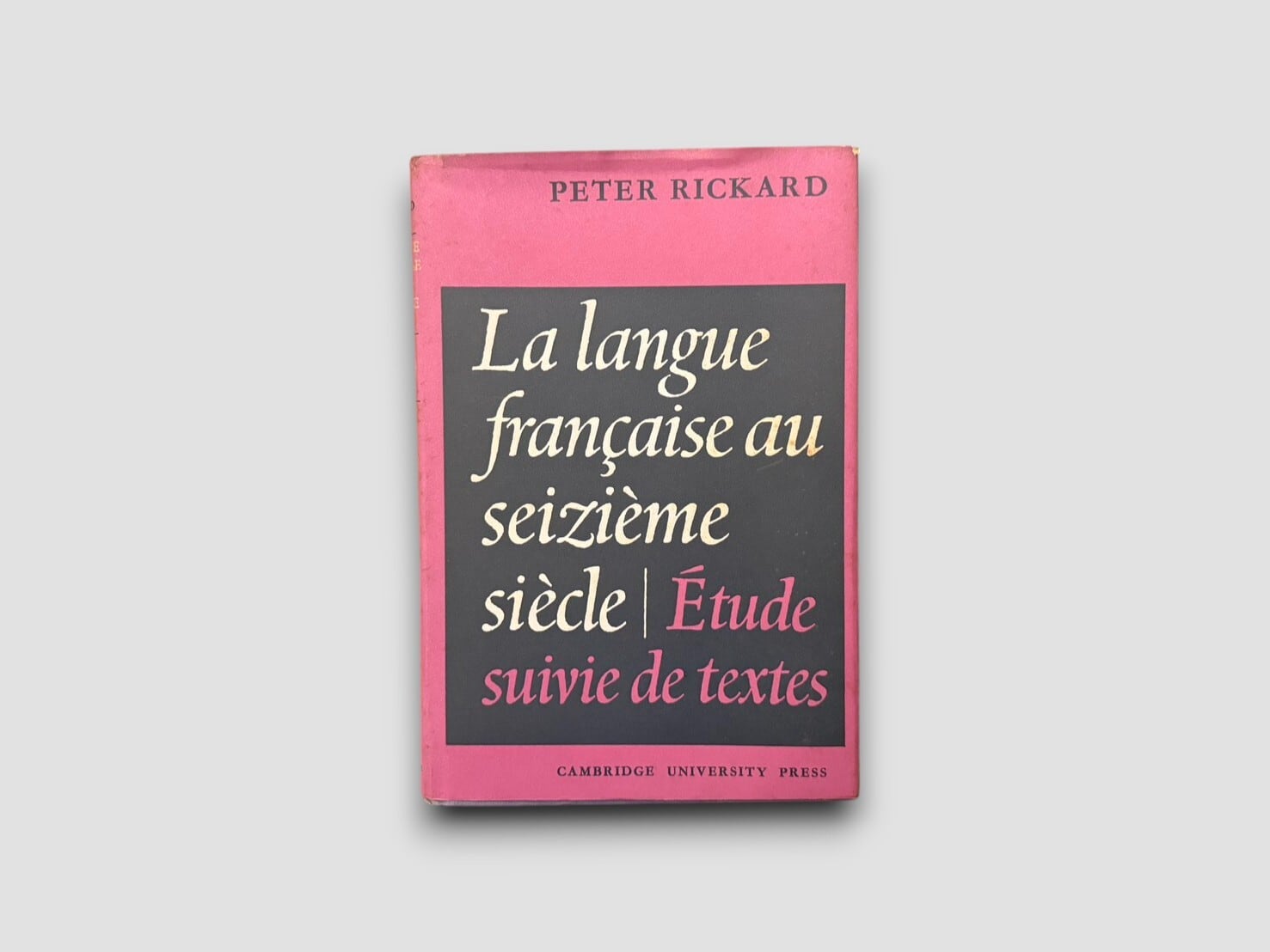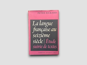 フランス語が大きく変化した 16世紀(seizième siècle) の言語的特徴を整理した研究篇と、その時代の実例を収めたテキスト篇から成る、フランス語史研究の基礎文献書。著者 Peter Rickard は、ケンブリッジ大学で長く教鞭をとった仏語史・文献学の研究者で、本書はその知見を簡潔かつ明晰なかたちで示した一冊となっている。フランス語史・ルネサンス期の文化・文献研究に関心をもつ方にとって信頼できる基礎資料である。1968年刊行初版。