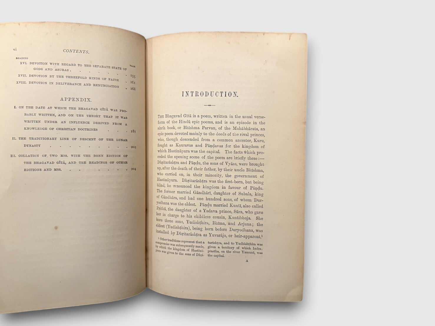 『バガヴァッド・ギーター(Bhagavad Gītā)』は、インド叙事詩『マハーバーラタ』の一部を成すサンスクリット哲学詩である。本書は、ジョン・デイヴィズによる英訳および注釈を収録しており、Trübner’s Oriental Series の一冊として刊行された。本文に加え、付録(Appendix)には、『バガヴァッド・ギーター』の成立時期に関する考察や、本文伝承に関わる諸資料の比較についての記述が含まれている。1893年刊行第3版。