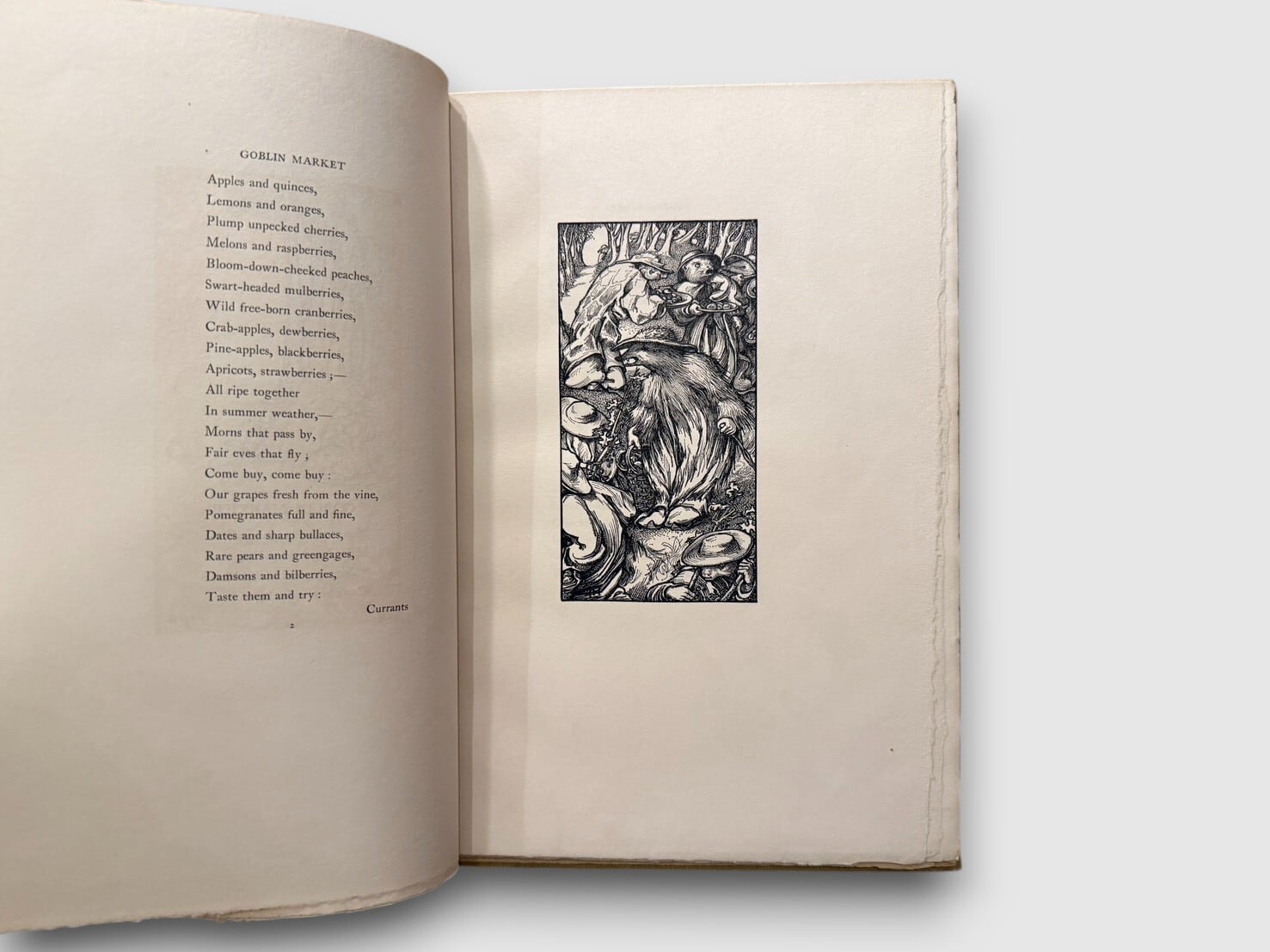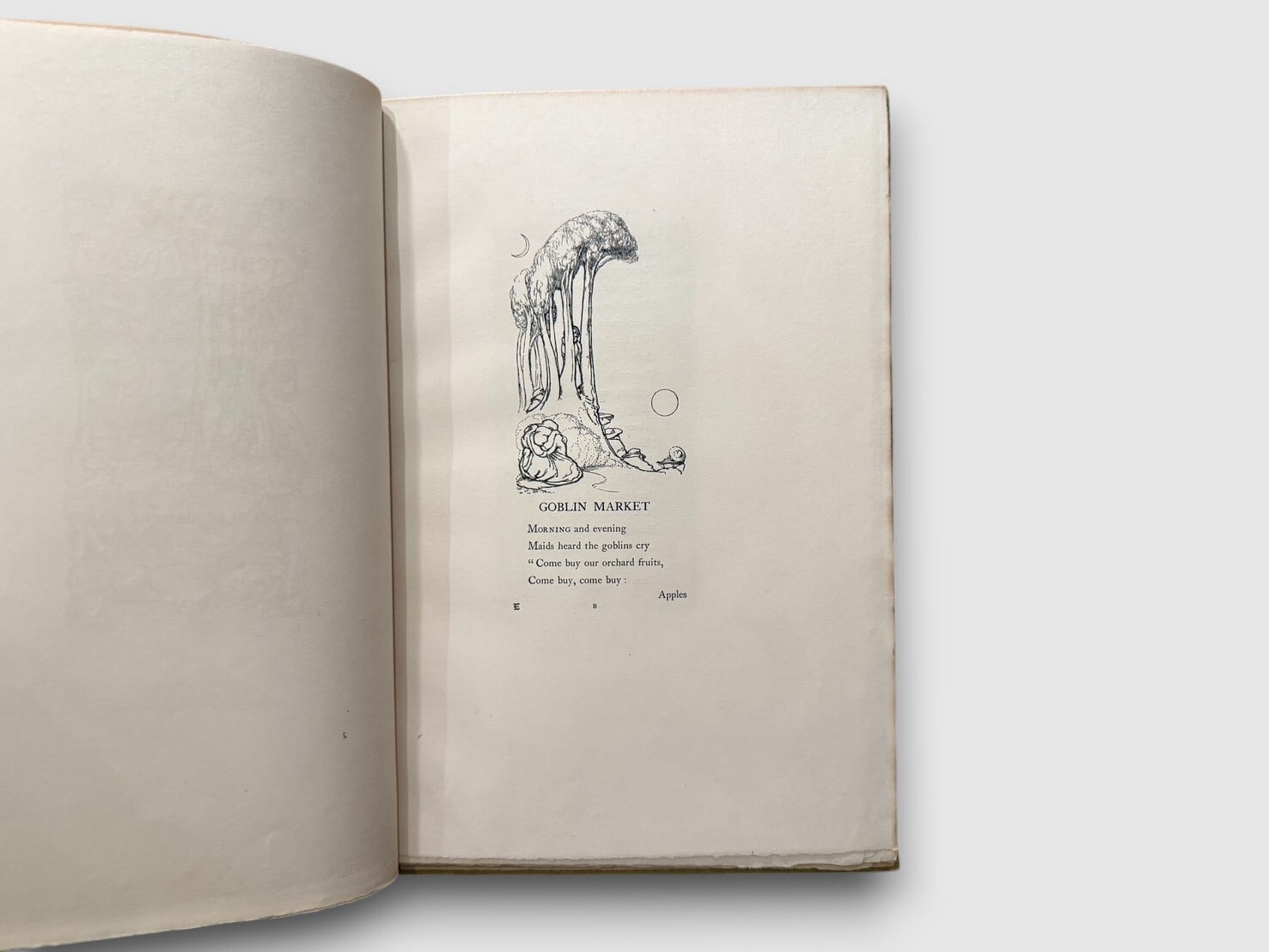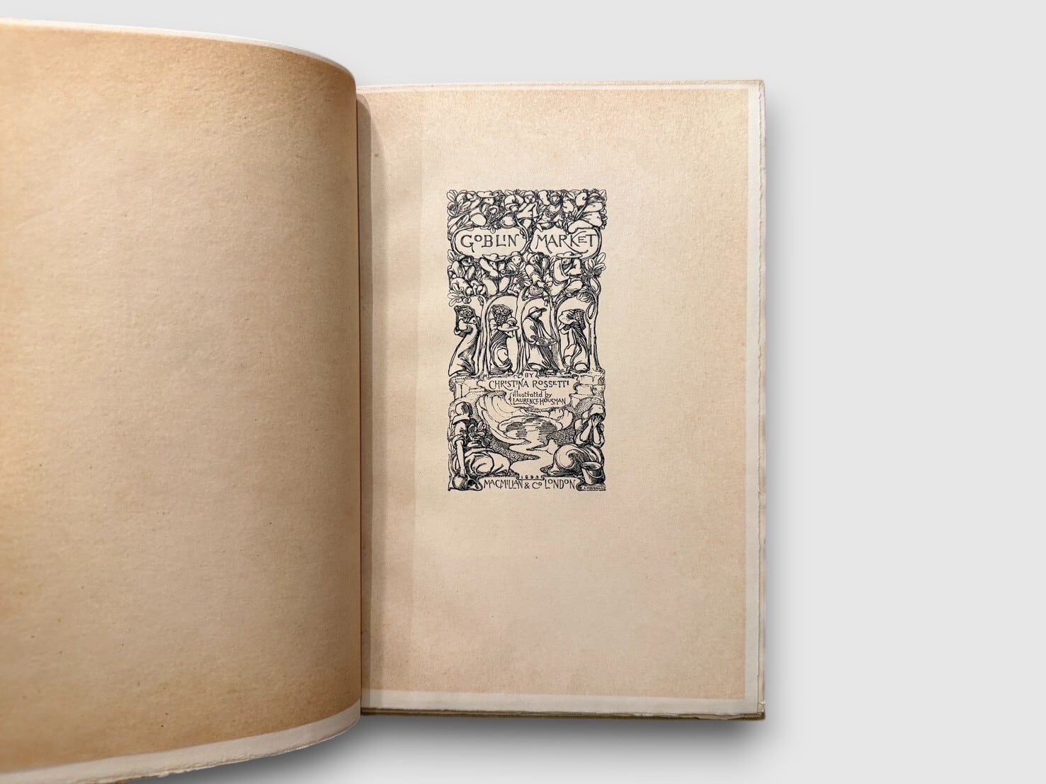 クリスティーナ・ロセッティの代表作として知られる物語詩『ゴブリン・マーケット』。幻想的で甘美、しかしどこか不穏な市場を舞台に、姉妹の絆、誘惑、そして救済を描いた本作は、ヴィクトリア朝文学のなかでも特異な位置を占める作品である。挿絵を手がけたのはローレンス・ハウスマン。装飾的で象徴性の高い図像は、詩のもつ妖しさと緊張感を視覚的に補完し、本文と静かに響き合っている。本書は、1893年12月に刷られたラージ・ペーパー・エディション。「One hundred and sixty copies of this large paper edition were printed」と明記されており、限定160部刷の特別仕様であることが確認できる。文学作品としてのみならず、挿絵本・限定本としても確かな魅力を備えた特別な1冊。