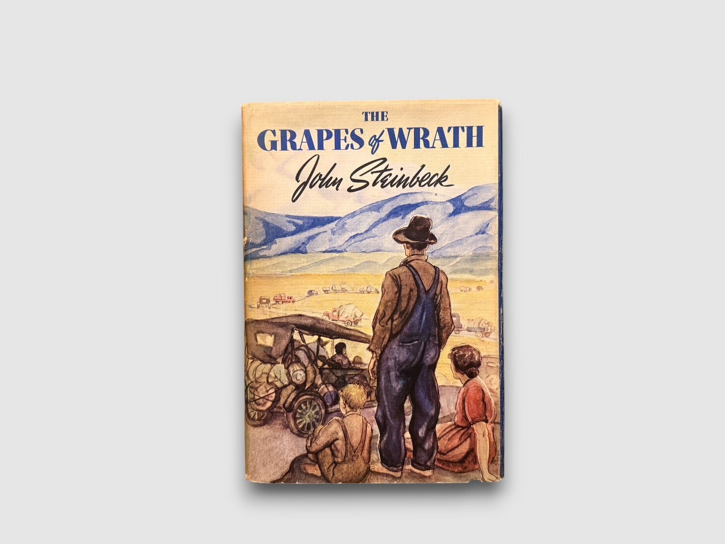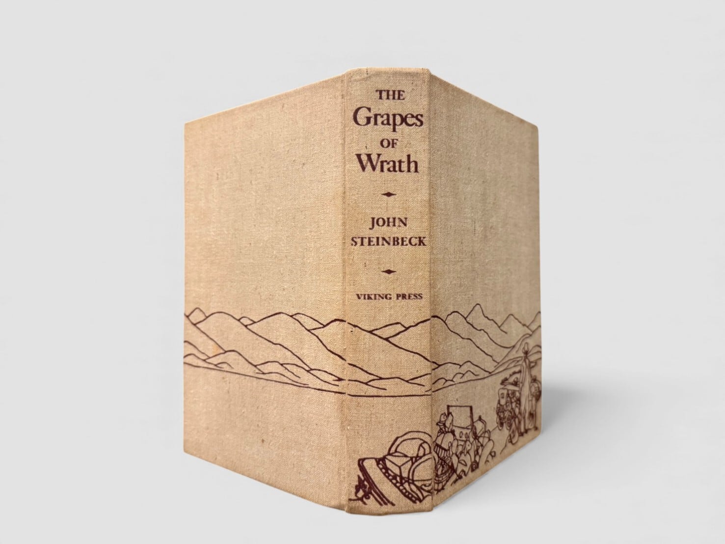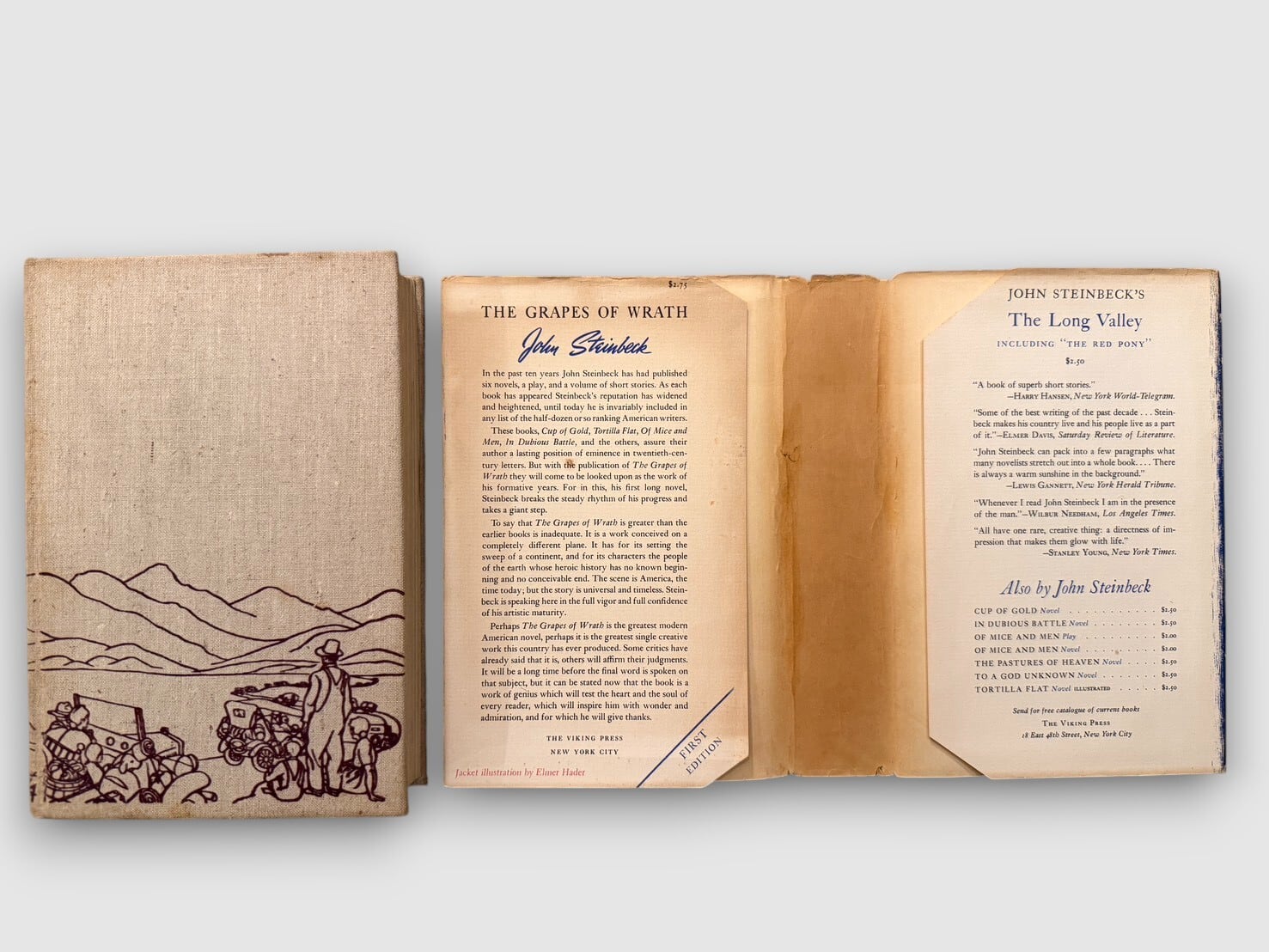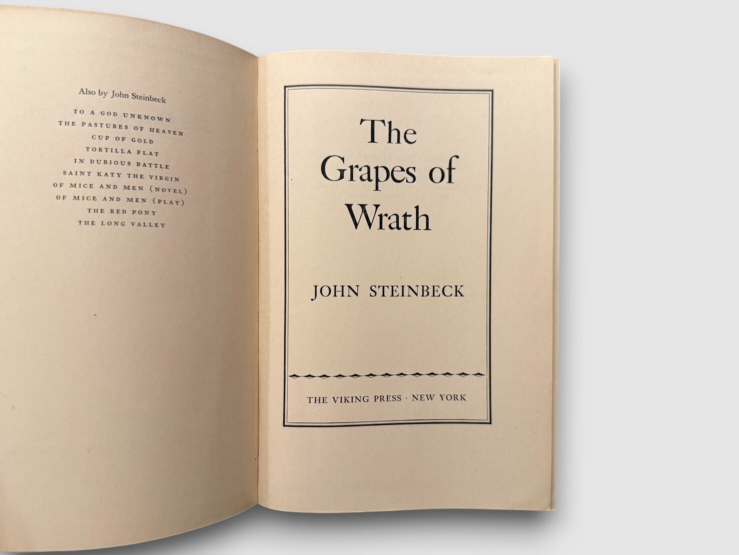 ジョン・スタインベックが1939年に発表した長編小説『怒りの葡萄』。アメリカ大恐慌期を背景に、オクラホマからカリフォルニアへと移動する一家の歩みを描いた作品として知られている。本書は1939年にニューヨークの The Viking Press から刊行された初版・初刷。copyrightページには “Copyright, 1939, by John Steinbeck” および “First published in April 1939” の記載が確認できる。献辞ページには “To Carol who willed it. To Tom who lived it.” と印刷されている。ジャケット付きの非常に貴重な初版。