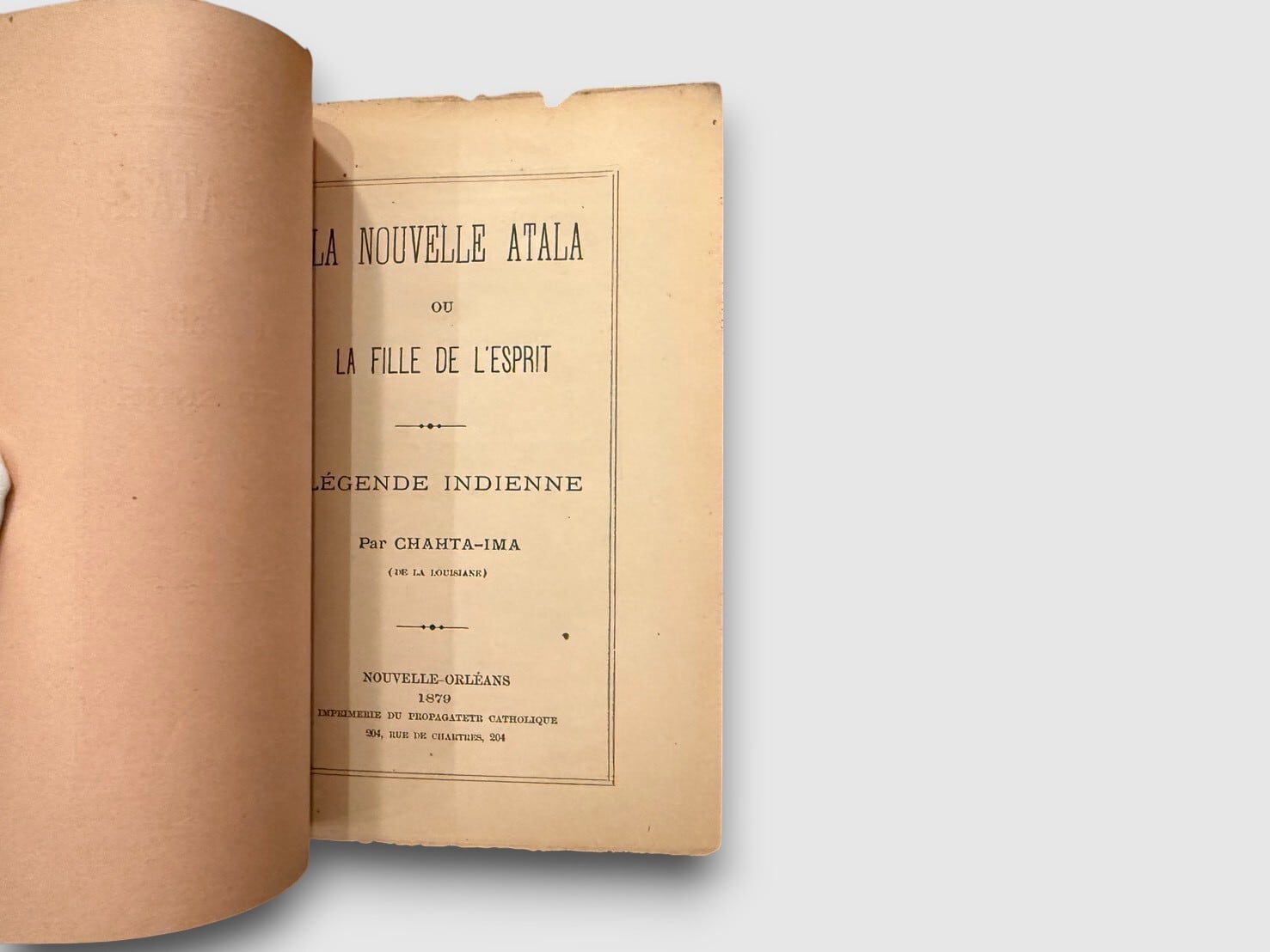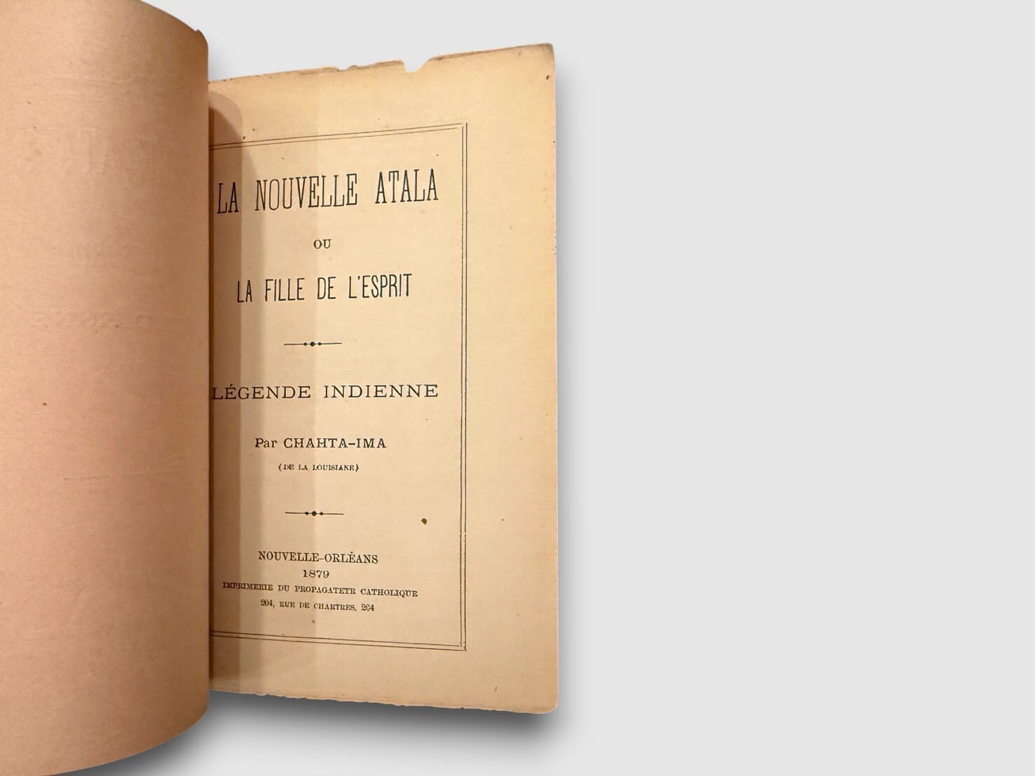 ラフカディオ・ハーンが Chacta-Ima(チャクタ・イマ) の名で発表した、1870年代ニューオーリンズ時代の初期フランス語作品。本作は「Légende Indienne(インディアン伝説)」と銘打たれ、北米先住民世界を題材とした物語形式をとりながら、精神性や信仰観を主軸とした独自の文学世界を描いている。1879年、ニューオーリンズの Imprimerie du Propagateur Catholique にて刊行された本書は、ハーンの文章が書籍の形で刊行された最初期の作品として知れ、後年の英語作品群へとつながる文学的出発点を示す重要な位置を占めている。ハーン文学の形成過程をたどるうえで欠かすことのできない、希少かつ象徴的な一冊。