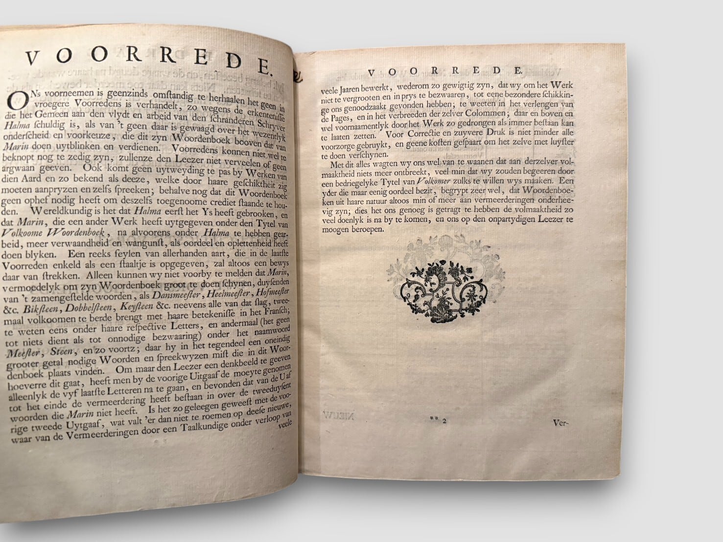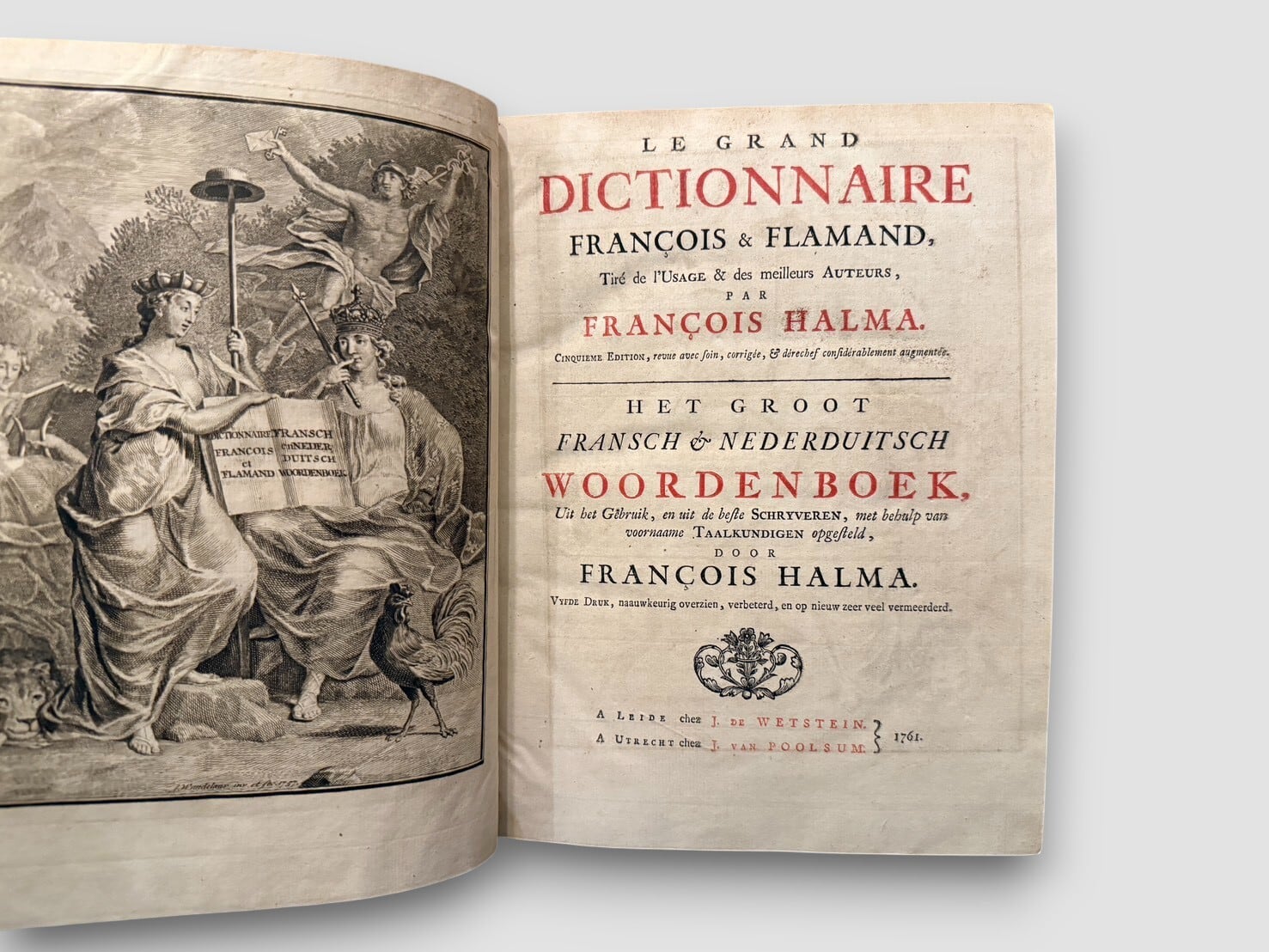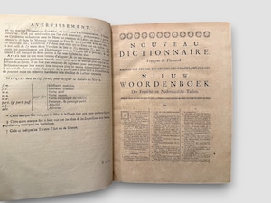 18世紀オランダで活動した辞書編纂者・言語学者のFrancois Halma によって編まれた本書は、扉に「Tire de l’Usage & des meilleurs Auteurs(用法と優れた著者の用例に基づく)」と明記されており、実際の用例と権威ある著者の語法を重視する編集方針を掲げている。本セットは全2巻からなり、第2巻は1758年、第1巻は1761年に、ライデンの Jacob de Wetstein およびユトレヒトの Jacob van Poolsum から刊行された。各巻には精緻な銅版画フロントピースが配され、実用書でありながら造本上の意匠も高い完成度を備えている。18世紀ヨーロッパにおける辞書編纂、言語接触、出版文化を具体的に伝える資料として、語学史・辞書史の両面から評価される一組といえるだろう。