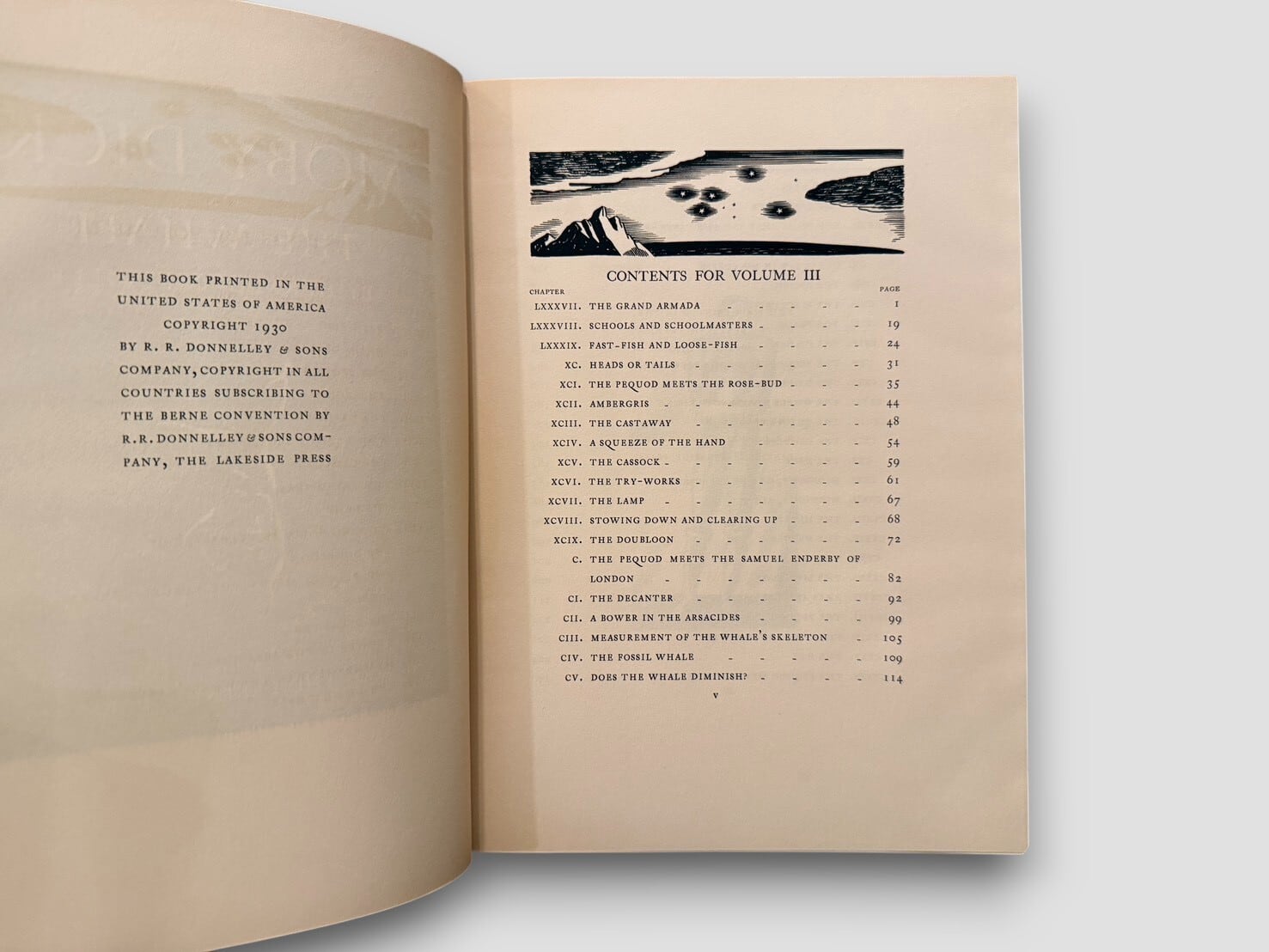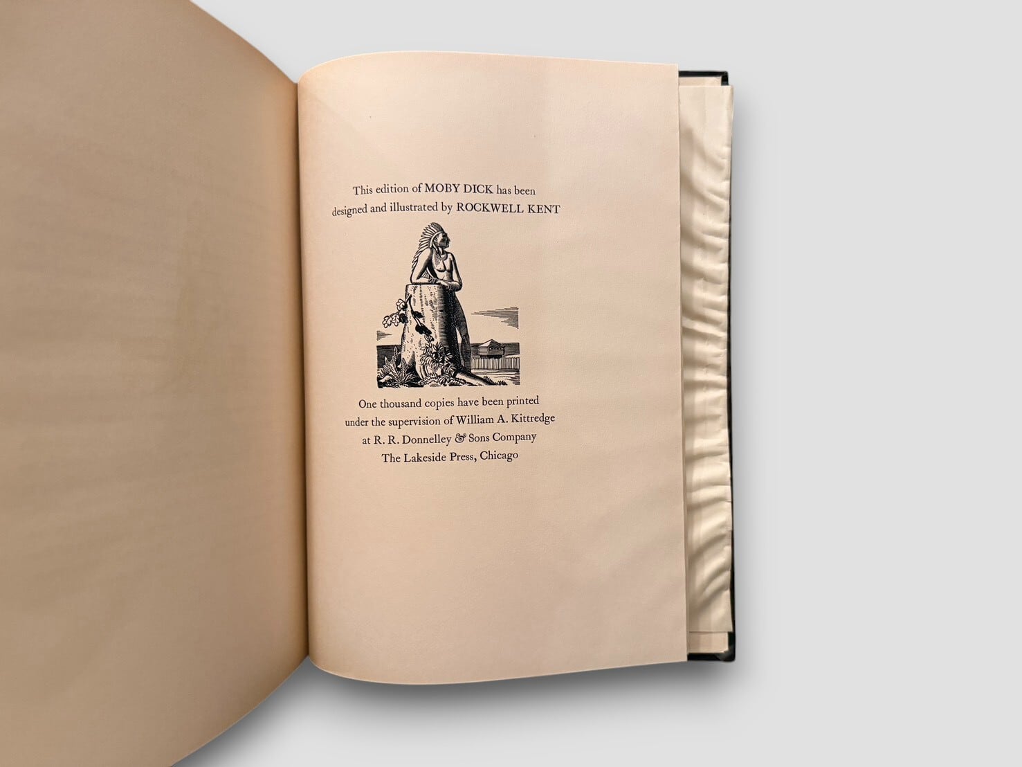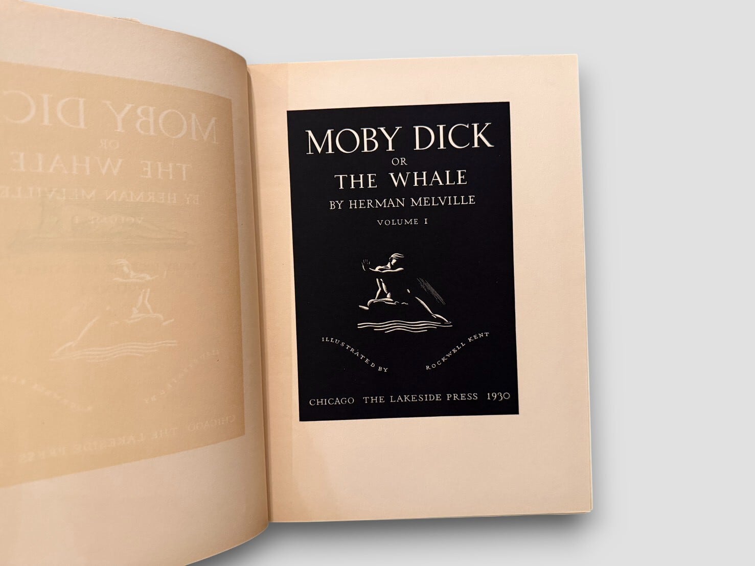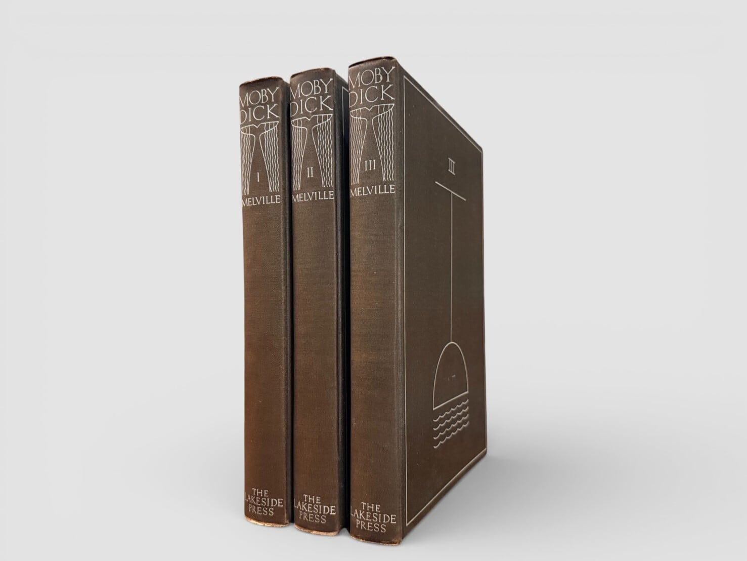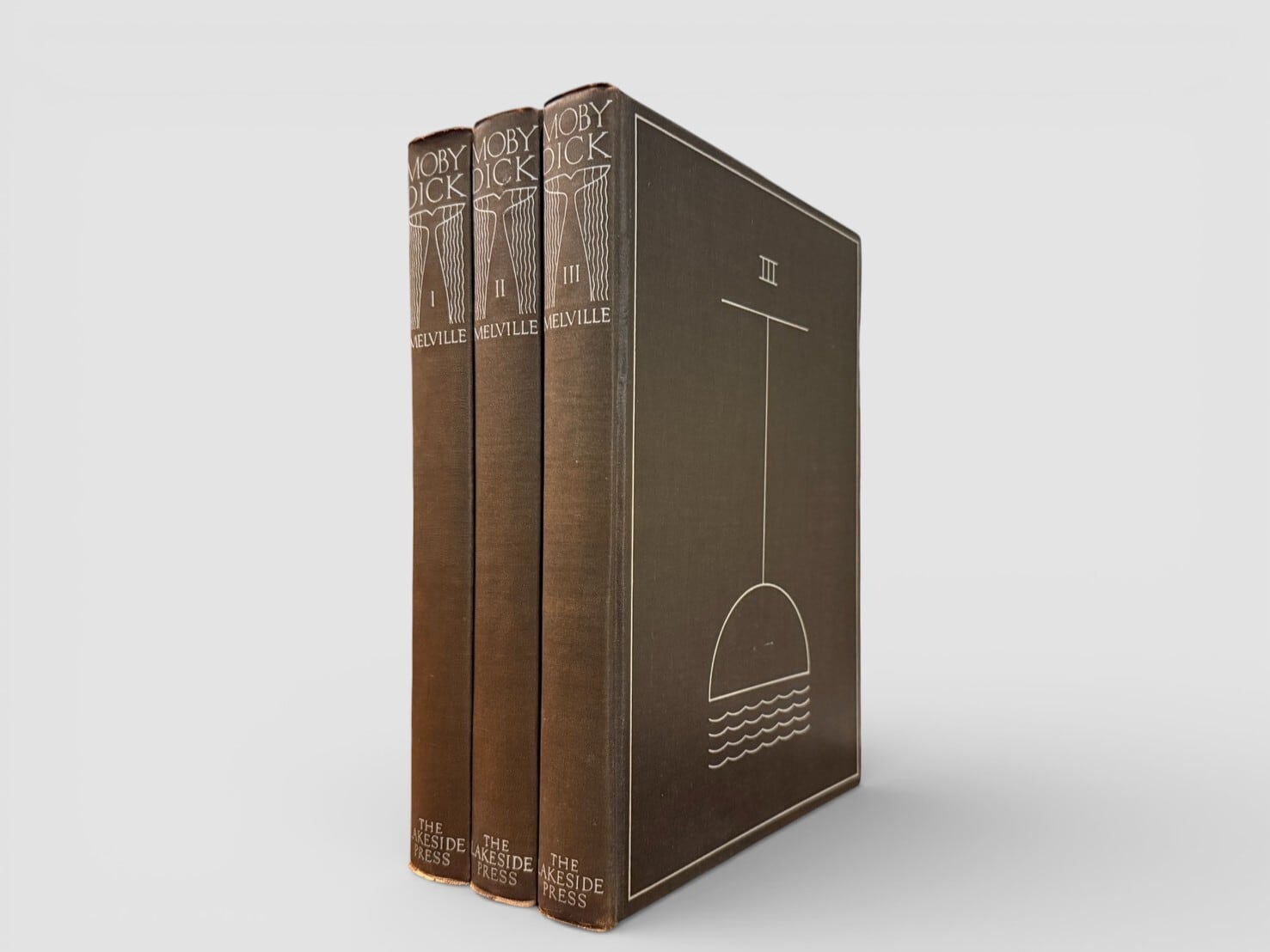 ハーマン・メルヴィルの代表作『白鯨(Moby-Dick)』をロックウェル・ケントの挿絵によって視覚的に再構築した、20世紀アメリカ書物芸術を代表する挿絵本のひとつ。本書は1930年にシカゴの The Lakeside Press により刊行された三巻本で、ロックウェル・ケントが挿絵および造本設計に深く関与した『白鯨』の最初のエディションである。限定1,000部印刷・特装限定版。貴重なセット。