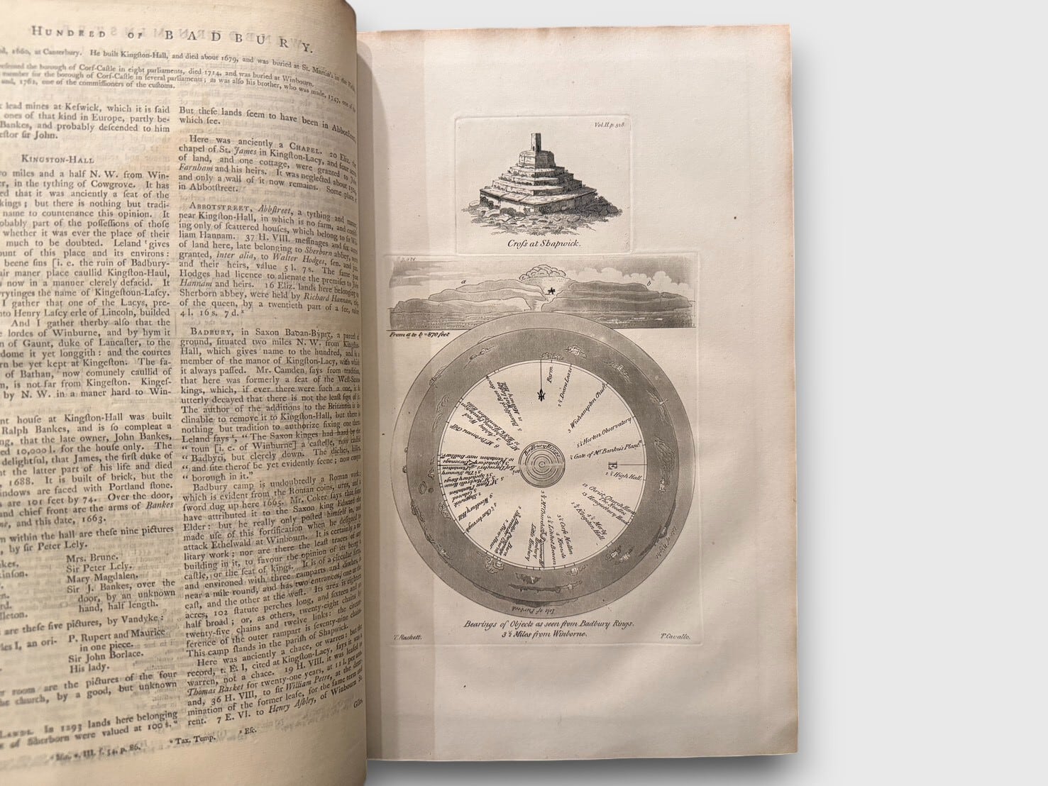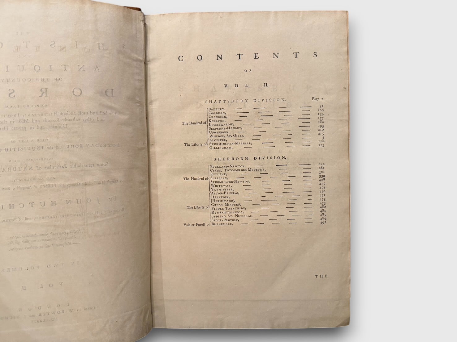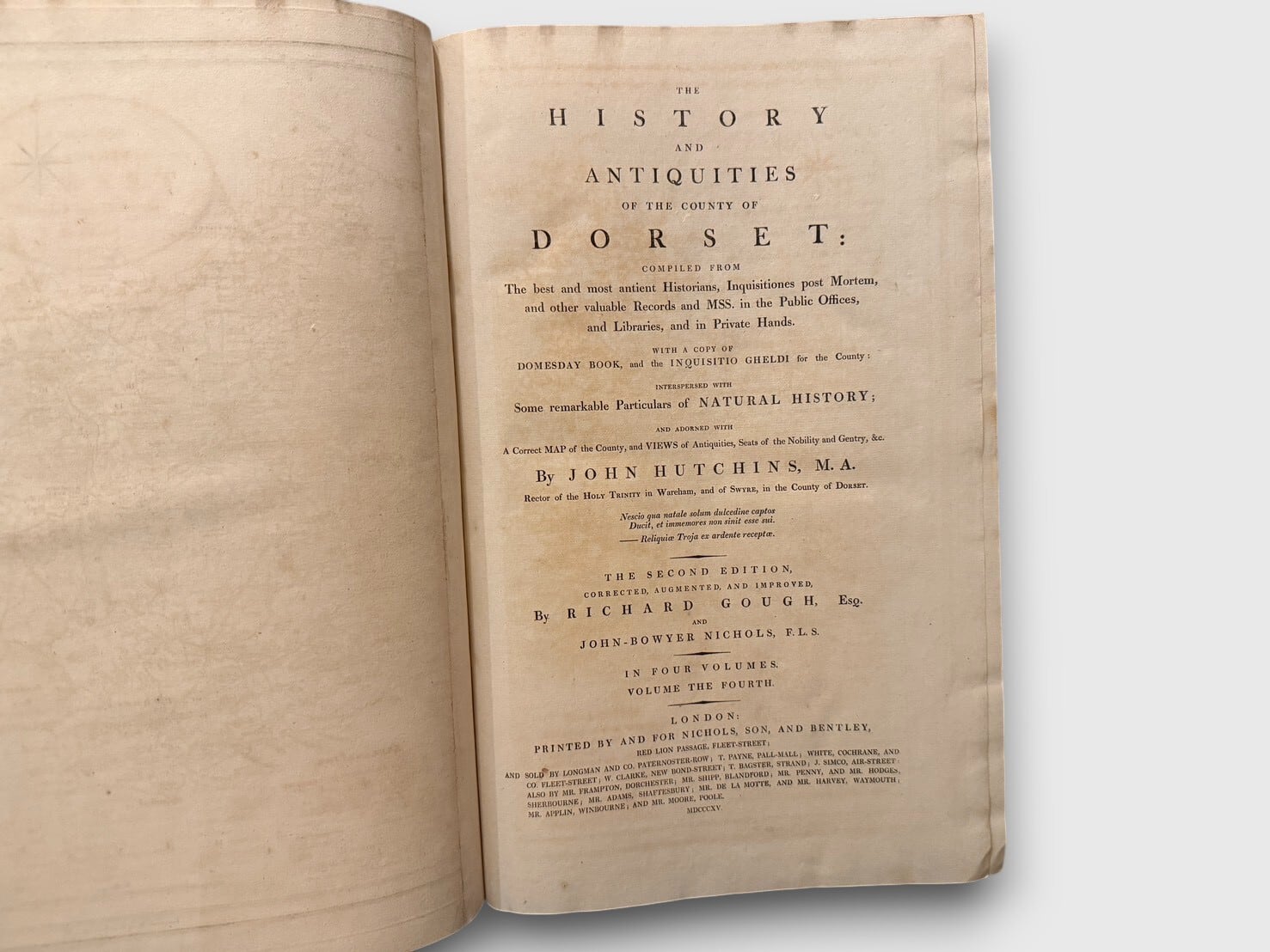 18世紀イングランドを代表する郡誌の古典、ジョン・ハッチンズによる『ドーセット州史』全4巻揃。本セットは、1774年に刊行された John Hutchins 本人による初版第1・第2巻と、その後 Richard Gough により校訂・増補され、「Second Edition, corrected, augmented, and improved」として刊行された第3巻(1813年)および第4巻(1815年)から構成されている。ハッチンズの原著は、ドーセット州の歴史・地理・教会史・家系・荘園・碑文・古代遺跡・自然史に至るまで、膨大な一次史料と現地調査に基づいて編纂された記念碑的業績であり、英国地方史研究の礎を築いた。「初版第1・第2巻を含む第2版全4巻揃」という構成そのものが、本書の学術的成熟過程を体現しており、内容・書誌の両面から高い評価に値する一組である。