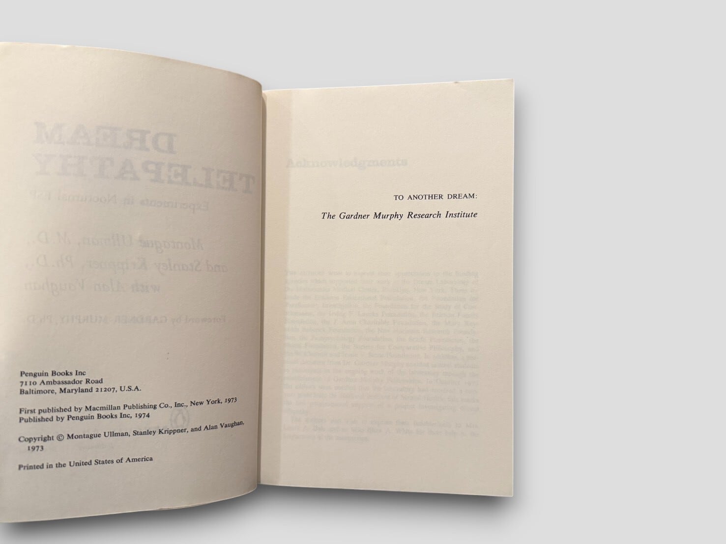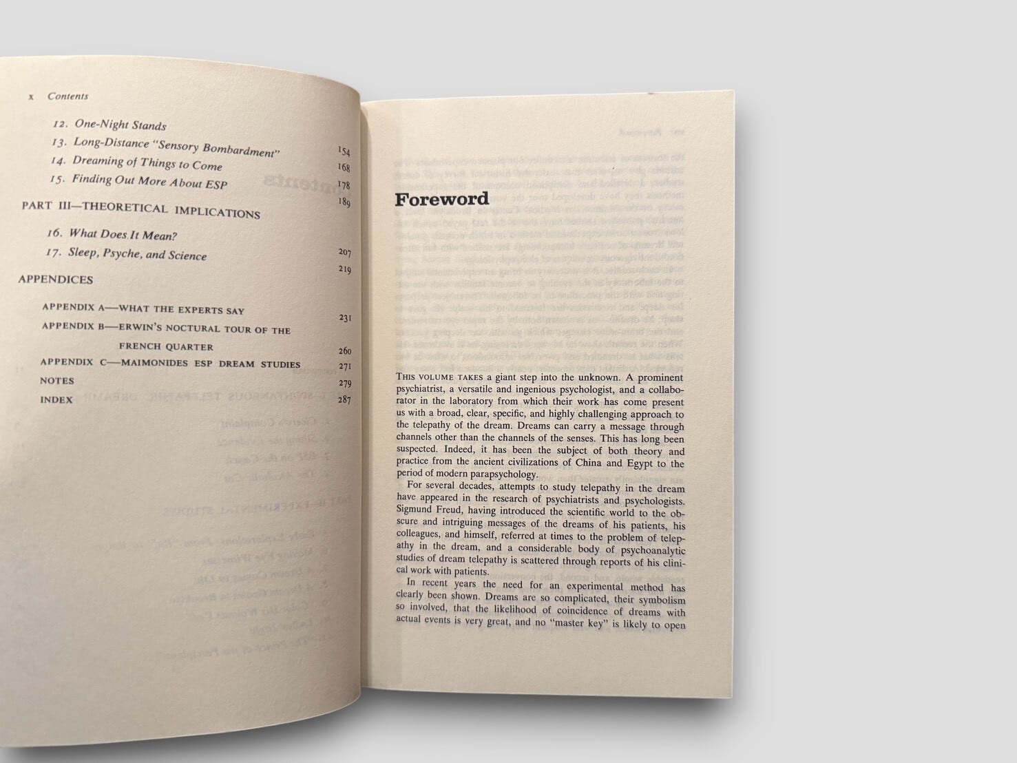 精神医学者モンタギュー・ウルマンと心理学者スタンリー・クリップナーによる、夢とテレパシー現象に関する実験的研究をまとめた一冊。ニューヨークのマイモニデス医療センター夢研究所で行われた実験研究および関連する臨床的観察をもとに、「睡眠中に生じる知覚外情報伝達(Nocturnal ESP)」という仮説を、具体的な症例と実験設計を通じて検討している。本書の特徴は、当時の心理学および睡眠研究の方法論を用いて夢を捉え直そうとする姿勢にある。