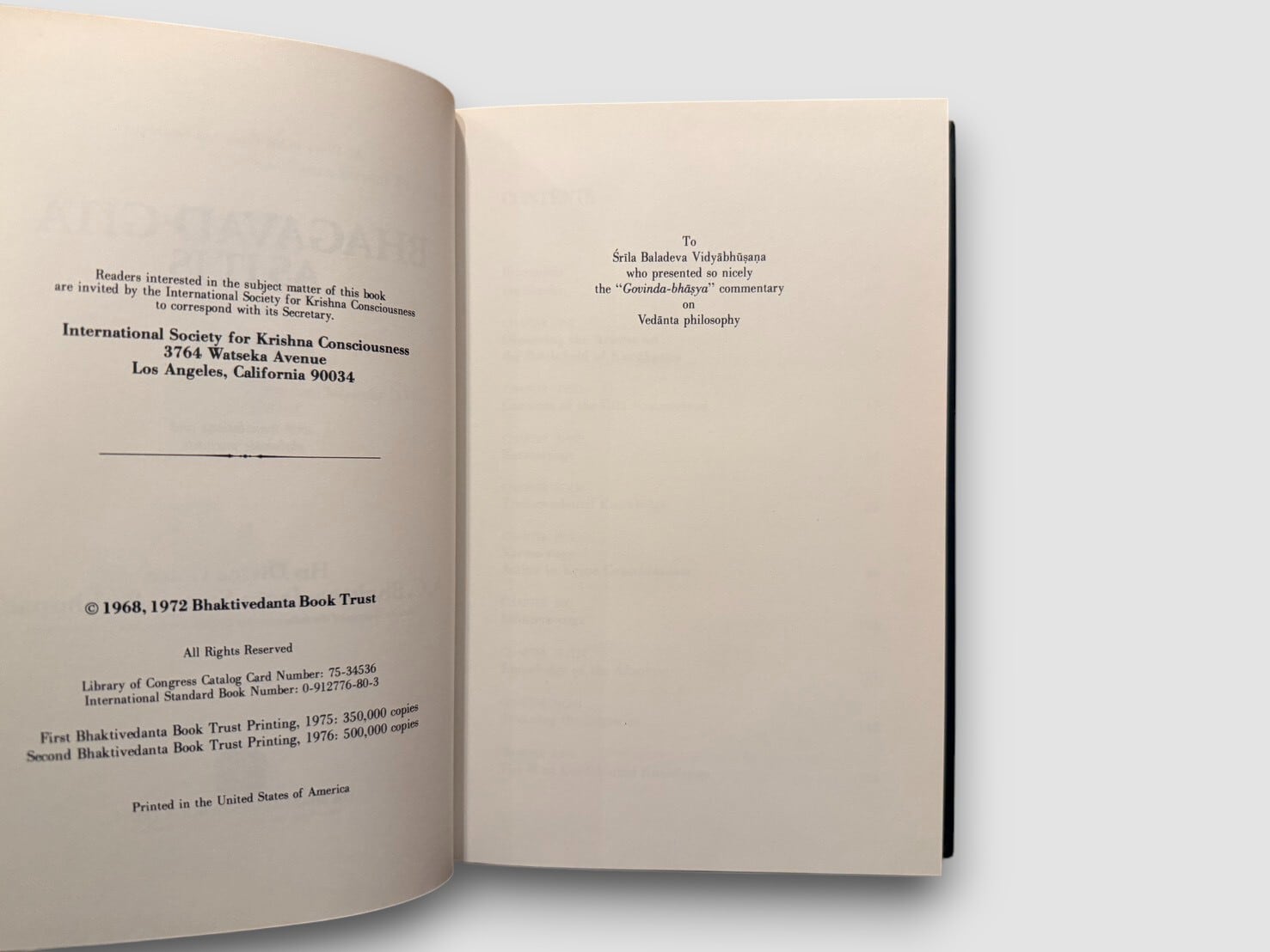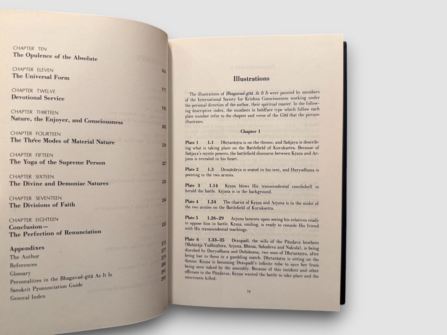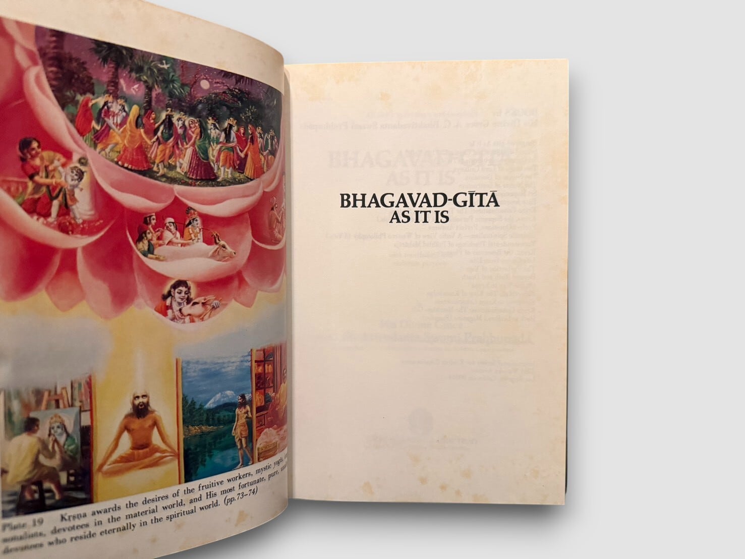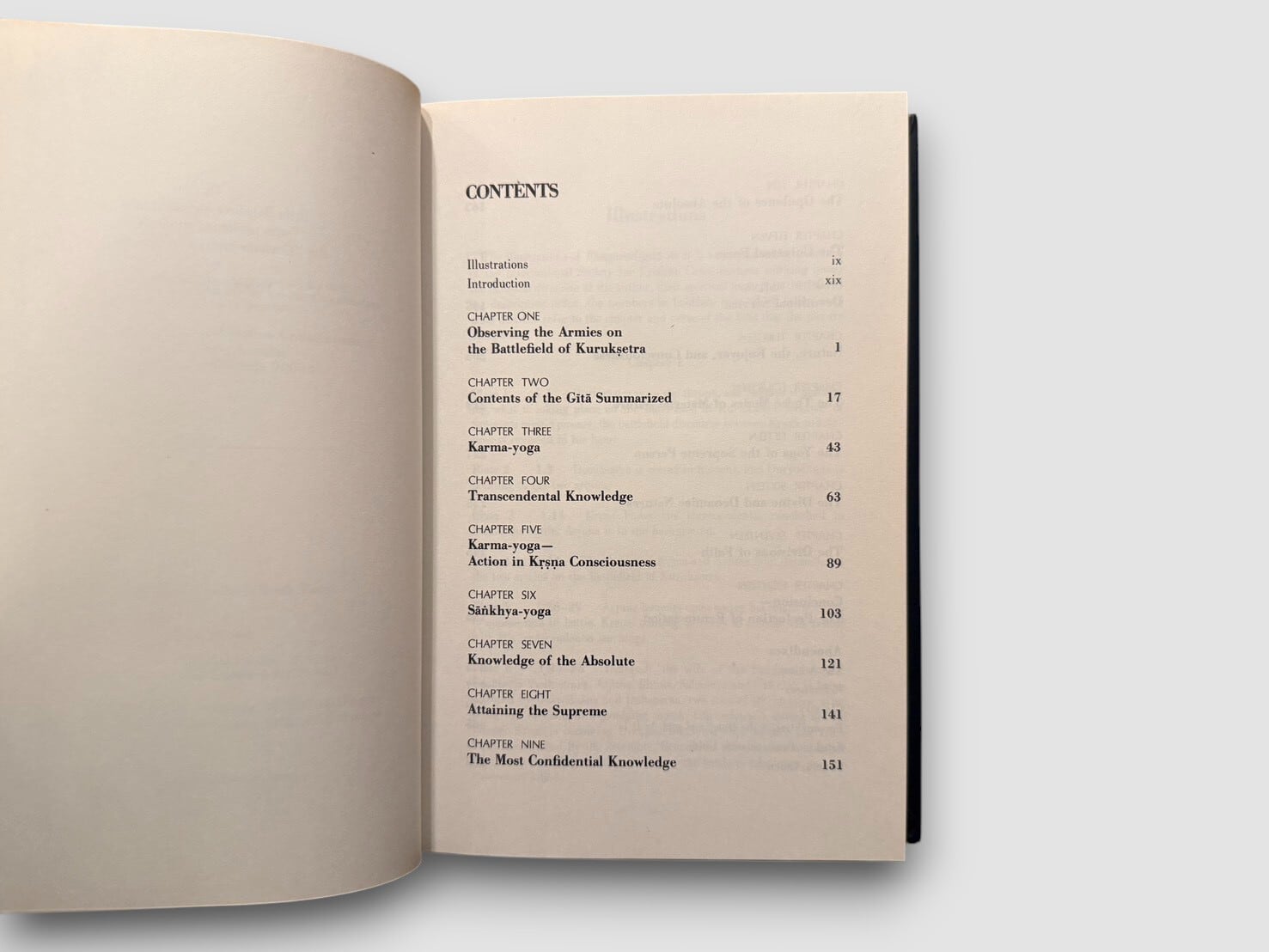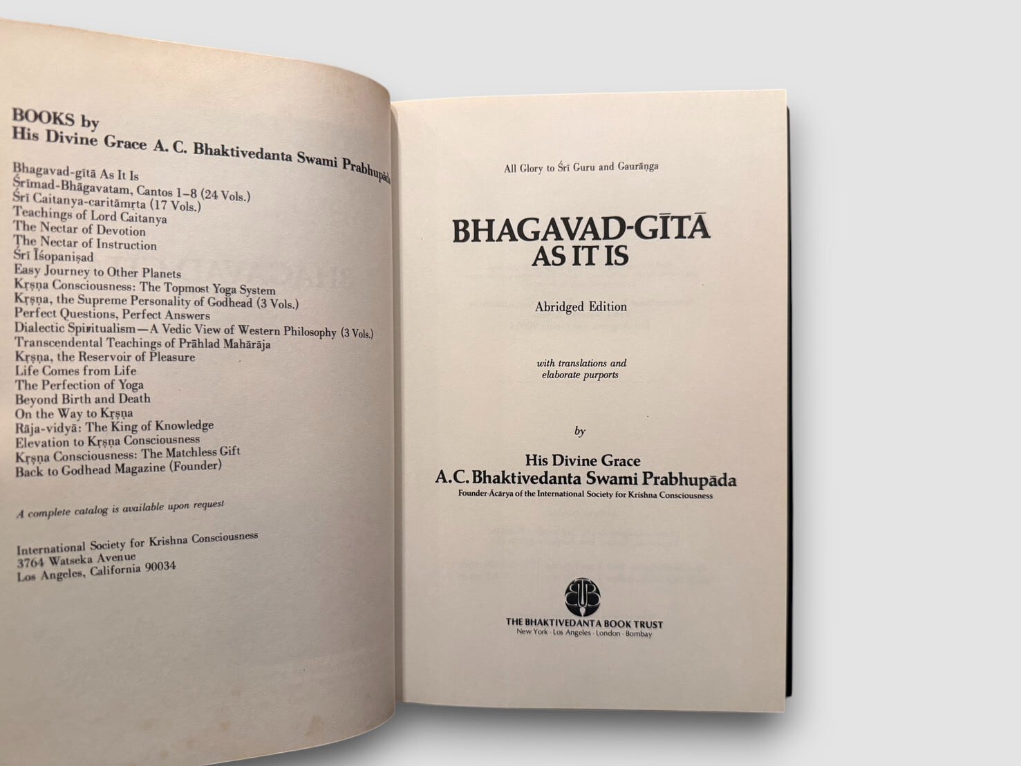 ISKCON(国際クリシュナ意識協会)の創始者である A. C. バクティヴェーダーンタ・スワミ・プラブパーダ による『バガヴァッド・ギーター』注釈付き英訳版。本作は Abridged Edition として編集され、翻訳本文に加え、信仰実践の立場からの詳細な解説(purports)を伴う構成となっている。章構成は『バガヴァッド・ギーター』全18章を踏まえつつ、図版(illustrations)を含み、物語的理解を助ける編集がなされている。