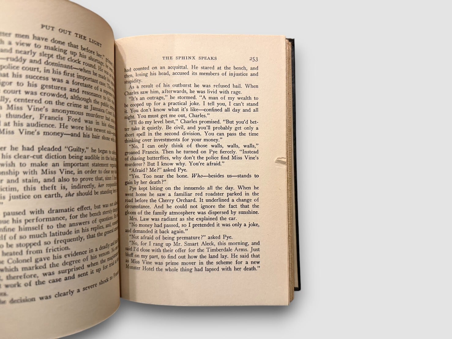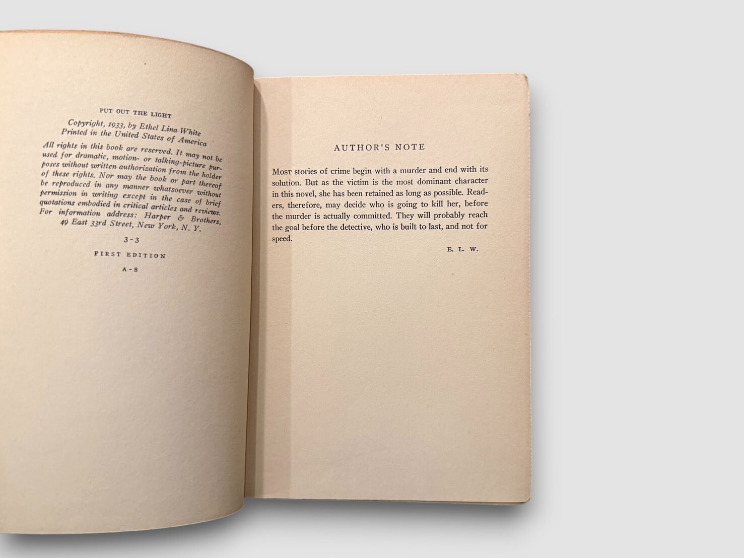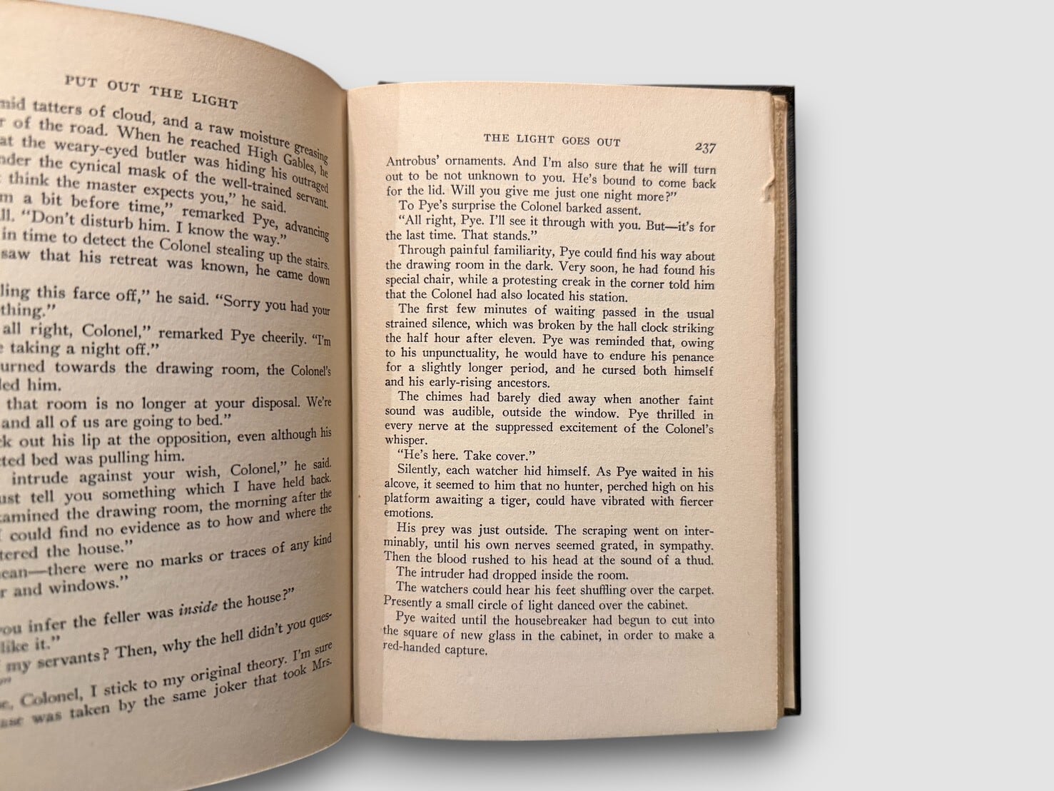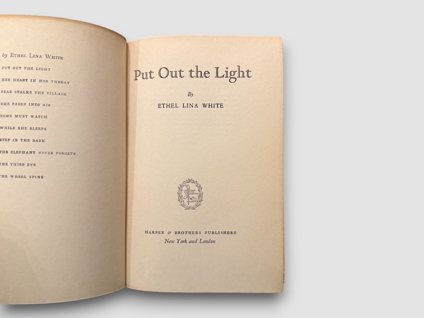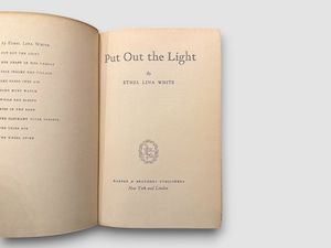 英国犯罪小説の名手エセル・リナ・ホワイトによる長編推理小説『Put Out the Light』。1933年に刊行された初版。物語は、閉ざされた空間と心理的緊張を巧みに組み合わせ、犯人探しよりも「恐怖が迫る過程」を重視した構成を特徴とする。ホワイト特有の静かな不安、読者の視線を誘導する語り口は、後年のサスペンス小説や映像作品にも大きな影響を与えた。1930年代英国推理小説の流れを理解するうえで欠かせない作品の一つ。