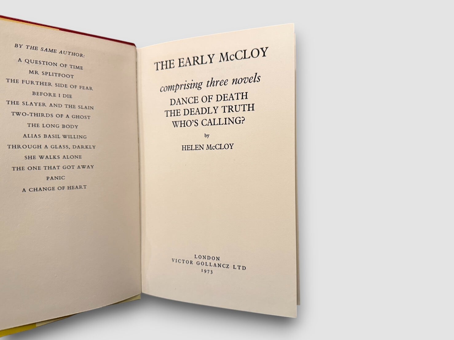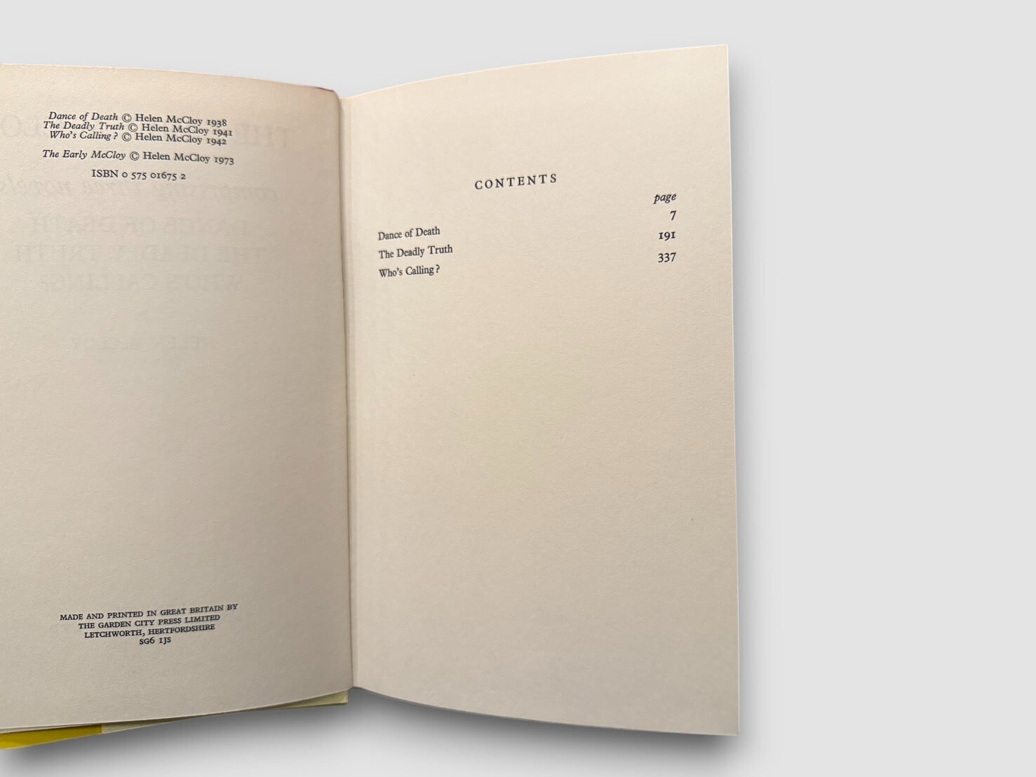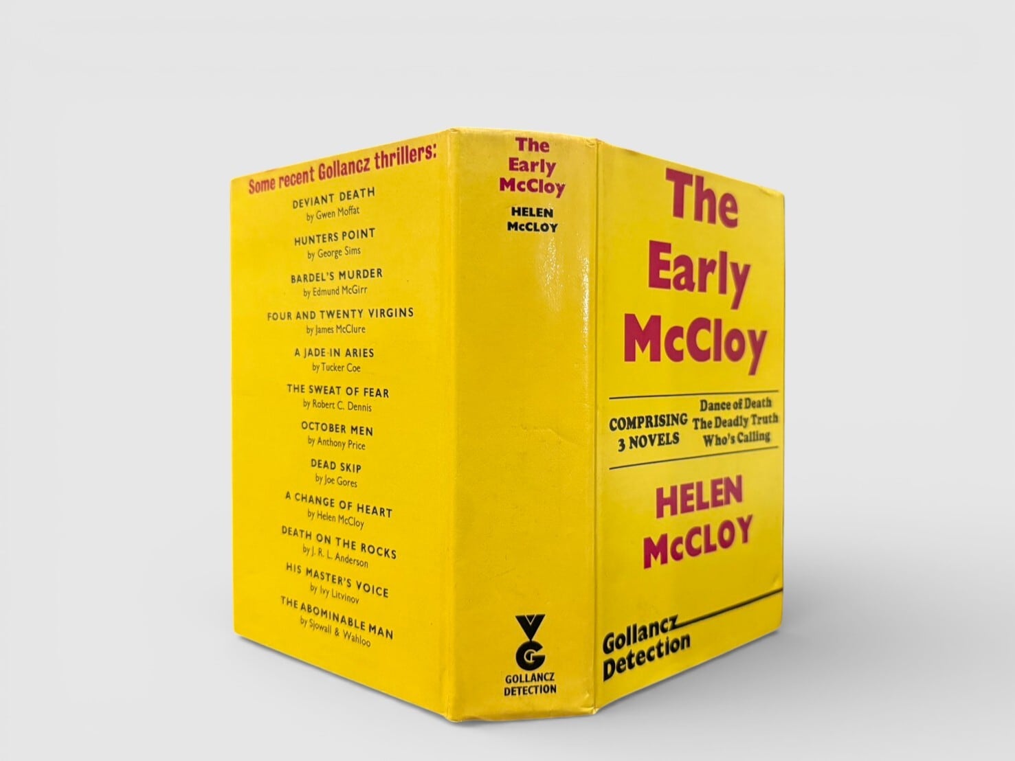 アメリカ黄金期ミステリーを代表する作家ヘレン・マクロイの初期長編3作を収録した一冊。収録作品は Dance of Death(1938)/The Deadly Truth(1941)/Who’s Calling?(1942)。いずれもマクロイの作家性が形成されていく過程を示す重要作であり、後年の心理描写と論理性の融合へと至る萌芽が色濃く現れている。本書は1973年に Victor Gollancz Ltd. より刊行された英国版で、同社らしい鮮やかな装丁も魅力のひとつである。