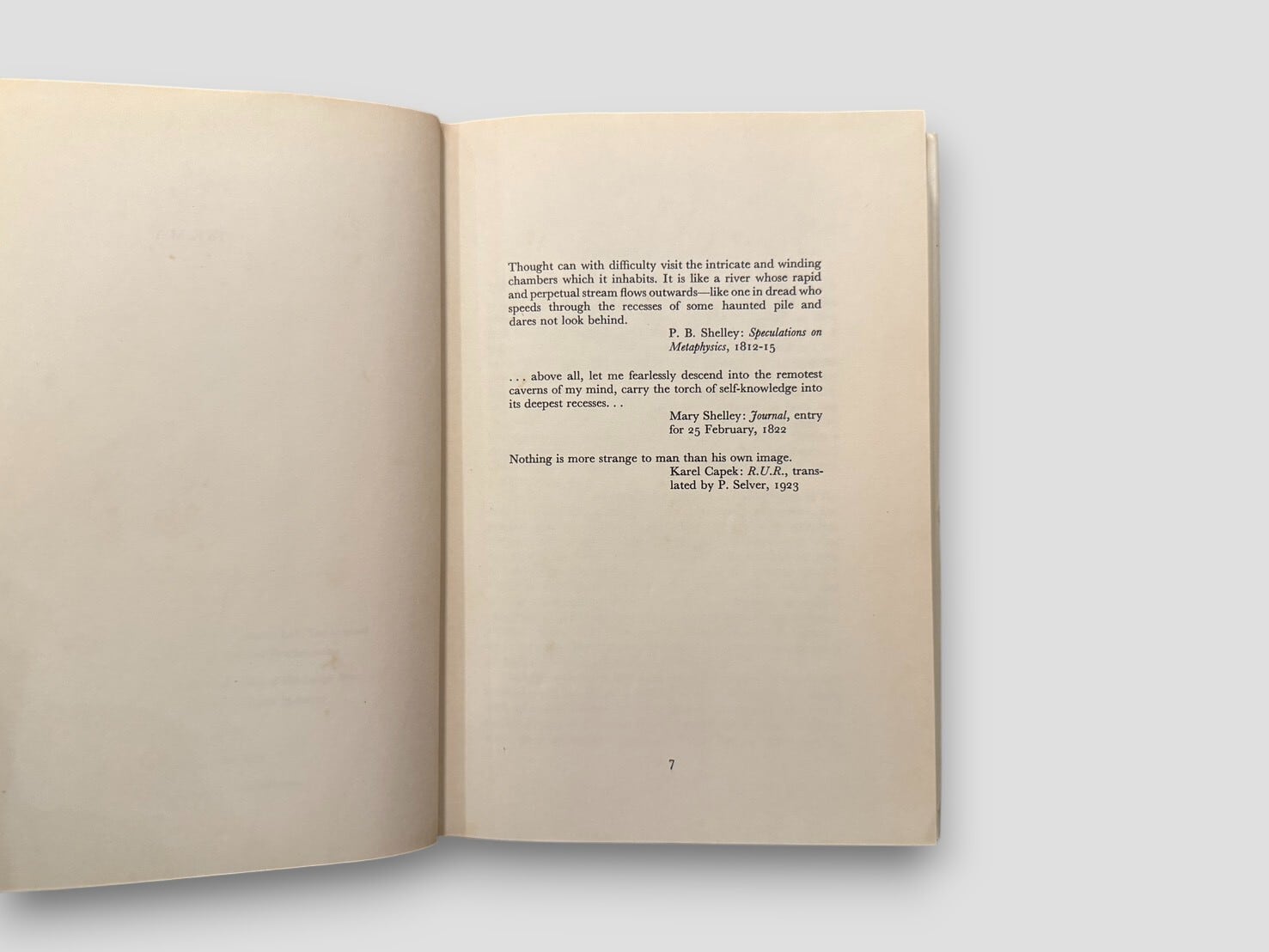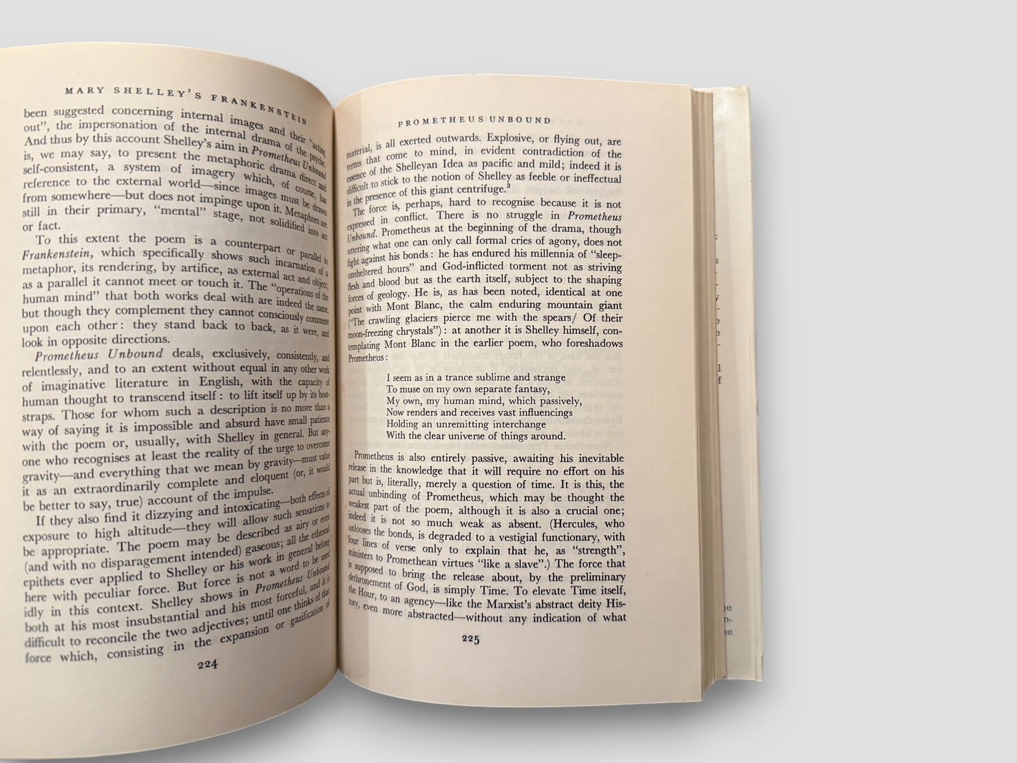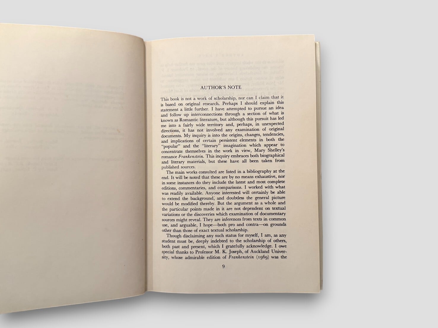 メアリーシェリーの 『フランケンシュタイン』 を一つの「神話」として捉え、その成立から変容、近代以降における受容と解釈の広がりを辿る研究書。著者クリストファー・スモールは、原典を注意深く読み込みつつ、ロマン主義思想、科学観、想像力の問題などを横断しながら、『フランケンシュタイン』が持つ象徴性と持続的な力を考察していく。本書は、厳密な文献校訂を目的とした学術書というよりも、文学・思想・文化史を横断する批評的試みとして位置づけられており、専門研究者に限らず、原作を深く読み直したい読者にとっても示唆に富む内容となっている。『フランケンシュタイン』が近代以降の科学や想像力、さらには現代文化へとどのようにつながっていくのかを考えるための、有効な手がかりを与えてくれる重要な一冊。1973年刊行アメリカ版初版。
