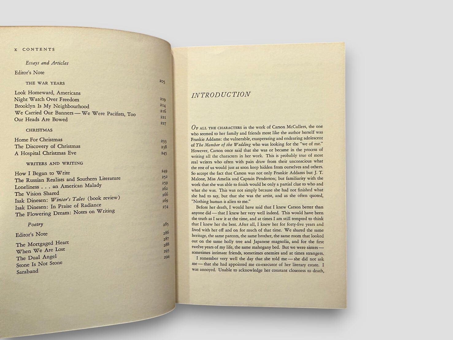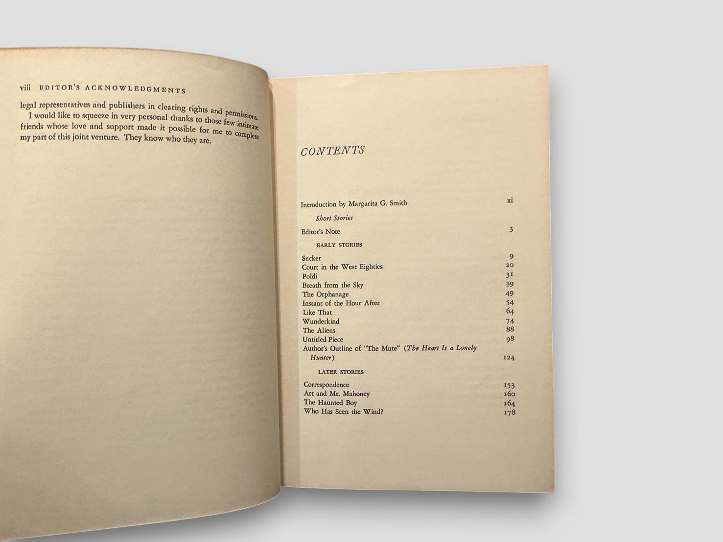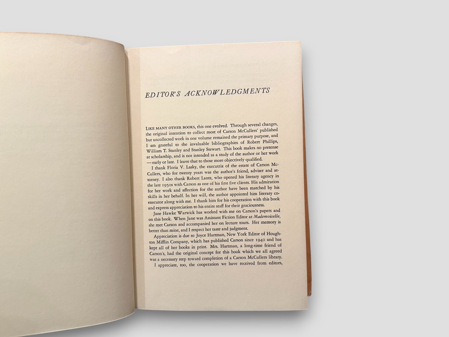カーソン・マッカラーズの没後に編集・刊行された作品集。1971年刊行初版。本書は、初期から晩年にかけて書かれた短編小説、随筆、詩、評論が収録されており、マッカラーズ文学の核心にある「孤独」「愛」「身体の脆さ」「社会との緊張関係」といった主題が、多様な形式を通して浮かび上がる構成となっている。単なる代表作選集ではなく、作家の創作と思考の広がりを多面的に示すことを意図した編集がなされており、マッカラーズの内面世界をあらためて深く感じ取ることのできる重要な一冊である。