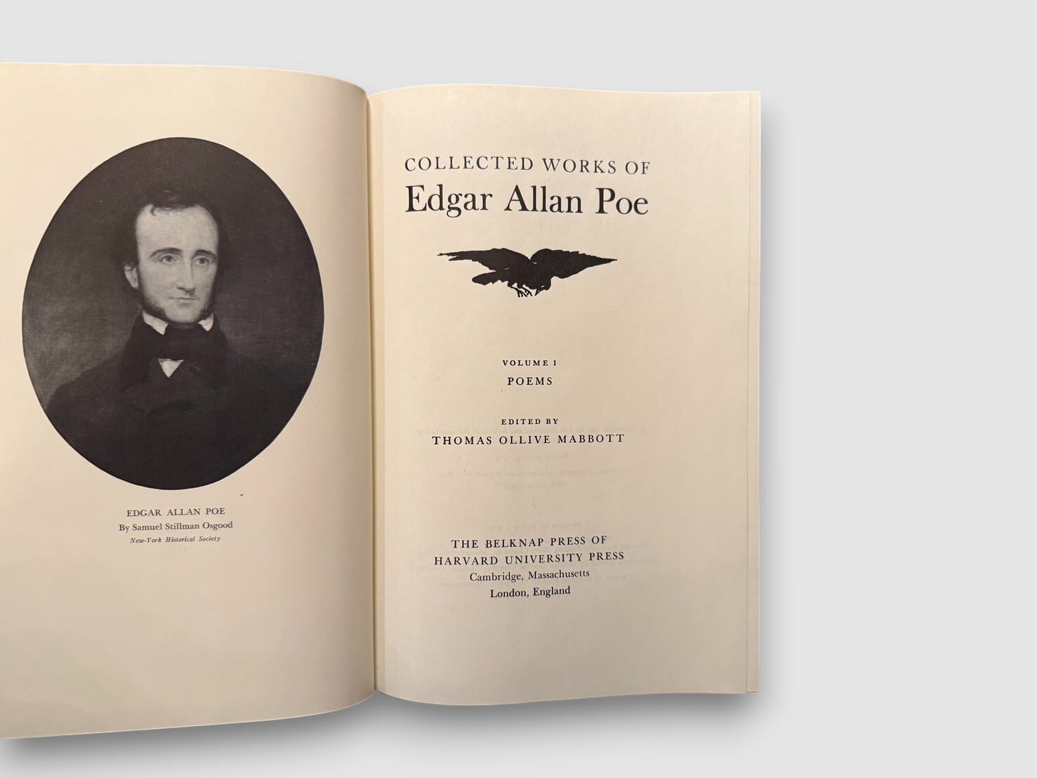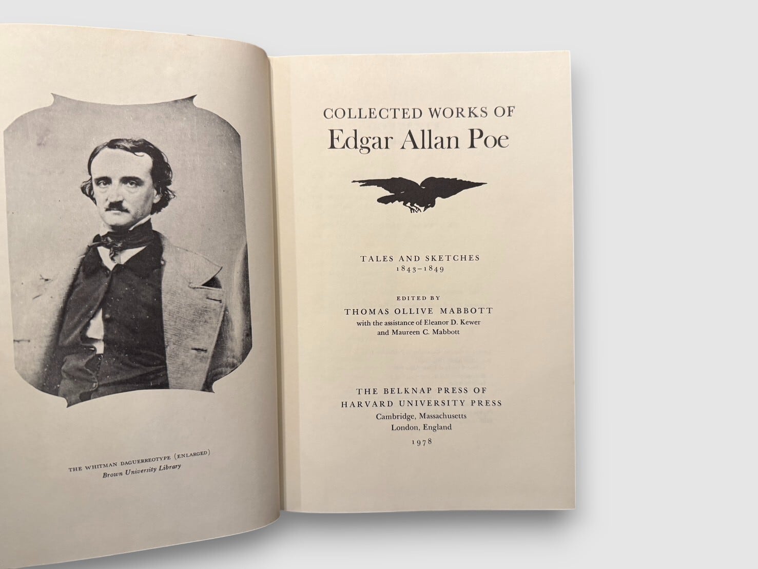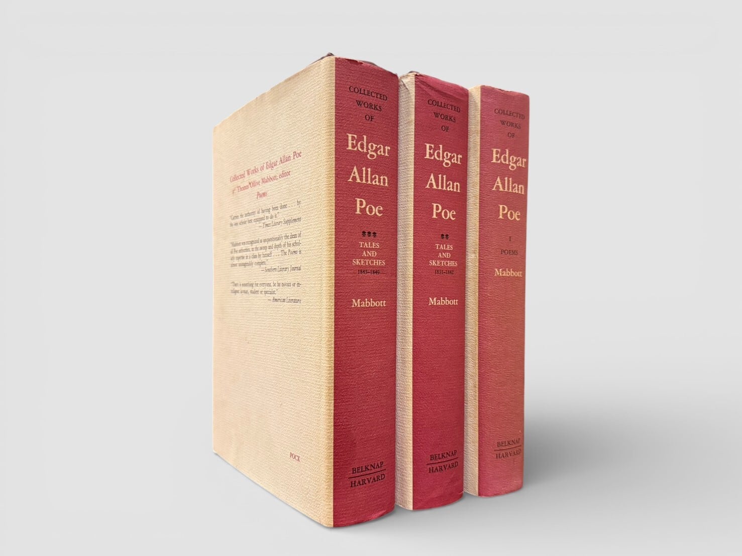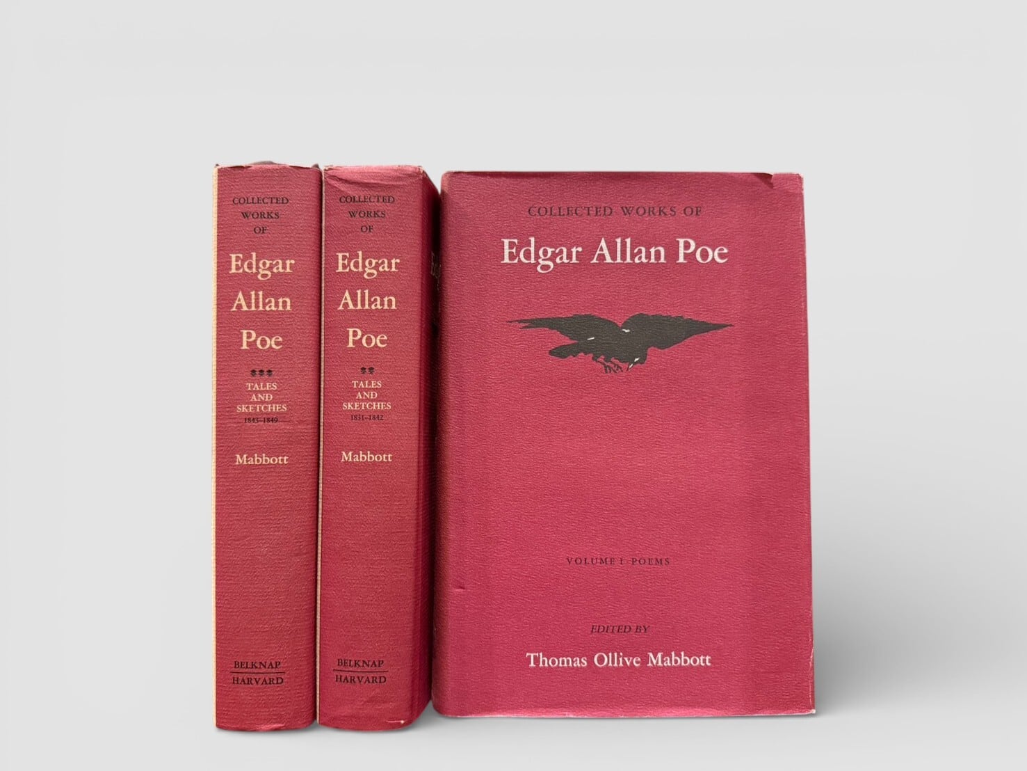 エドガー・アラン・ポーの詩および短編小説を網羅的に収録した、トマス・オリヴ・マボット編集による《Collected Works of Edgar Allan Poe》全3巻揃。第1巻 Poems は1969年に初版刊行され、第2・第3巻 Tales and Sketches は、編集者マボットの没後、その厳密な校訂方針と遺稿に基づいて1978年に初版刊行された。マボットは、ポー作品の原稿・初出誌・異版・生前改訂を徹底的に照合し、作品ごとの成立過程と最終形を確定することに生涯を捧げた研究者である。本全集は、未完の構想を無理に補完することなく、校訂が完了した範囲のみを刊行するという編集理念が貫かれており、その学術的厳密さから、現在に至るまでポー作品研究における決定版(definitive edition)として位置づけられている。研究・翻訳の基準点としてのみならず、ポー文学の全体像を最も信頼できる形で手に取ることのできる、記念碑的な選集。