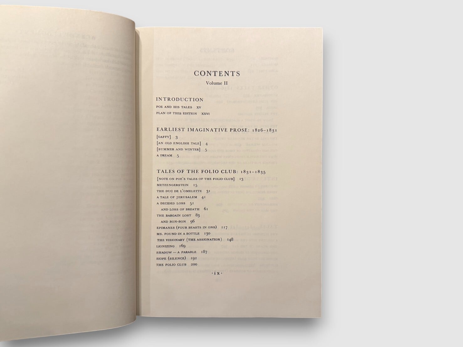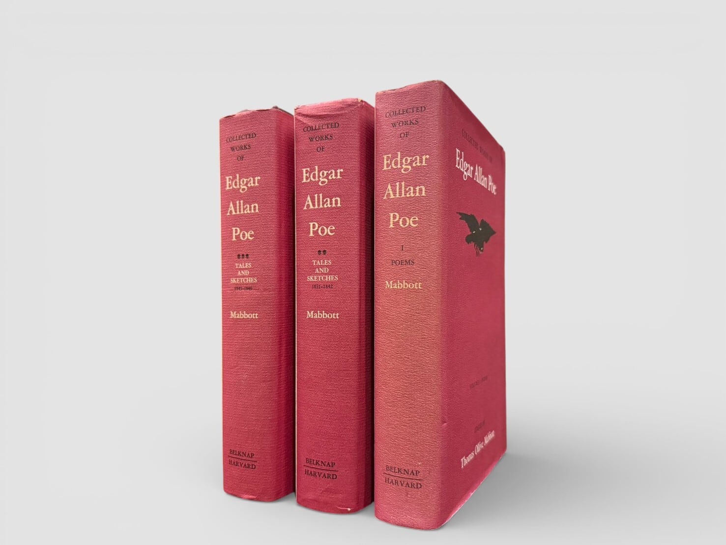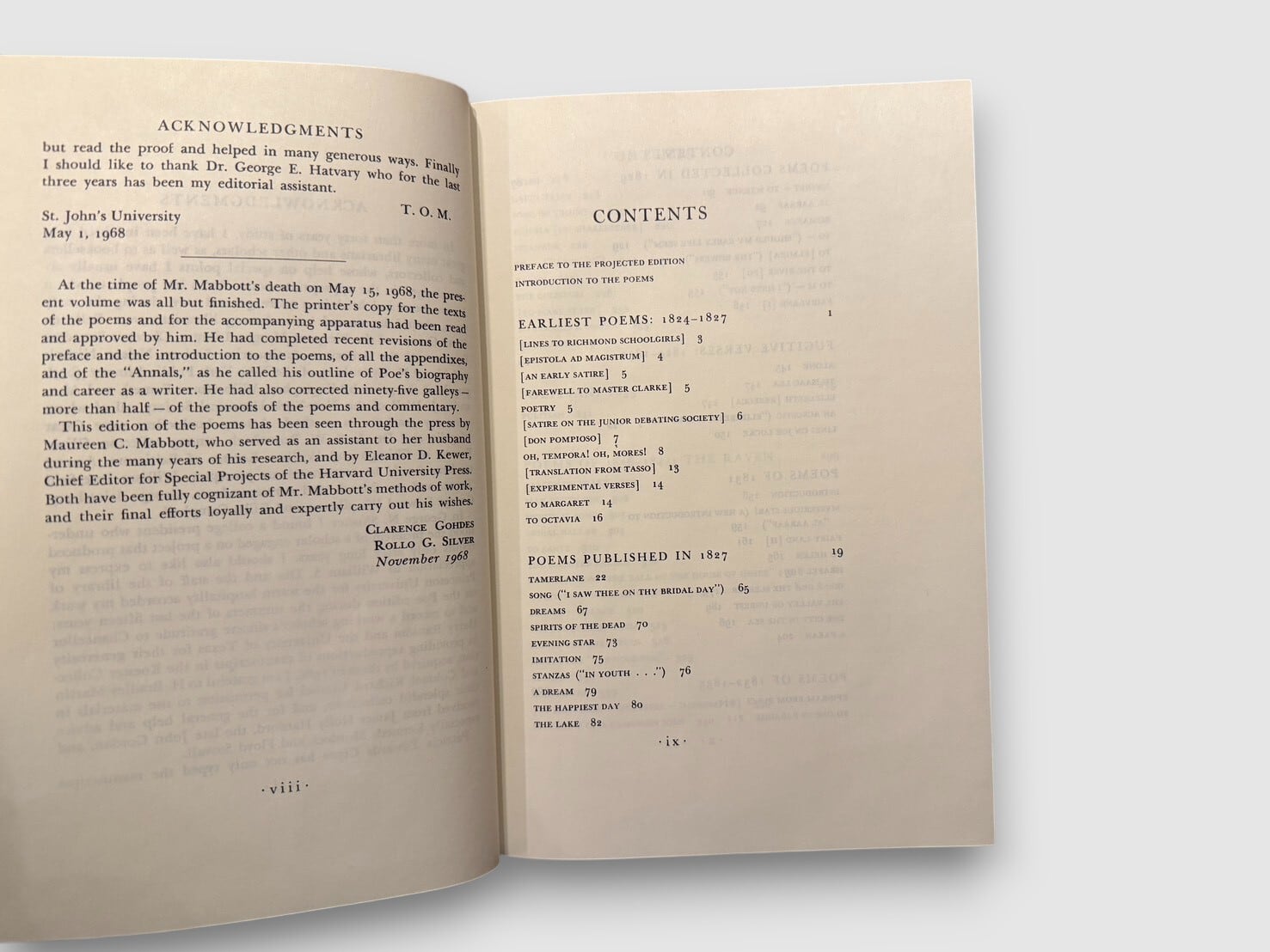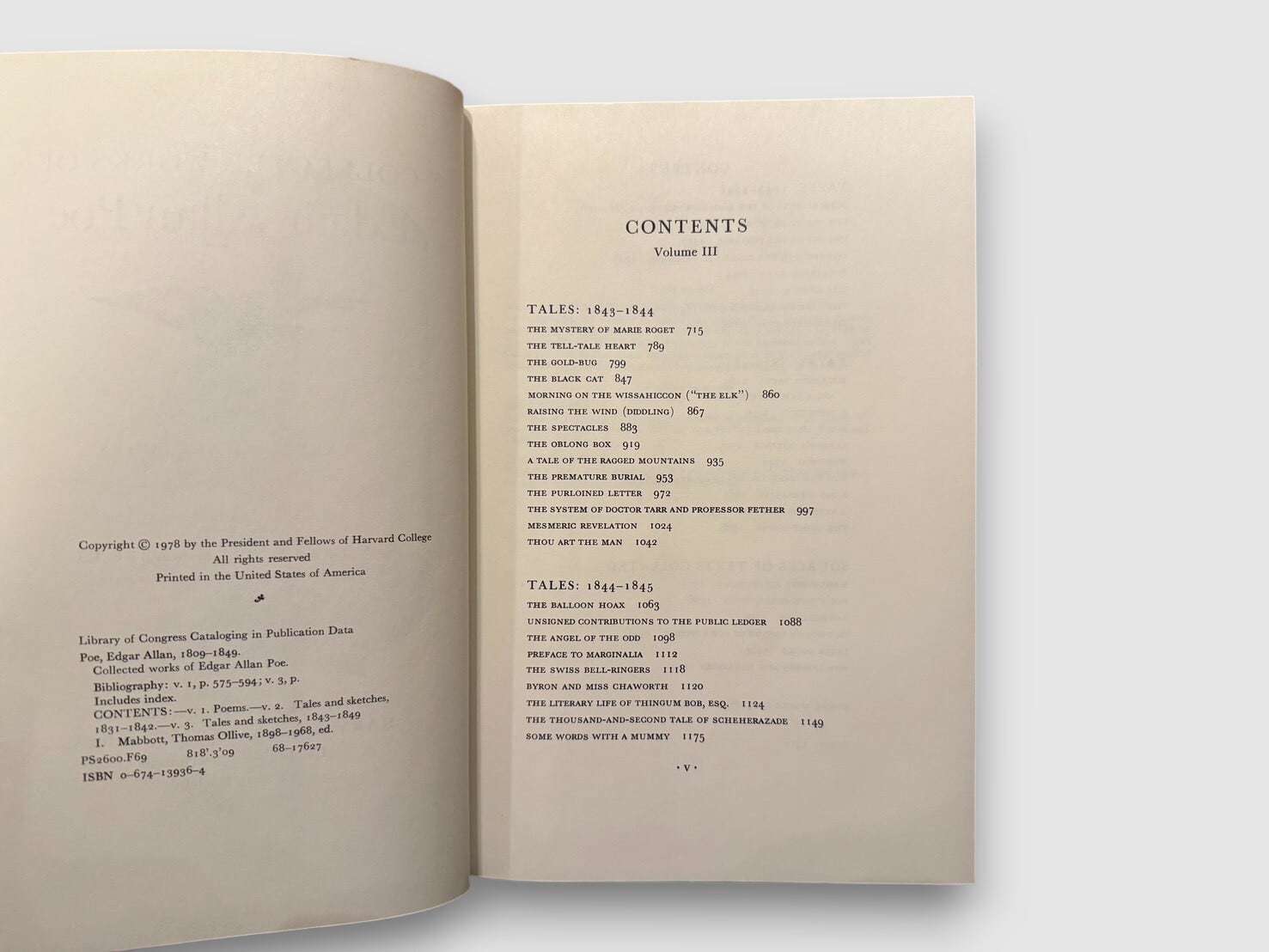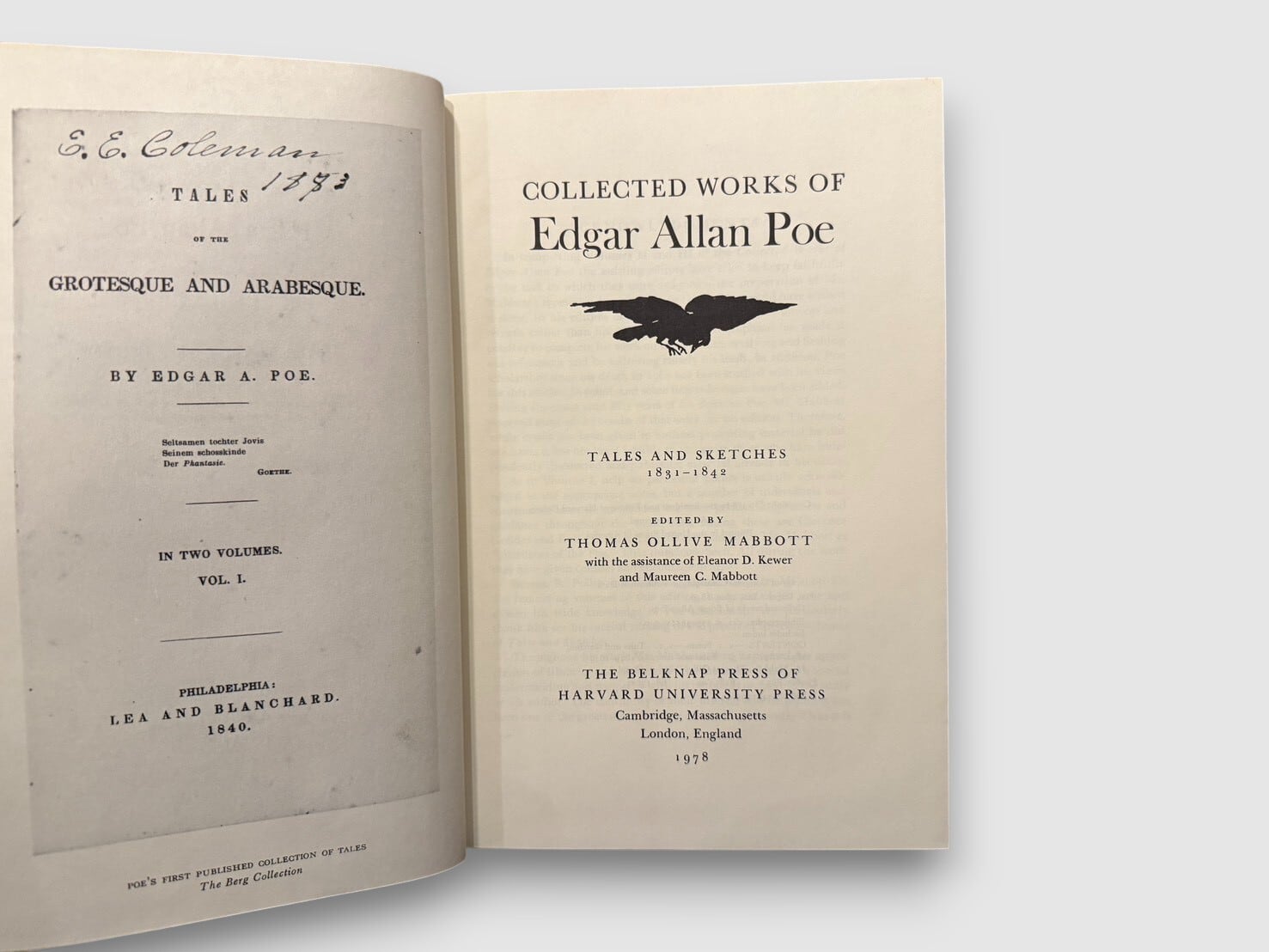 エドガー・アラン・ポーの詩および短編小説を網羅的に収録した、トマス・オリヴ・マボット編集による《Collected Works of Edgar Allan Poe》全3巻揃。第1巻 Poems は1969年に初版刊行され、第2・第3巻 Tales and Sketches は、編集者マボットの没後、その厳密な校訂方針と遺稿に基づいて1978年に初版刊行された。マボットは、ポー作品の原稿・初出誌・異版・生前改訂を徹底的に照合し、作品ごとの成立過程と最終形を確定することに生涯を捧げた研究者である。本全集は、未完の構想を無理に補完することなく、校訂が完了した範囲のみを刊行するという編集理念が貫かれており、その学術的厳密さから、現在に至るまでポー作品研究における決定版(definitive edition)として位置づけられている。研究・翻訳の基準点としてのみならず、ポー文学の全体像を最も信頼できる形で手に取ることのできる、記念碑的な選集。