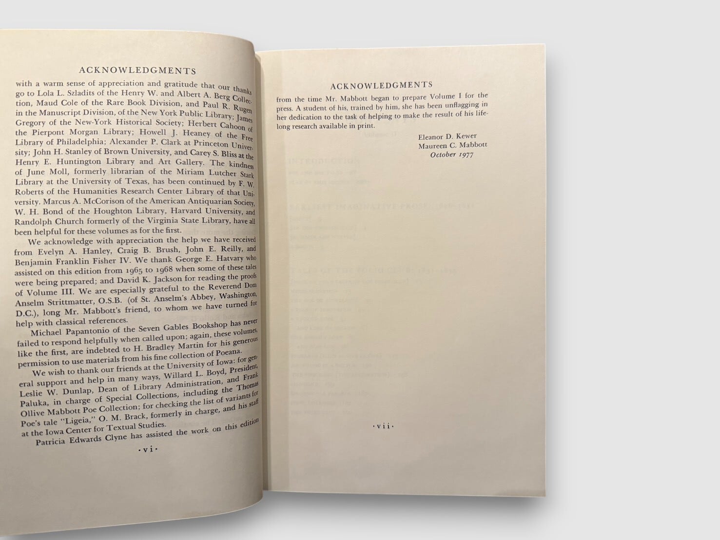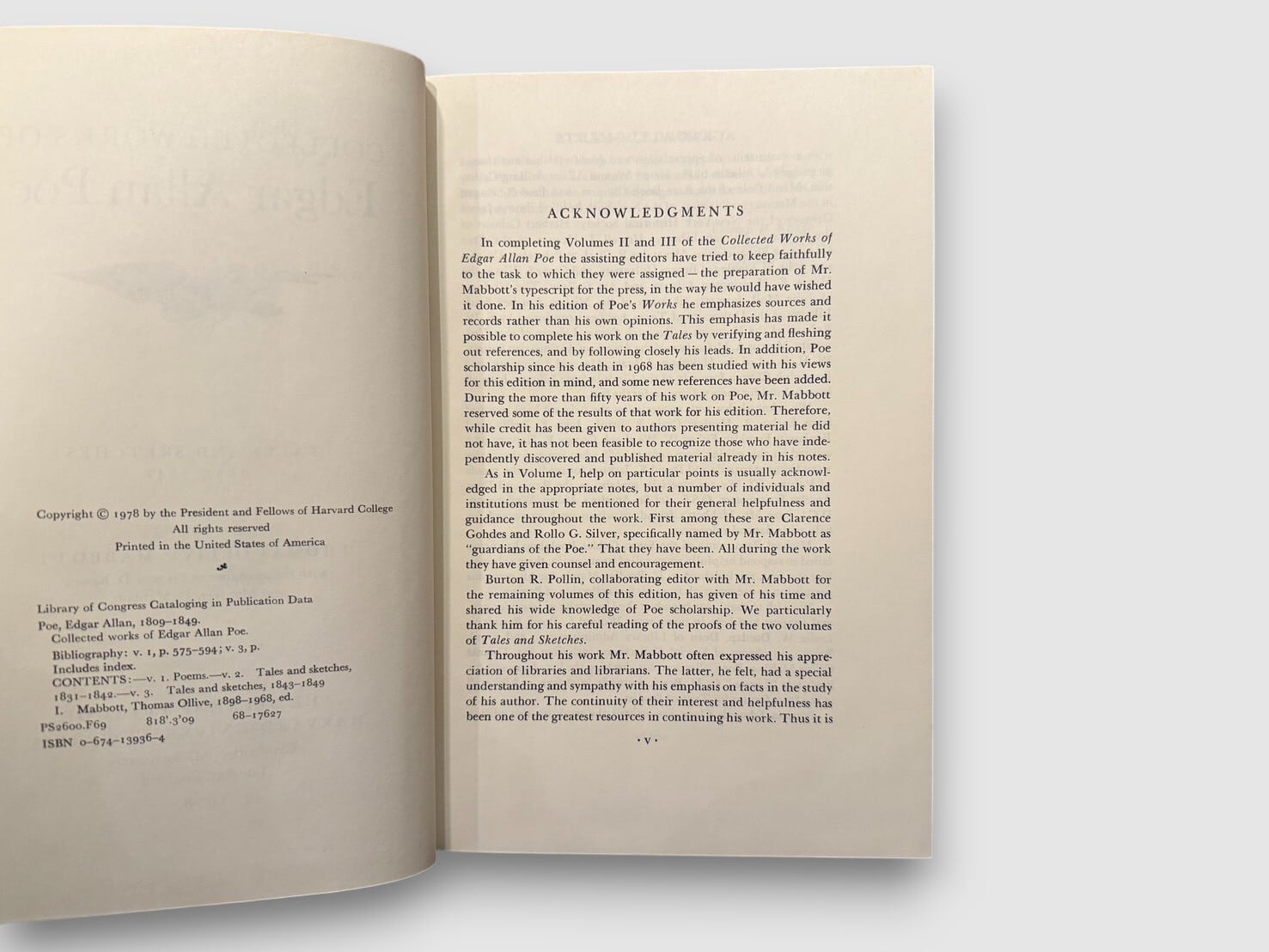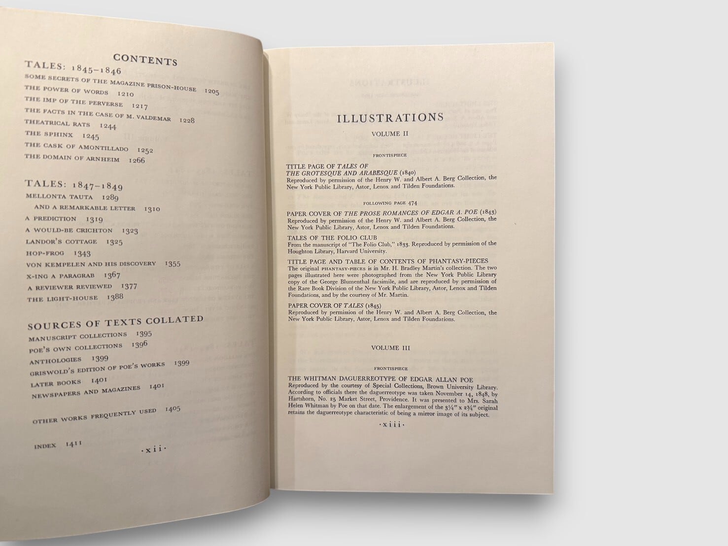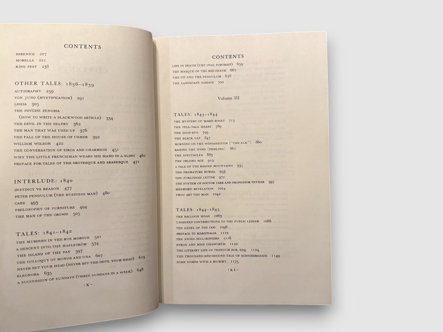 エドガー・アラン・ポーの詩および短編小説を網羅的に収録した、トマス・オリヴ・マボット編集による《Collected Works of Edgar Allan Poe》全3巻揃。第1巻 Poems は1969年に初版刊行され、第2・第3巻 Tales and Sketches は、編集者マボットの没後、その厳密な校訂方針と遺稿に基づいて1978年に初版刊行された。マボットは、ポー作品の原稿・初出誌・異版・生前改訂を徹底的に照合し、作品ごとの成立過程と最終形を確定することに生涯を捧げた研究者である。本全集は、未完の構想を無理に補完することなく、校訂が完了した範囲のみを刊行するという編集理念が貫かれており、その学術的厳密さから、現在に至るまでポー作品研究における決定版(definitive edition)として位置づけられている。研究・翻訳の基準点としてのみならず、ポー文学の全体像を最も信頼できる形で手に取ることのできる、記念碑的な選集。