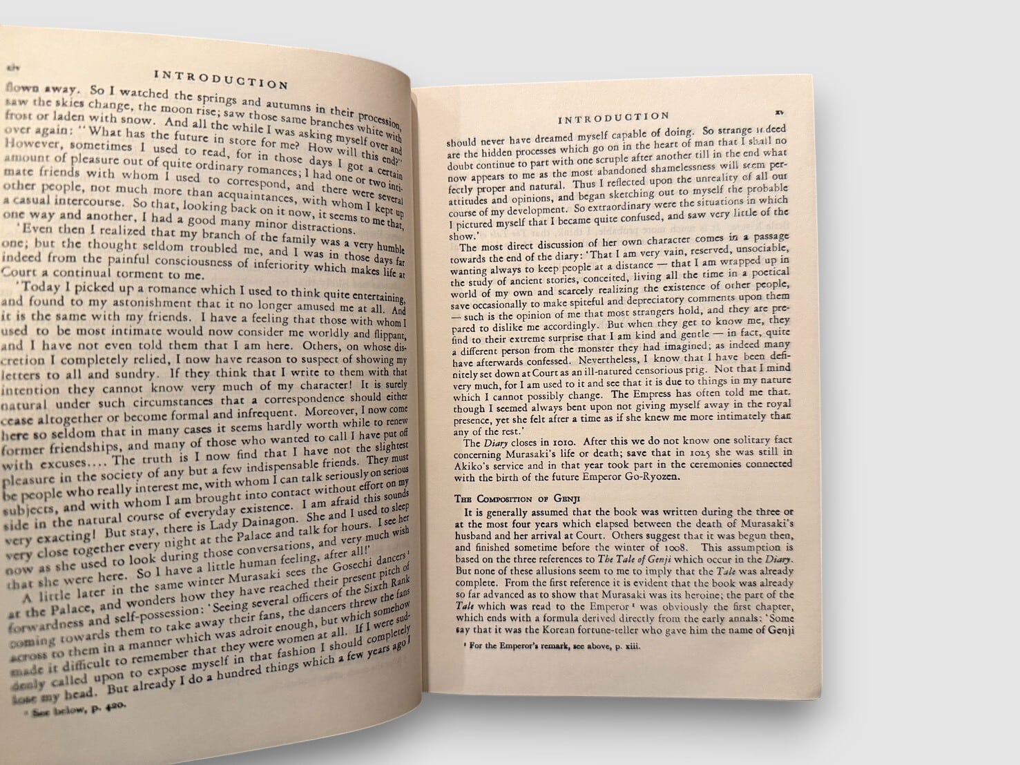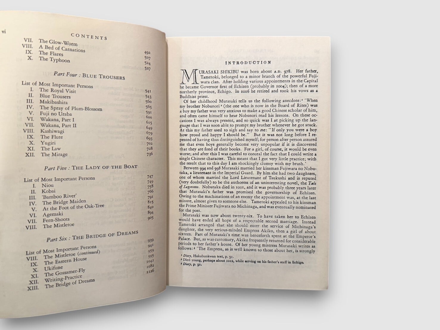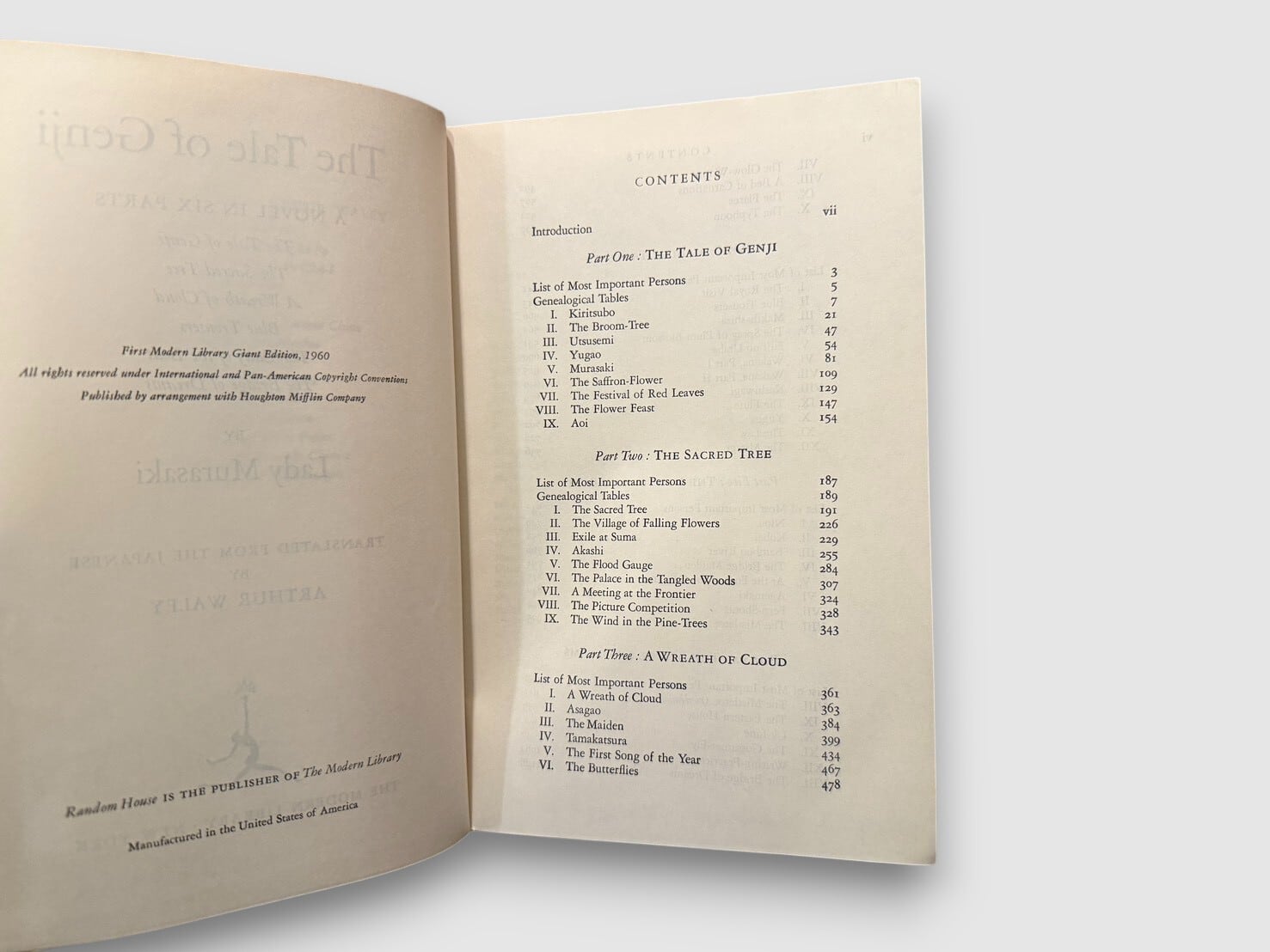 11世紀初頭に紫式部によって書かれた『源氏物語』を、20世紀英文学を代表する翻訳家アーサー・ウェイリーが英訳した名高い一冊。本書は A Novel in Six Parts として構成され、表紙に “Complete and Unabridged” と明記されたフルレングスの英訳版。後年より厳密な学術的全訳が登場した現在においても、本書はなお「古典的英訳の決定版(classic English translation)」として評価され続けており、日本古典文学が世界文学として受容されていく過程を象徴する歴史的名訳とされ、文学史・翻訳史の双方において重要な位置を占める一冊である。1960年刊行モダン・ライブラリー・ジャイアント版初版。