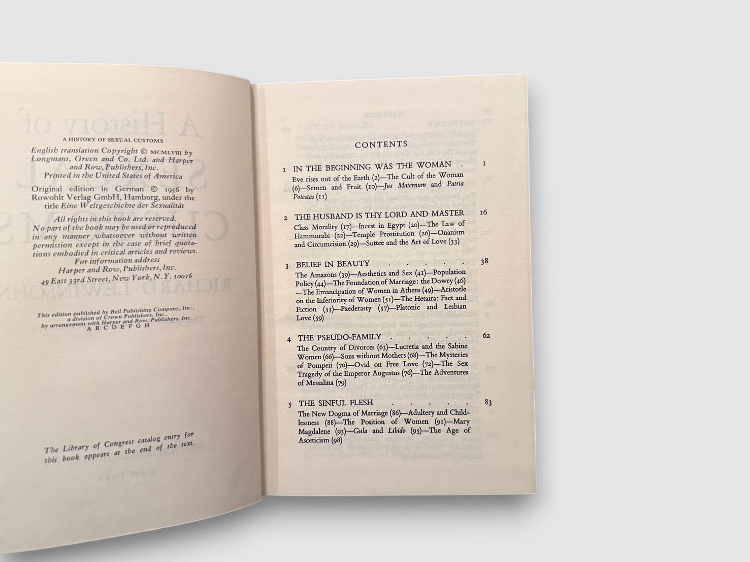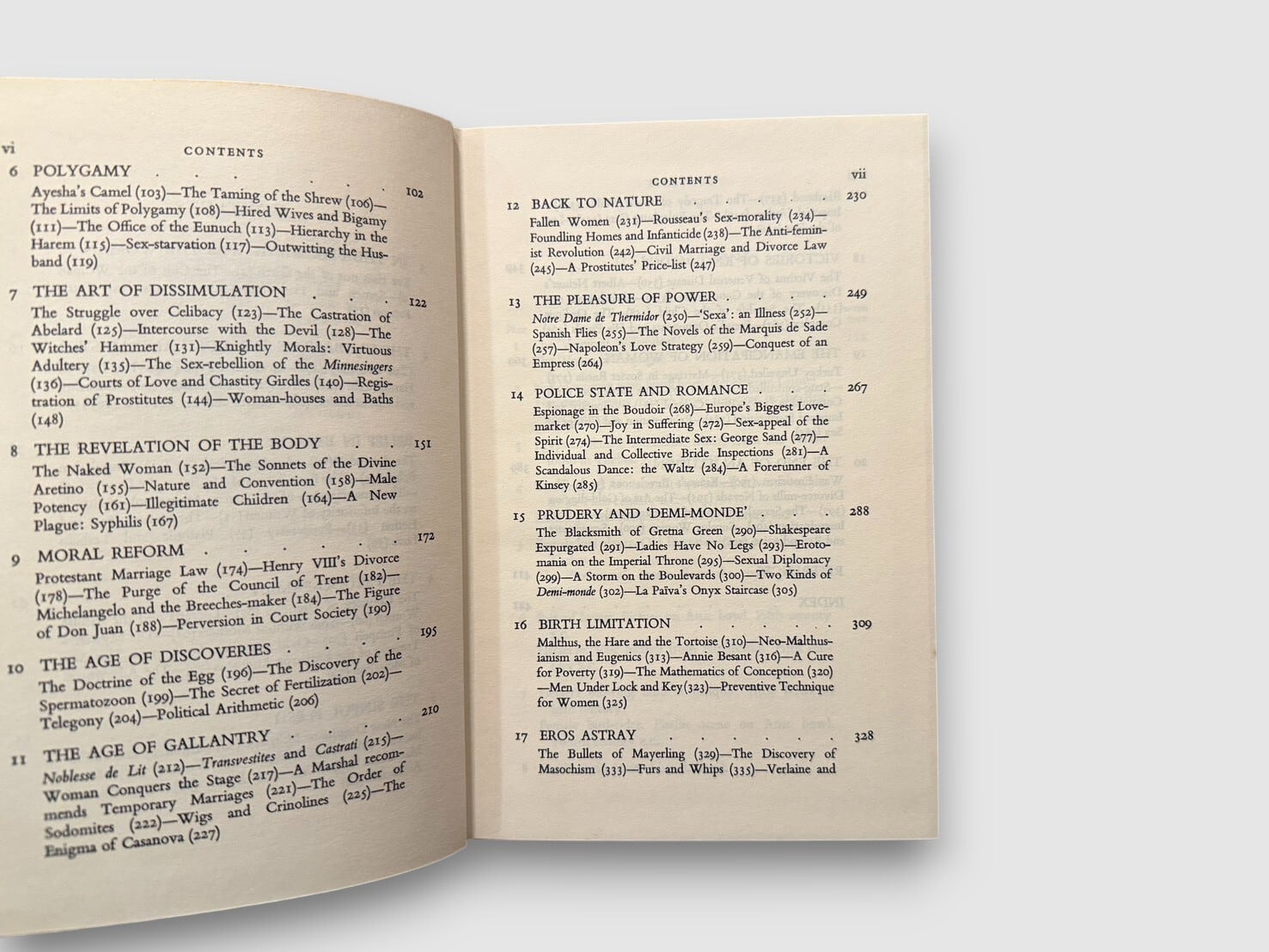 ドイツの文化史家リヒャルト・レヴィンゾーンによる、性の慣習を軸に人類史を通観した文化史的著作。宗教、婚姻制度、売買春、法、医学、芸術、思想といった多様な領域を横断しながら、「性」がいかに社会の構造や価値観と結びついてきたかを描き出す。豊富な史料と多数の図版を用い、古代から近代に至るまでの性道徳や規範の変遷を具体的に追っていく本書は、単なる好奇的読み物ではなく、20世紀半ばの文化史的視点を代表する一冊として位置づけられてきた。フロイト、サド、ルソー、カザノヴァなどの思想や人物像も随所に登場し、思想史・社会史としての読み応えも備えている。今日の研究水準から見れば古典的著作に属するが、戦後ヨーロッパにおける「性」をめぐる文化史的想像力を知るうえで、なお示唆に富む内容を持つ。1958年以降に刊行された英訳版。