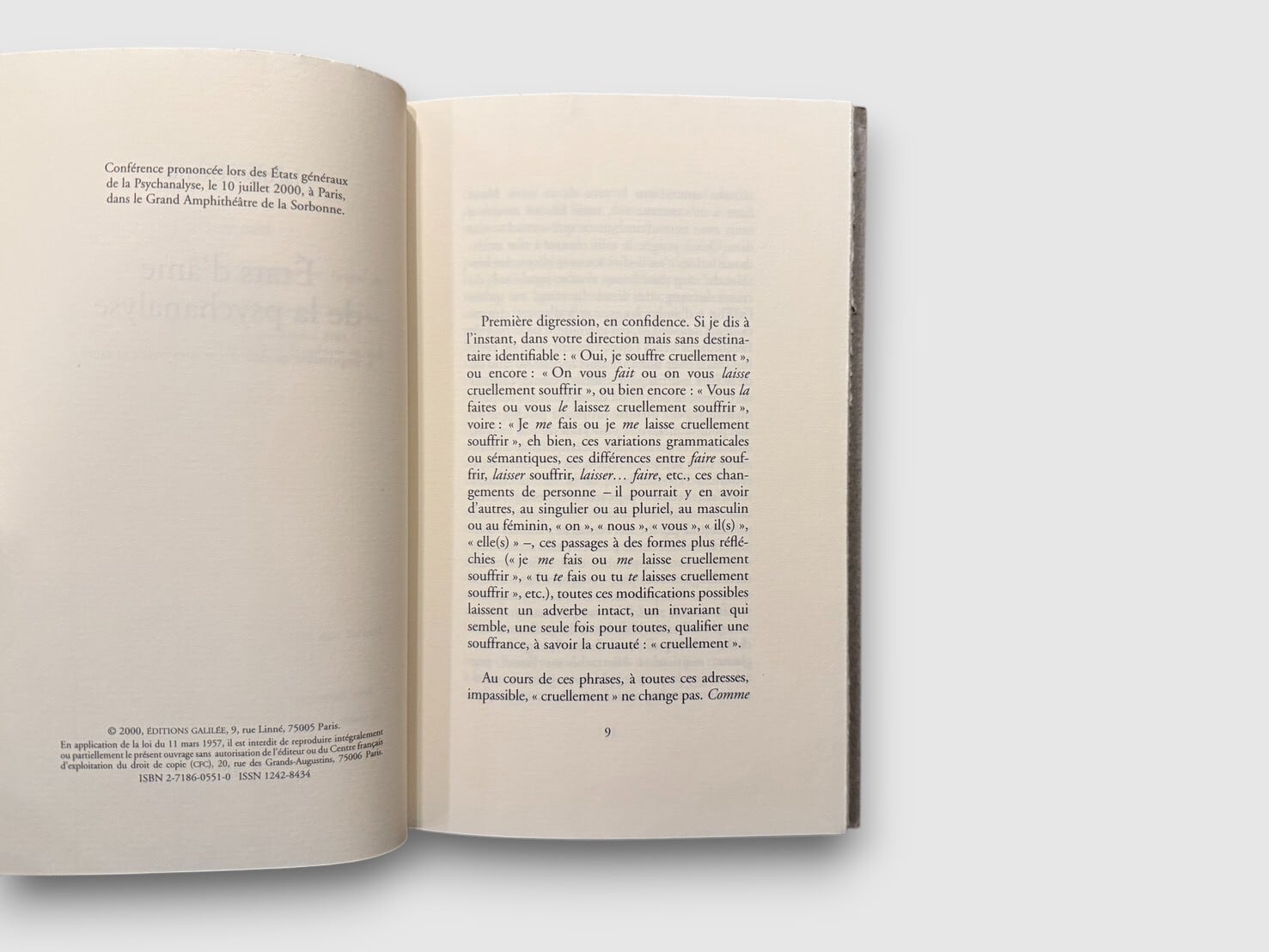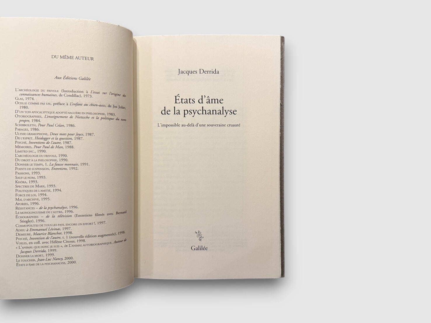 2000年7月10日、パリ・ソルボンヌ大学大講堂にて開催された「Etats generaux de la psychanalyse」で行われた、ジャック・デリダによる講演を収録した一冊。デリダはこの講演において、精神分析が扱ってきた主体、責任、苦痛、残酷さといった概念を、言語と構文のレベルから徹底的に問い直す。精神分析に対する外部からの批評であると同時に、その内部に深く入り込む思考でもあり、デリダ後期思想における倫理・責任・他者性の問題が凝縮されたテクストでもある。