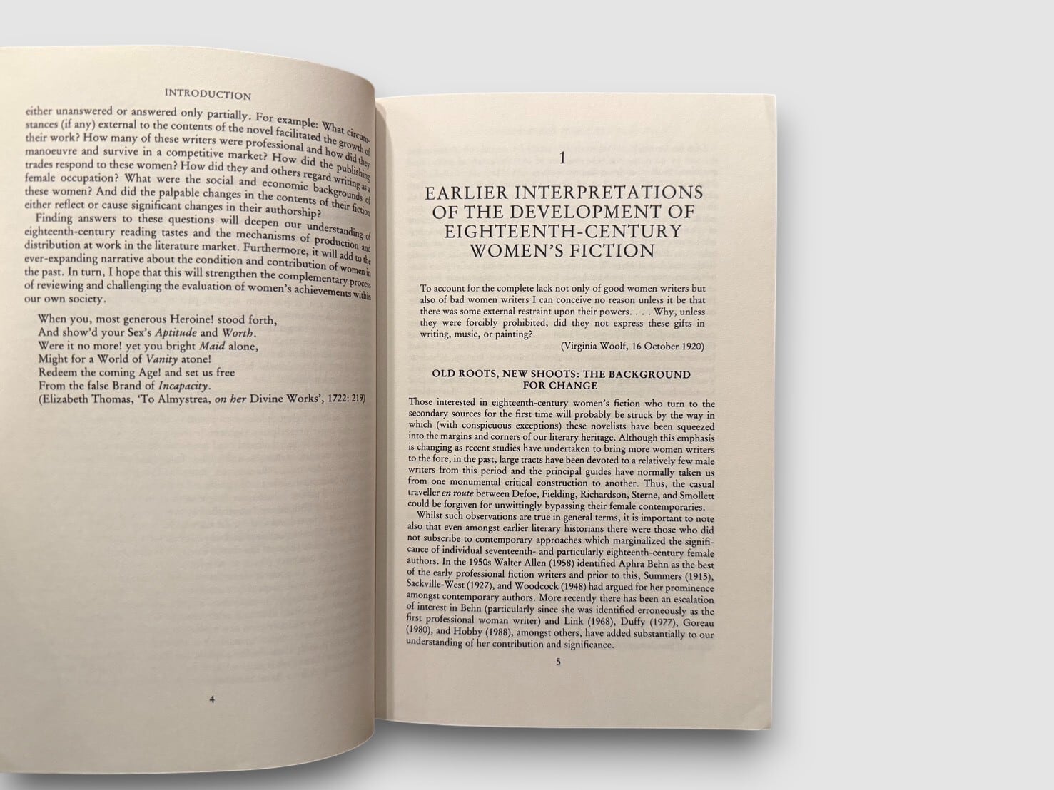 18世紀イギリス文学における女性作家たちの活動を、出版史・社会史・文学史の視点から丹念に検証した研究書。男性中心に語られてきた文学史の枠組みを問い直し、女性たちがどのように「書くことで生計を立てる(living by the pen)」存在となりえたのかを、具体的な作家・作品・出版環境の分析を通して明らかにする。単なる作家列伝ではなく、読書市場、職業作家という概念の成立、女性の教育や社会的制約といった広い文脈を踏まえた議論が展開されており、18世紀文学研究・ジェンダー研究の基礎文献として評価の高い一冊である。1994年刊行ペーパーバッグエディション。