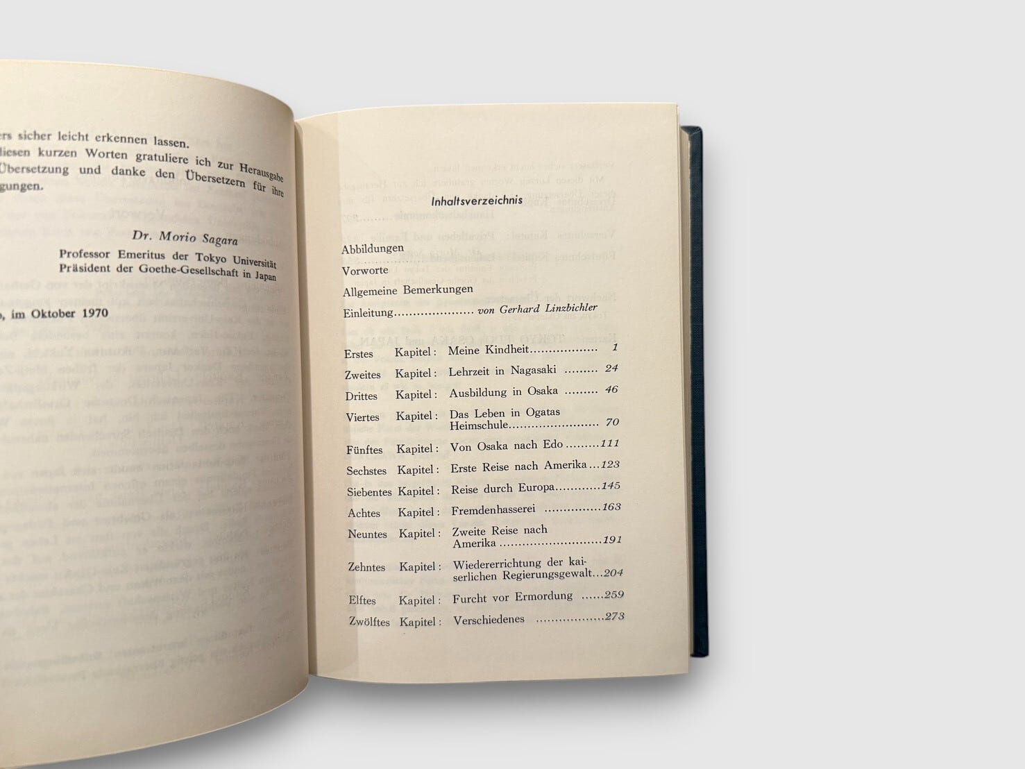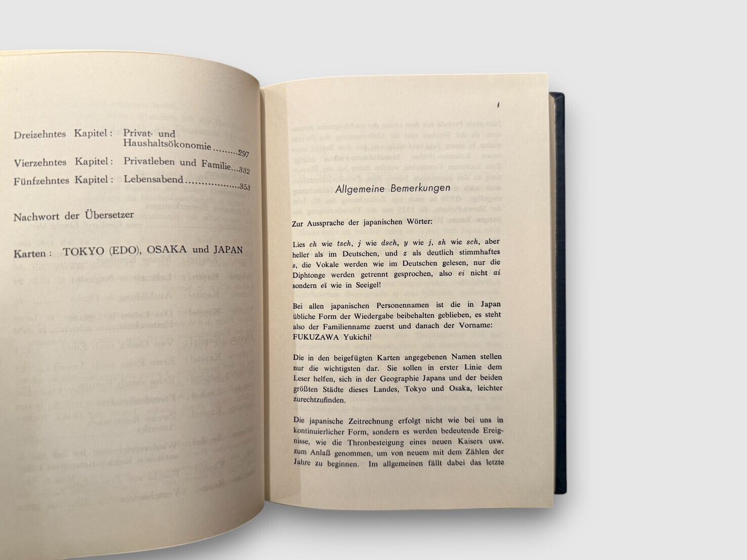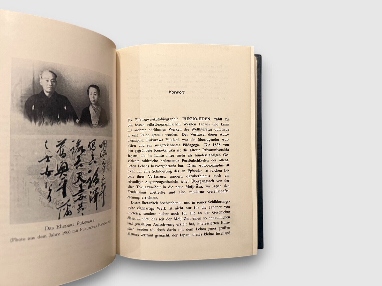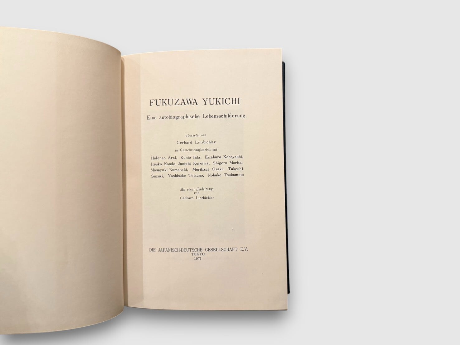 福澤諭吉による自伝『福翁自伝』を底本とし、ドイツ語で刊行された翻訳版。内容は、福澤の幼少期、蘭学・洋学修学、長崎・大阪での学問経験、欧米諸国への渡航、慶應義塾の創設、ならびに幕末から明治期にかけての社会的・知的活動を、自身の回想として構成している。1971年に東京で刊行された本書は、日独学術交流の文脈において、日本近代史・思想史をドイツ語圏へ紹介する目的で編まれたものであり、翻訳史・受容史の観点からも参照価値を有する一冊である。