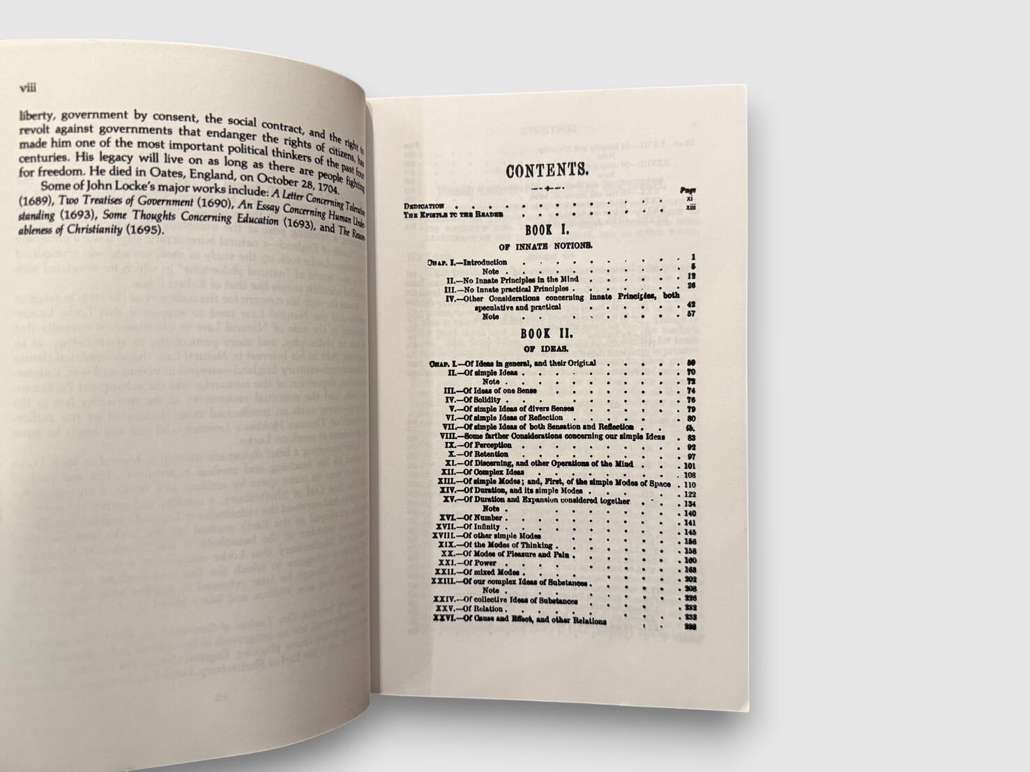 ジョン・ロックが1690年に刊行した主著『人間知性論』。本作は近代認識論の出発点として位置づけられる哲学の古典である。ロックは本書において、人間の知識はいかにして成立するのかという問いを、経験・観念・反省といった概念を用いて体系的に検討し、「生得観念」を否定する立場を明確にした。その議論は、後の経験論哲学のみならず、教育思想、政治思想、科学的方法論にまで広範な影響を及ぼしている。哲学史・思想史の基礎文献として、また原典読解の入口として、現在も読み継がれている一冊である。