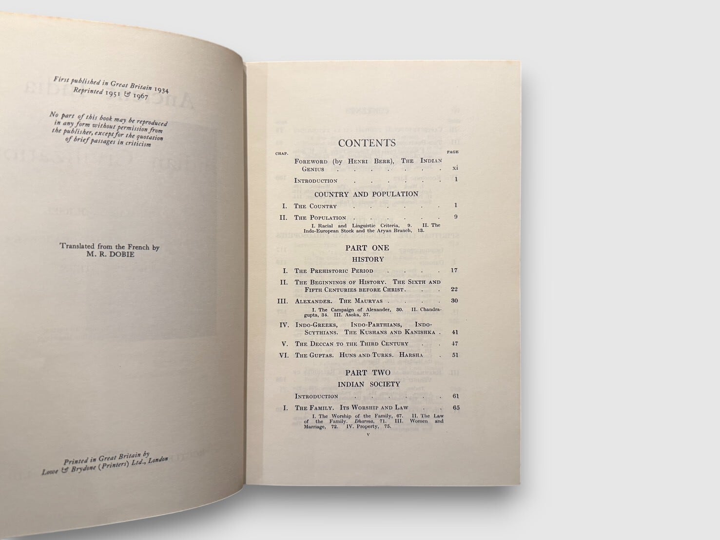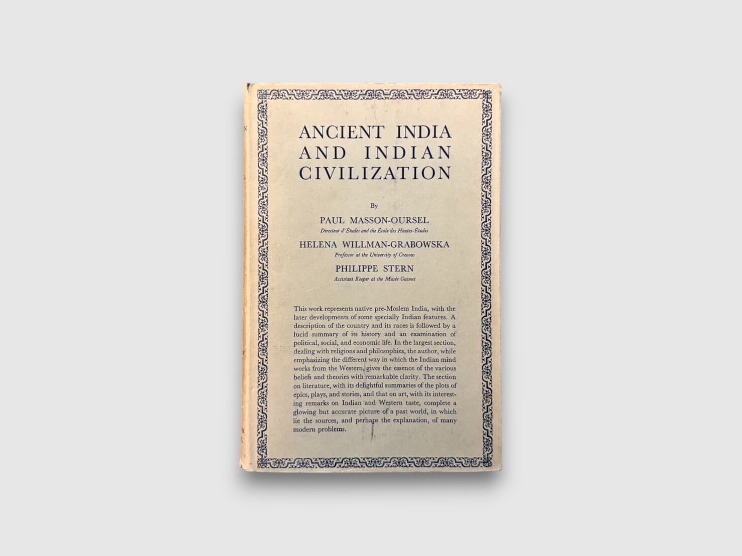 古代インド文明を歴史・社会・宗教・哲学・文学・美術の諸側面から総合的に描き出した、西洋におけるインド文明研究の古典的著作。原著はフランス語で執筆され、20世紀前半の比較文明論・宗教史研究の成果を背景に、インドという文明圏の精神構造と歴史的展開を広い視野から論じている。今日では資料的価値も高く、インド研究史を理解するうえで重要な一冊である。1967年刊行リプリント。