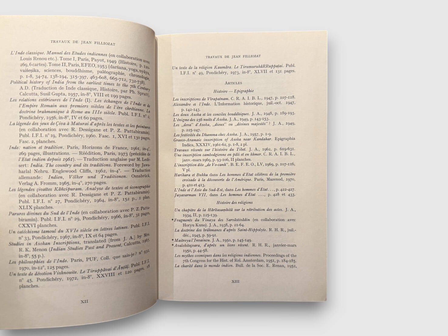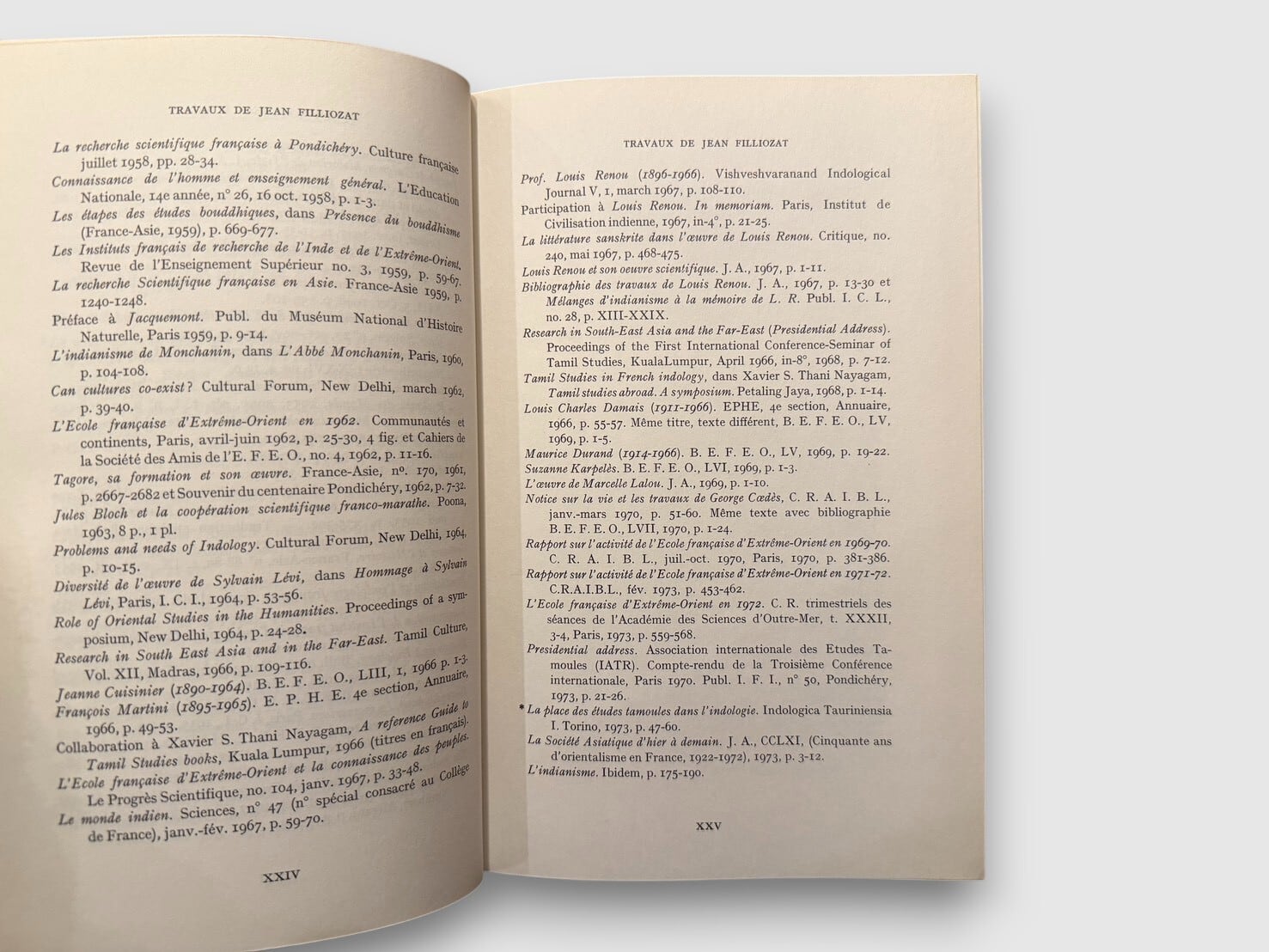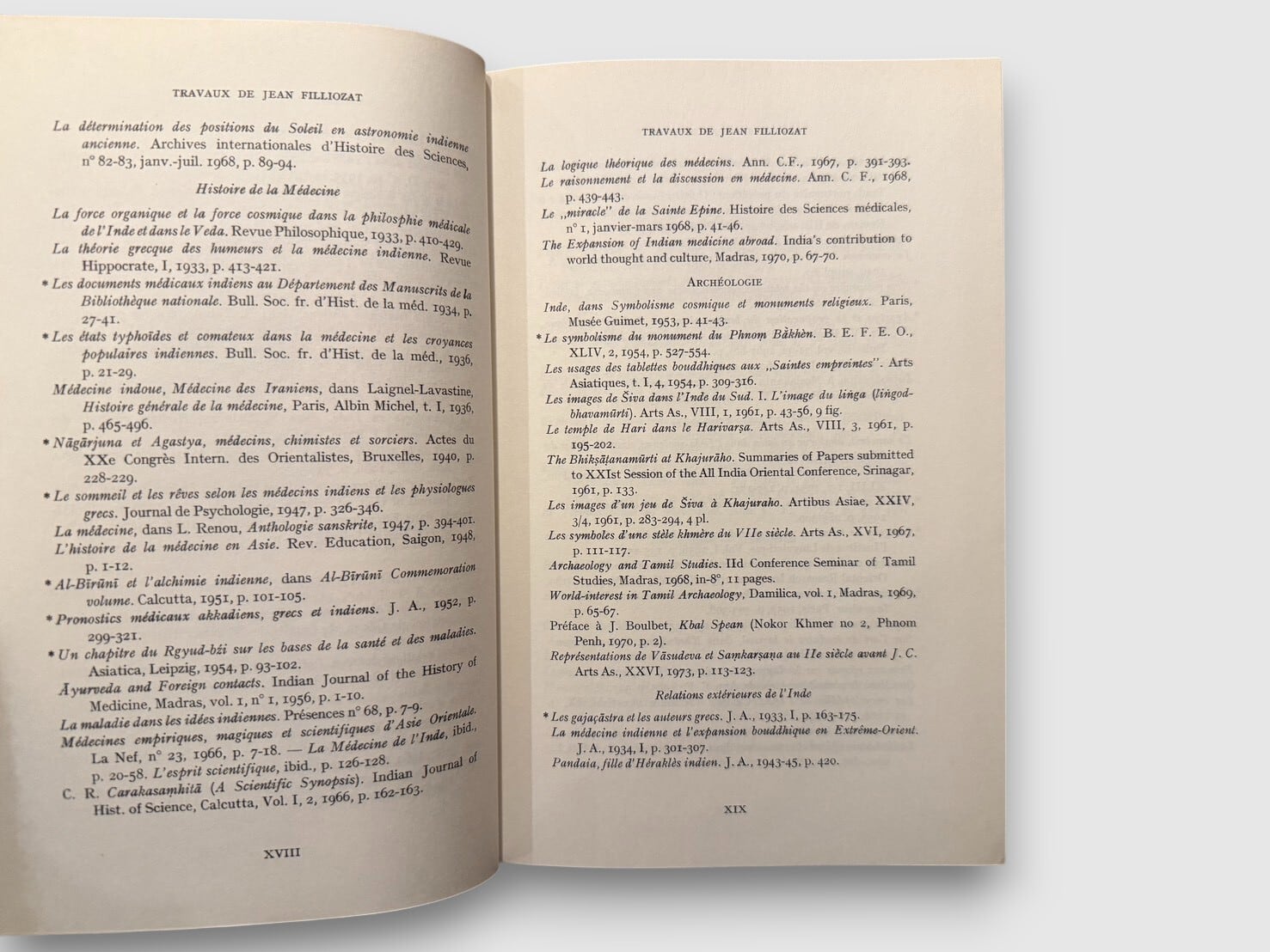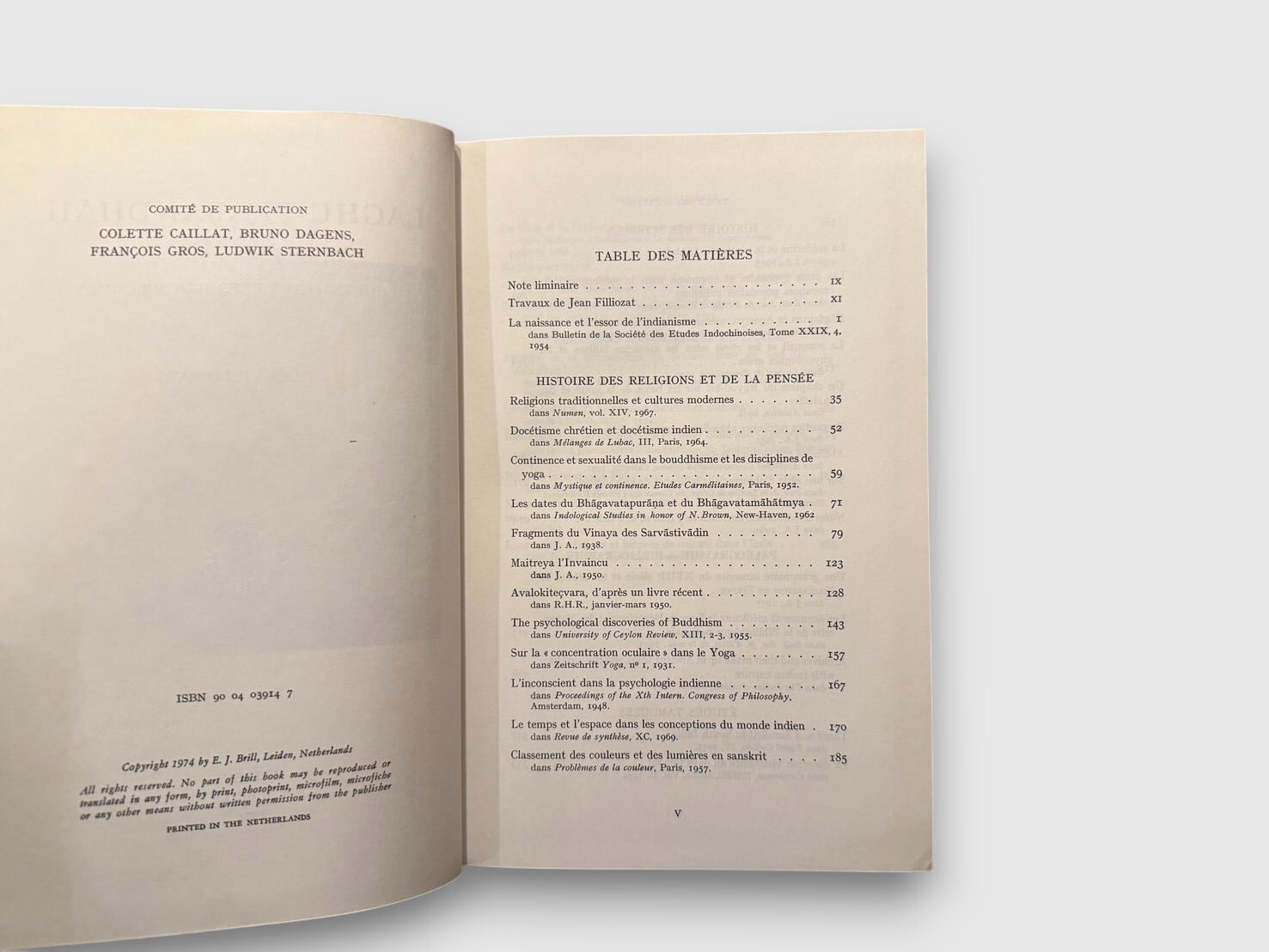 20世紀フランス・インド学を代表する学者ジャン・フィリオザ(Jean Filliozat)による主要論文を精選した論文集。1930年代から1970年代初頭にかけて発表された研究成果を中心に、インド宗教史、仏教史、ヴェーダ・ヒンドゥー思想、古代インド医学(Āyurveda)、天文学史、言語学、文献学、写本研究など、極めて広範な領域を横断的に収録している。1974年刊行初版。