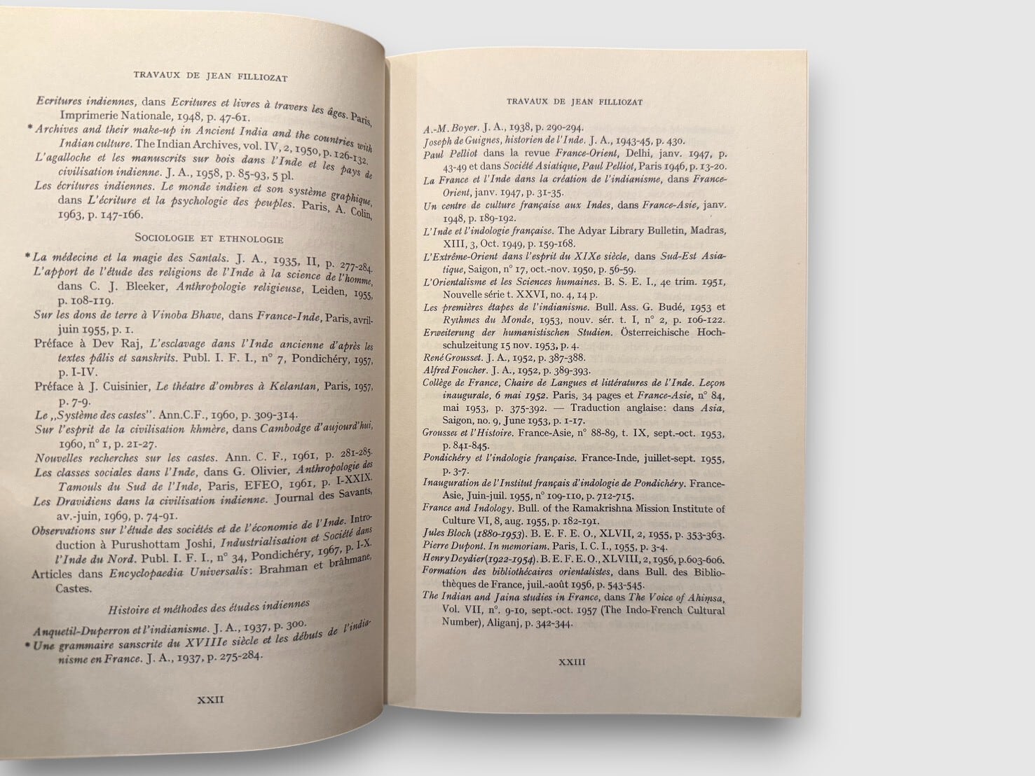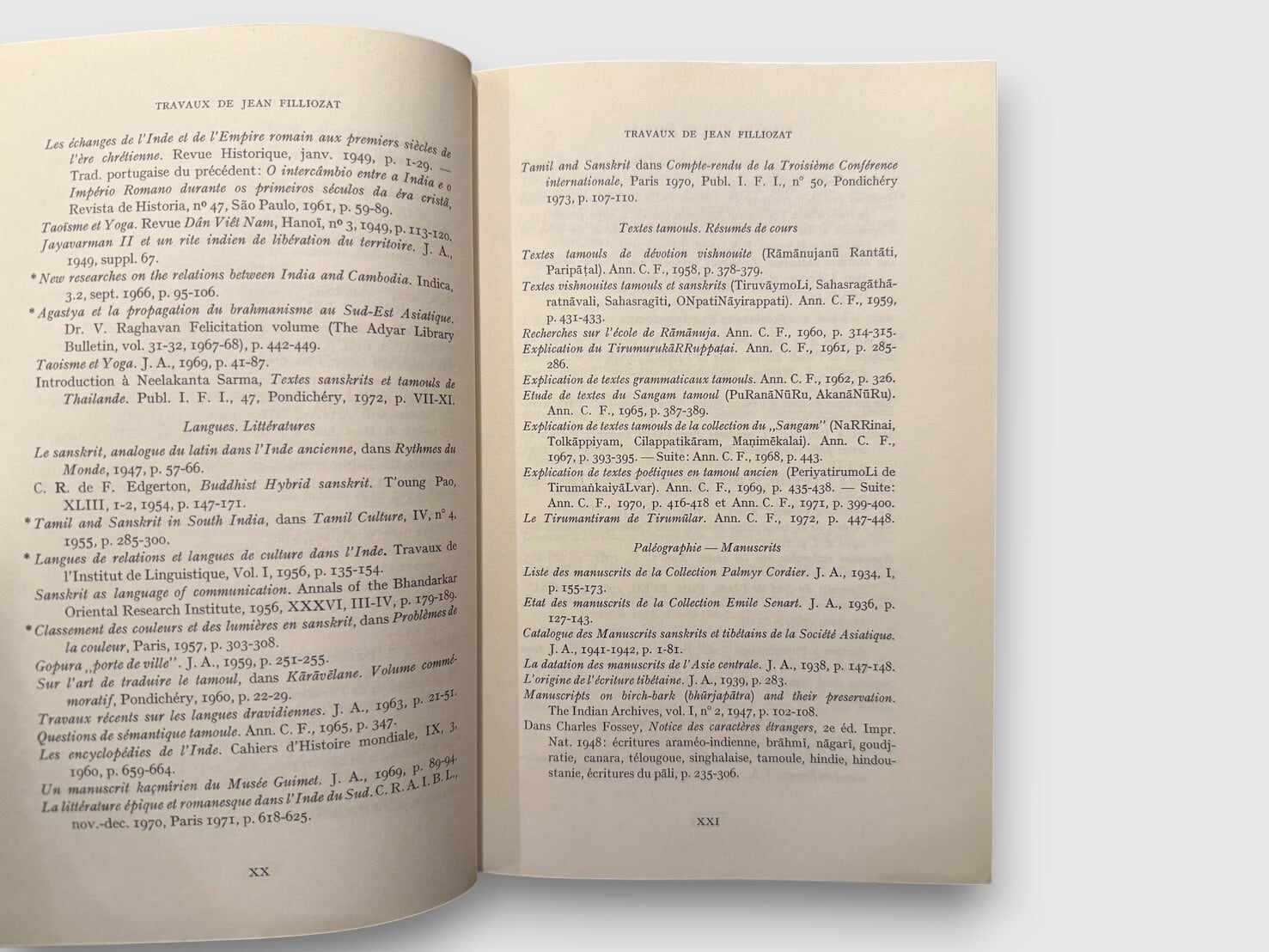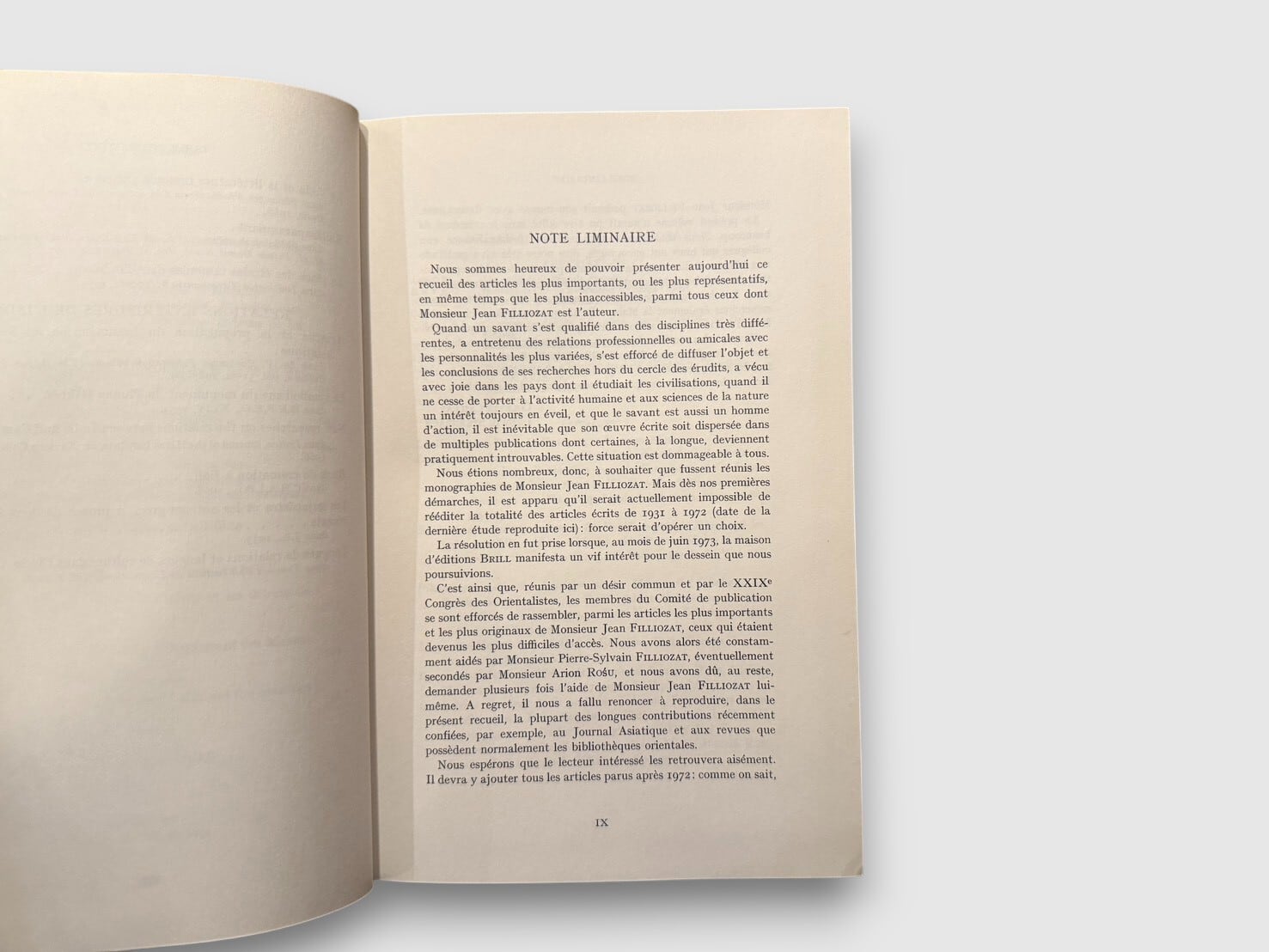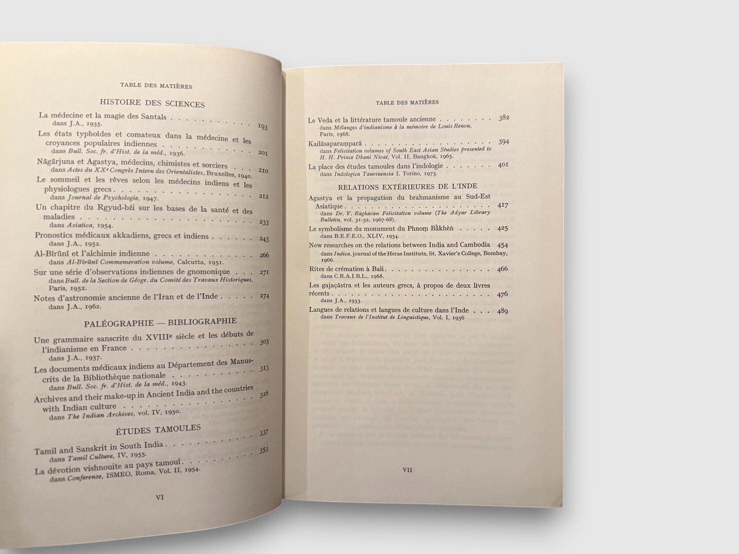 20世紀フランス・インド学を代表する学者ジャン・フィリオザ(Jean Filliozat)による主要論文を精選した論文集。1930年代から1970年代初頭にかけて発表された研究成果を中心に、インド宗教史、仏教史、ヴェーダ・ヒンドゥー思想、古代インド医学(Āyurveda)、天文学史、言語学、文献学、写本研究など、極めて広範な領域を横断的に収録している。1974年刊行初版。