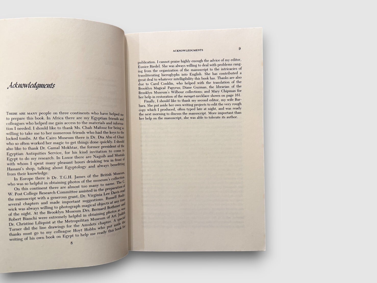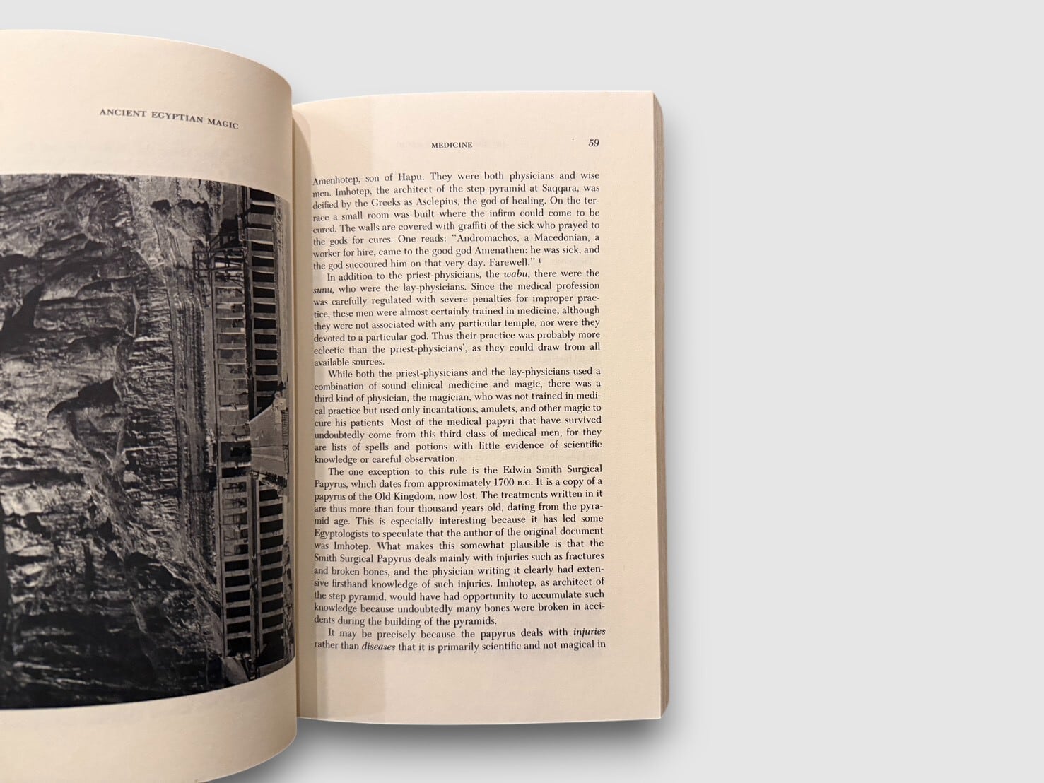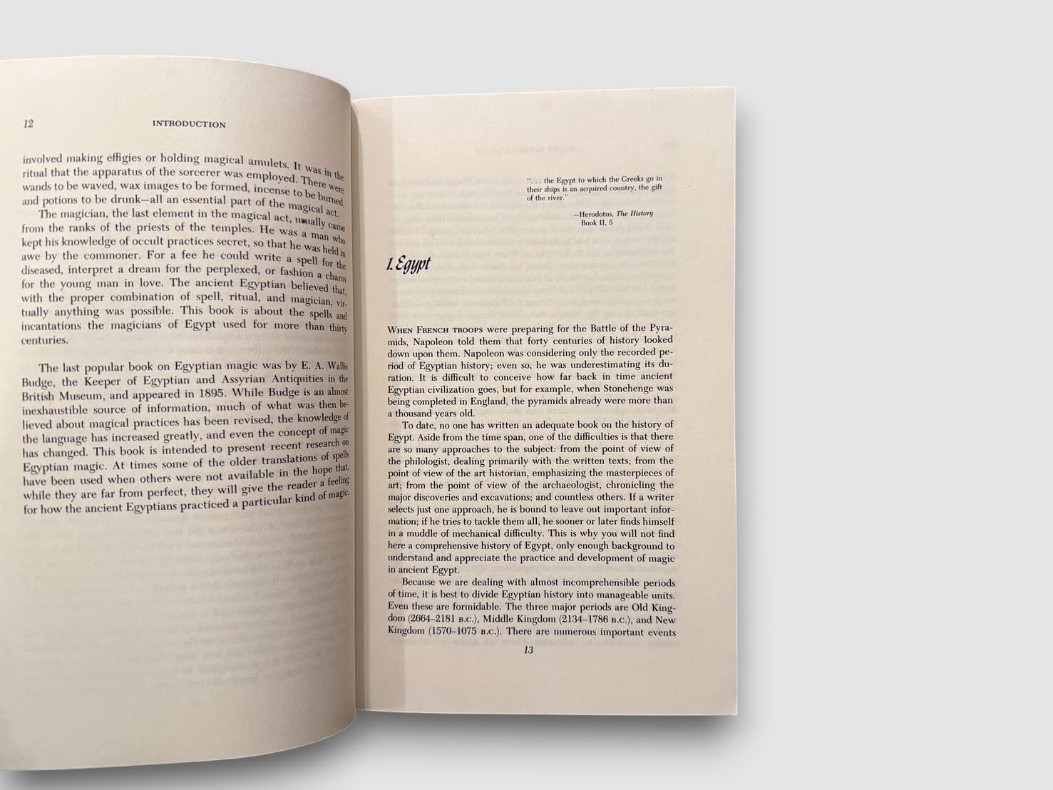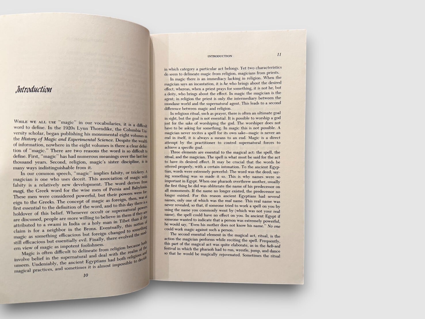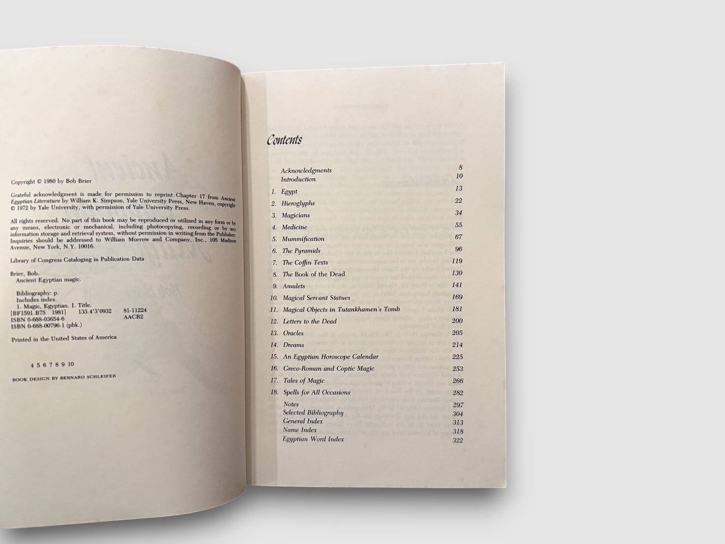 古代エジプトにおける「魔術(magic)」を、呪文・護符・治療・死者儀礼などの具体的な実践からたどる解説書。ヒエログリフ、魔術師の役割、医療、ミイラ化、ピラミッド、棺文、死者の書、護符、死者への手紙、夢判断、占い、暦、さらにグレコ=ローマ期やコプト期の魔術まで、章立てで広く扱う構成になっている。神秘としての“魔法”に寄せるよりも、当時の生活や宗教世界の中で、これらがどのように機能していたかを具体例で示していく一冊といえるだろう。