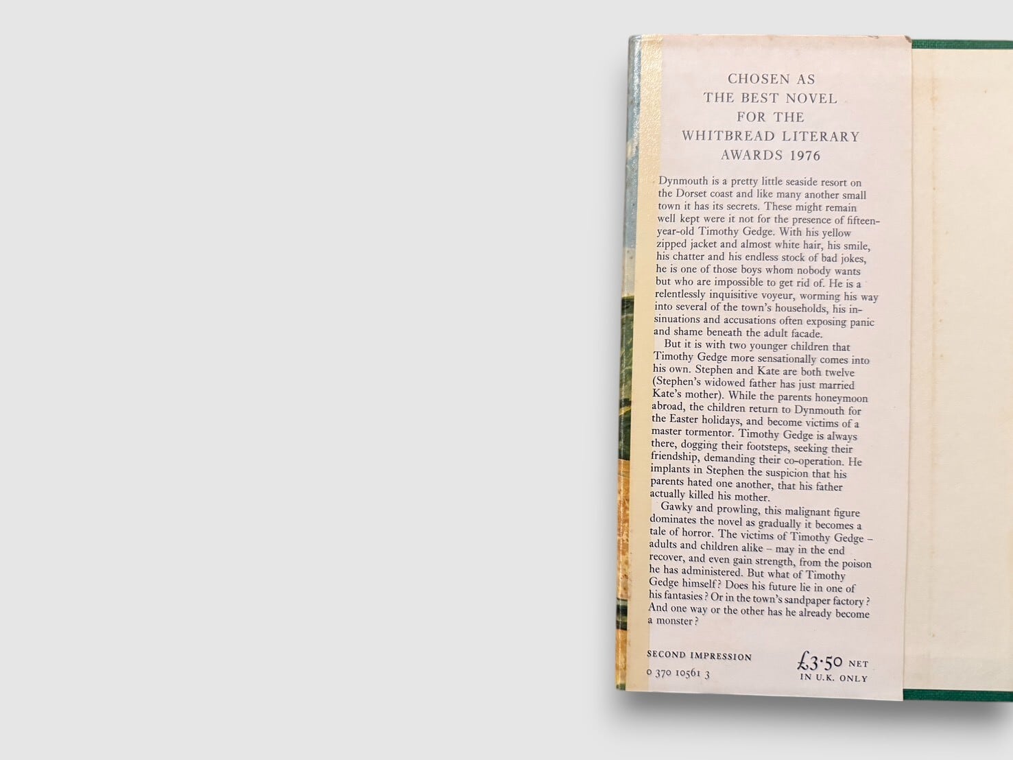 アイルランド文学を代表する作家の一人、ウィリアム・トレヴァーの長篇小説。舞台はドーセット海岸の架空の保養地ダインマス。平穏に見える町に、少年ティモシー・ゲッジがもたらす不穏な影が、少しずつ日常を侵食していく。物語は派手な事件を避けながら、噂、疑念、沈黙が積み重なる過程を緊張感をもって描き出す。トレヴァーの抑制された語りは、善悪を単純化せず、共同体の脆さと残酷さを静かに照らす。作家の円熟に向かう重要な到達点を示す一冊。