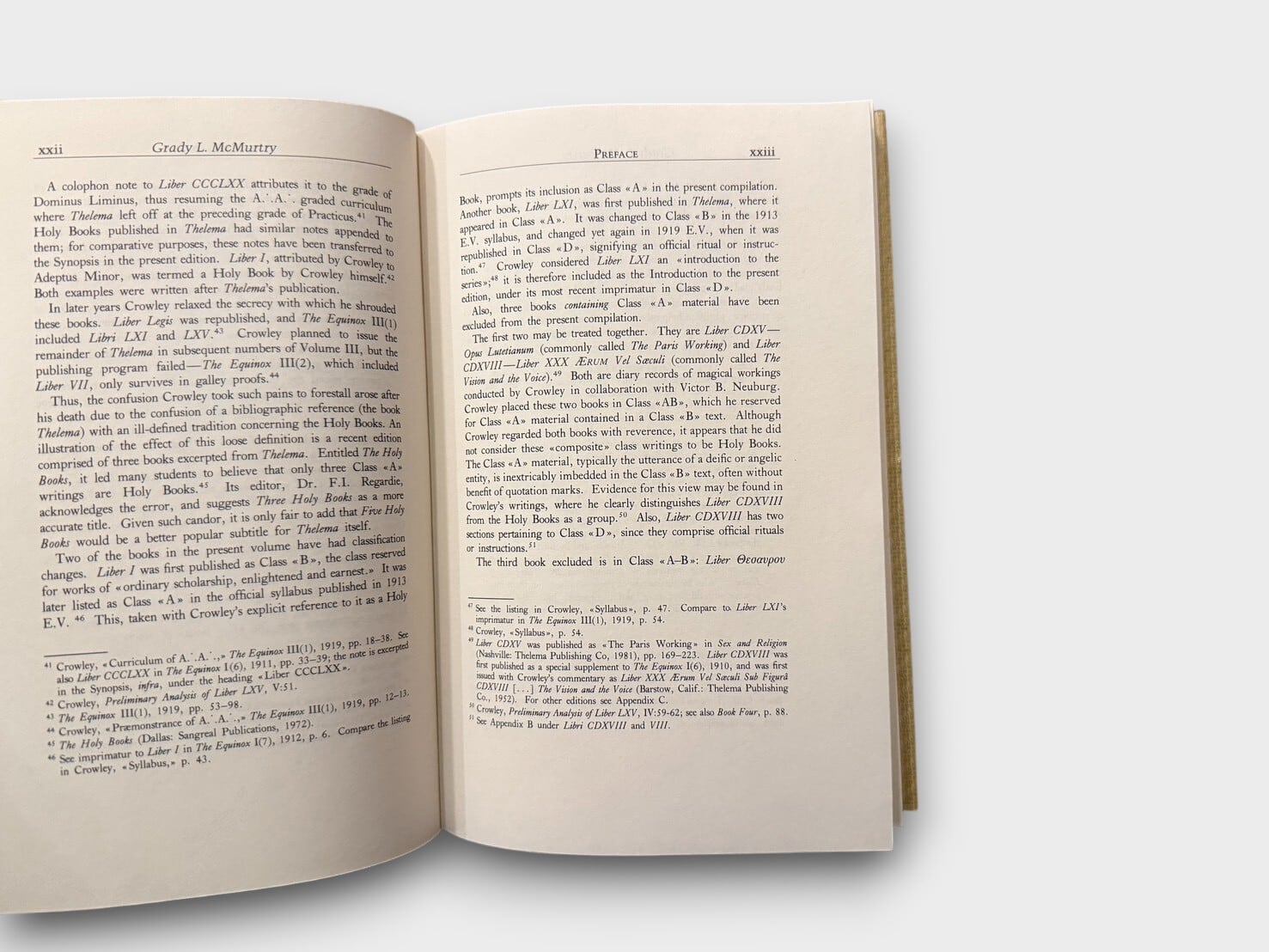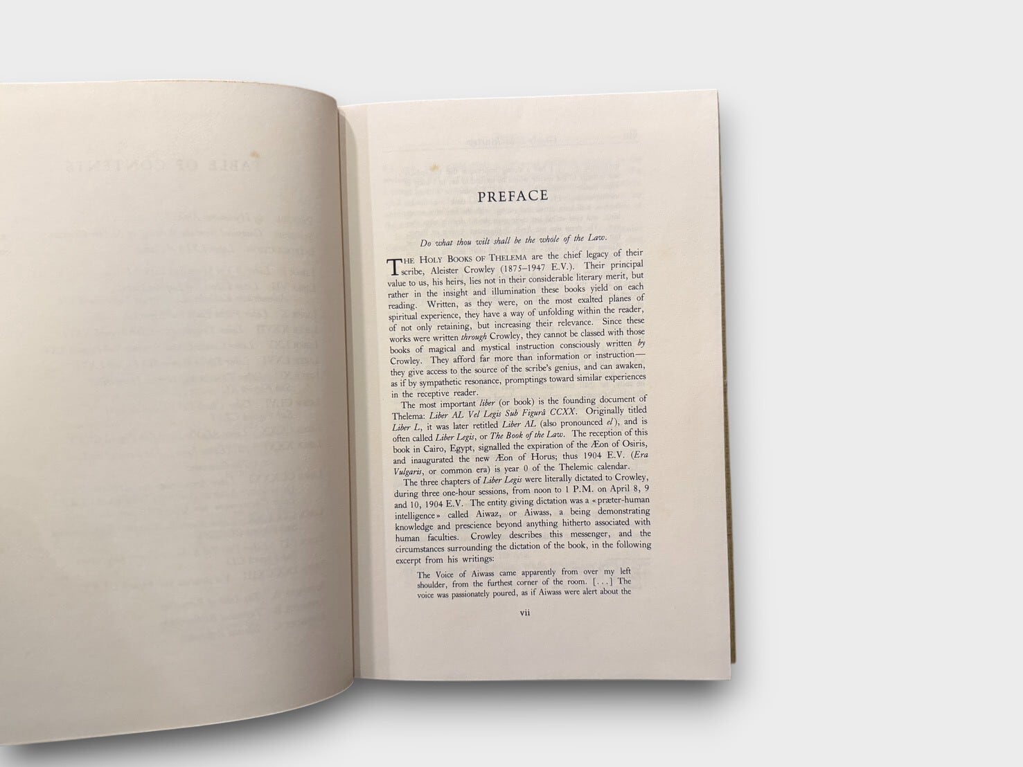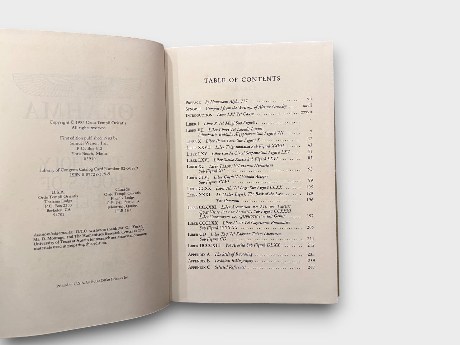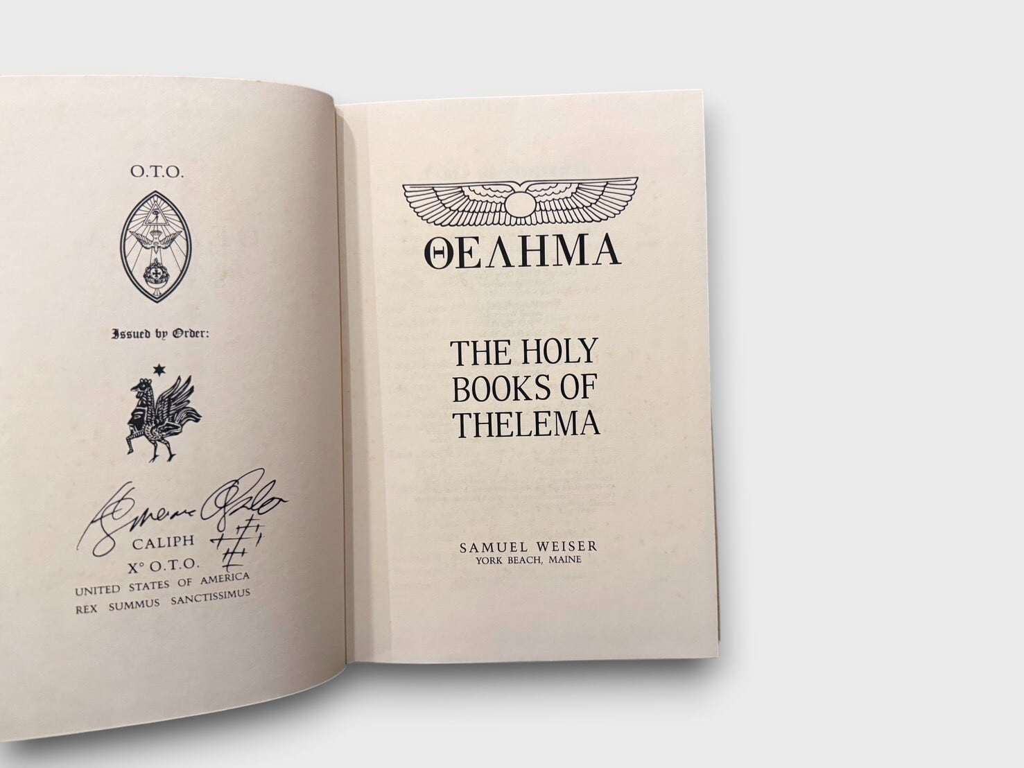 20世紀オカルティズムを決定づけた思想家・詩人、アレイスター・クロウリー(1875–1947)が「霊感によって受け取った」とされるテレマの聖典群、いわゆる Holy Books of Thelema を、初めて広く流通する形で一冊にまとめた編集版。単なる神秘文献の集成にとどまらず、20世紀オカルティズムにおける「啓示」「作者性」「編集」という問題を考える上で、重要な参照点の一つとされてきた書物である。1983年に刊行されたSamuel Weiser版初版。