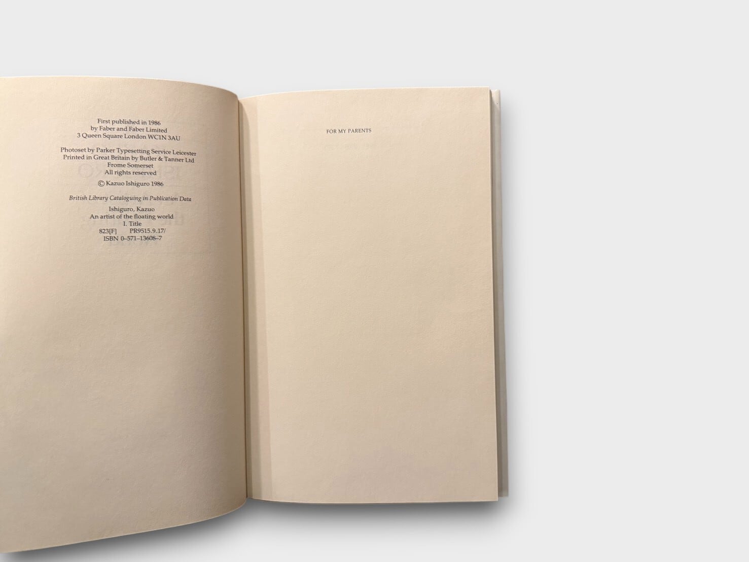 カズオ・イシグロの長編小説。戦後日本を舞台に、かつて名声を得た画家が自らの過去と向き合う語りを通して、記憶、責任、自己正当化の揺らぎが描かれる。語りの不確かさと沈黙の使い方は、後年の作品へと連なるイシグロ文学の基調をすでに示している。1986年に Faber and Faber より刊行された初版。