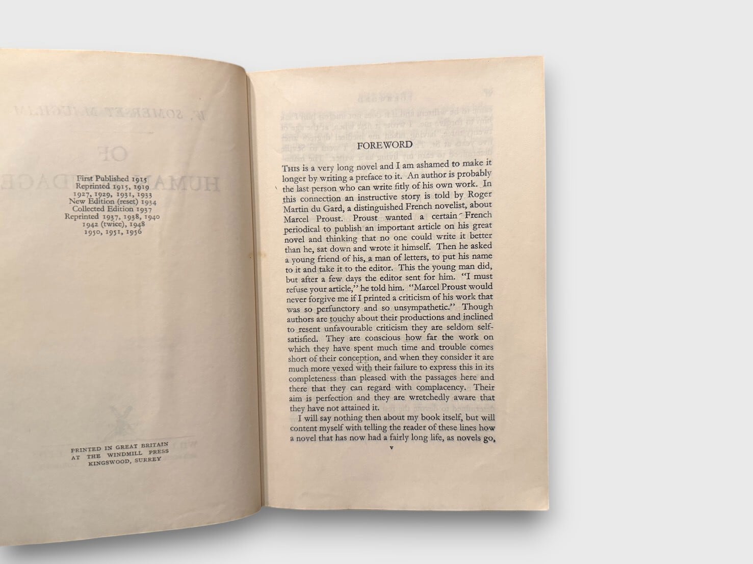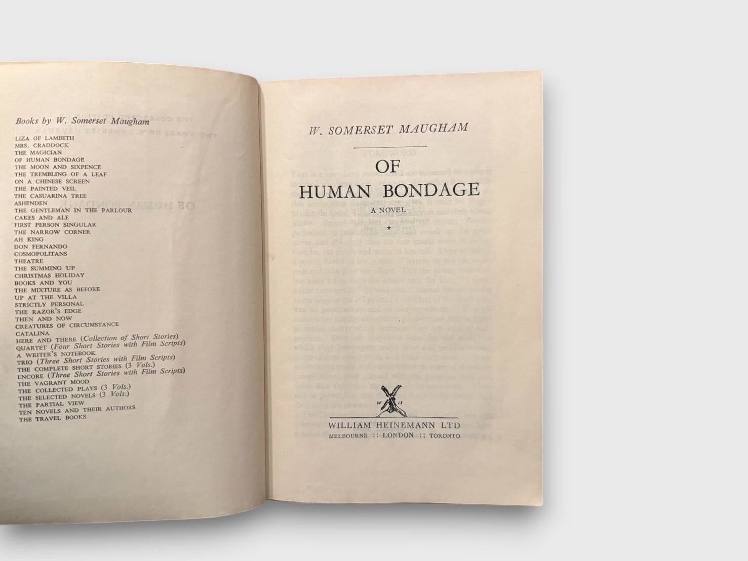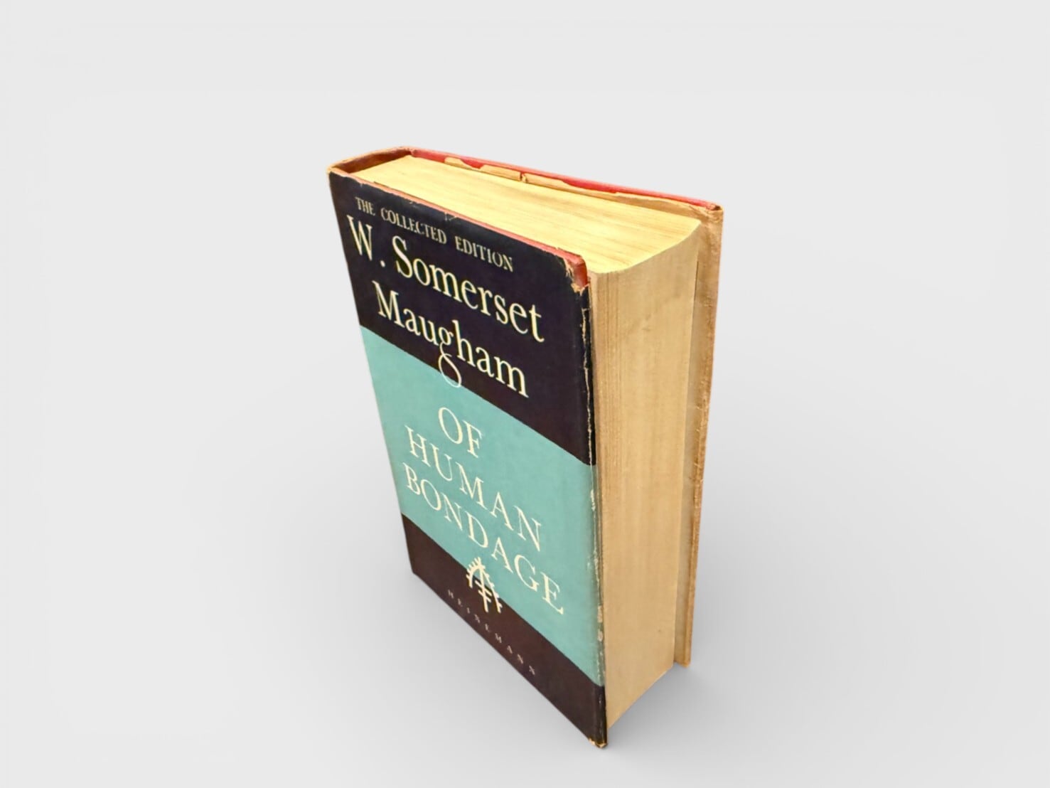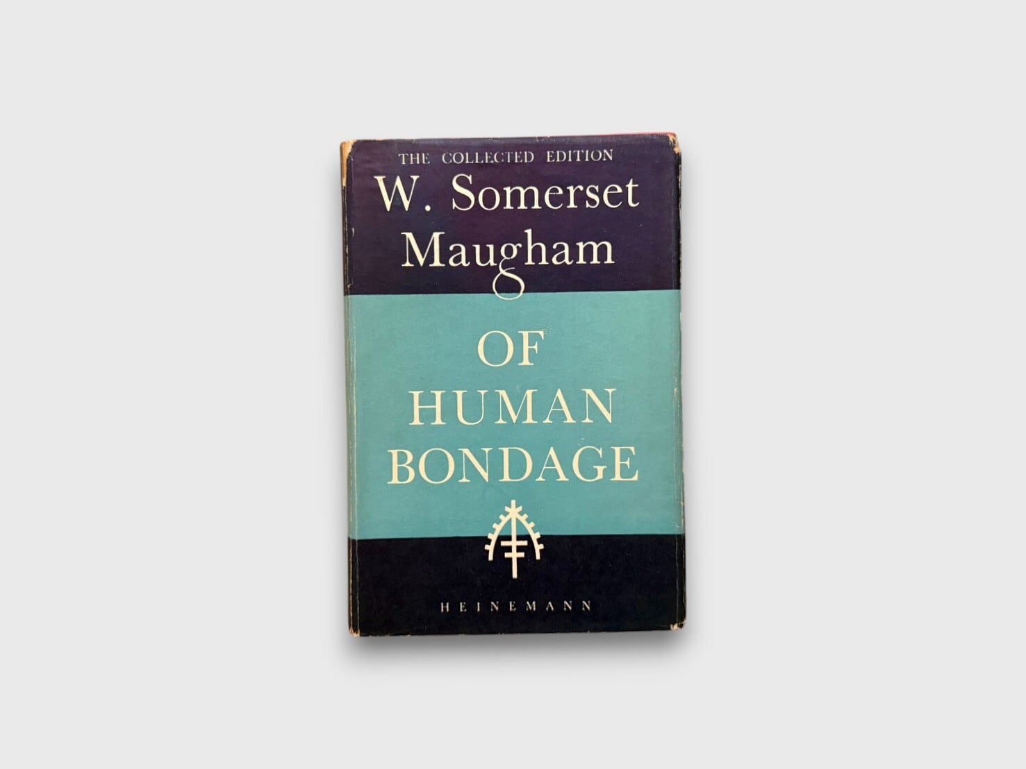 モームの代表作にして、20世紀英文学を象徴する長編小説『人間の絆』。主人公フィリップの精神的遍歴を通して描かれるのは、愛、屈辱、芸術、挫折、そして「生きる意味」への問いである。自伝的要素を含みながら、冷静な観察眼と皮肉を湛えた筆致で人間の弱さを描き切る。1915年初版刊行。本書は1937年より刊行されたCollected Editionの1956年リプリントにあたる。戦後期Heinemann版らしい落ち着いた装丁で、コレクション性の高い一冊。