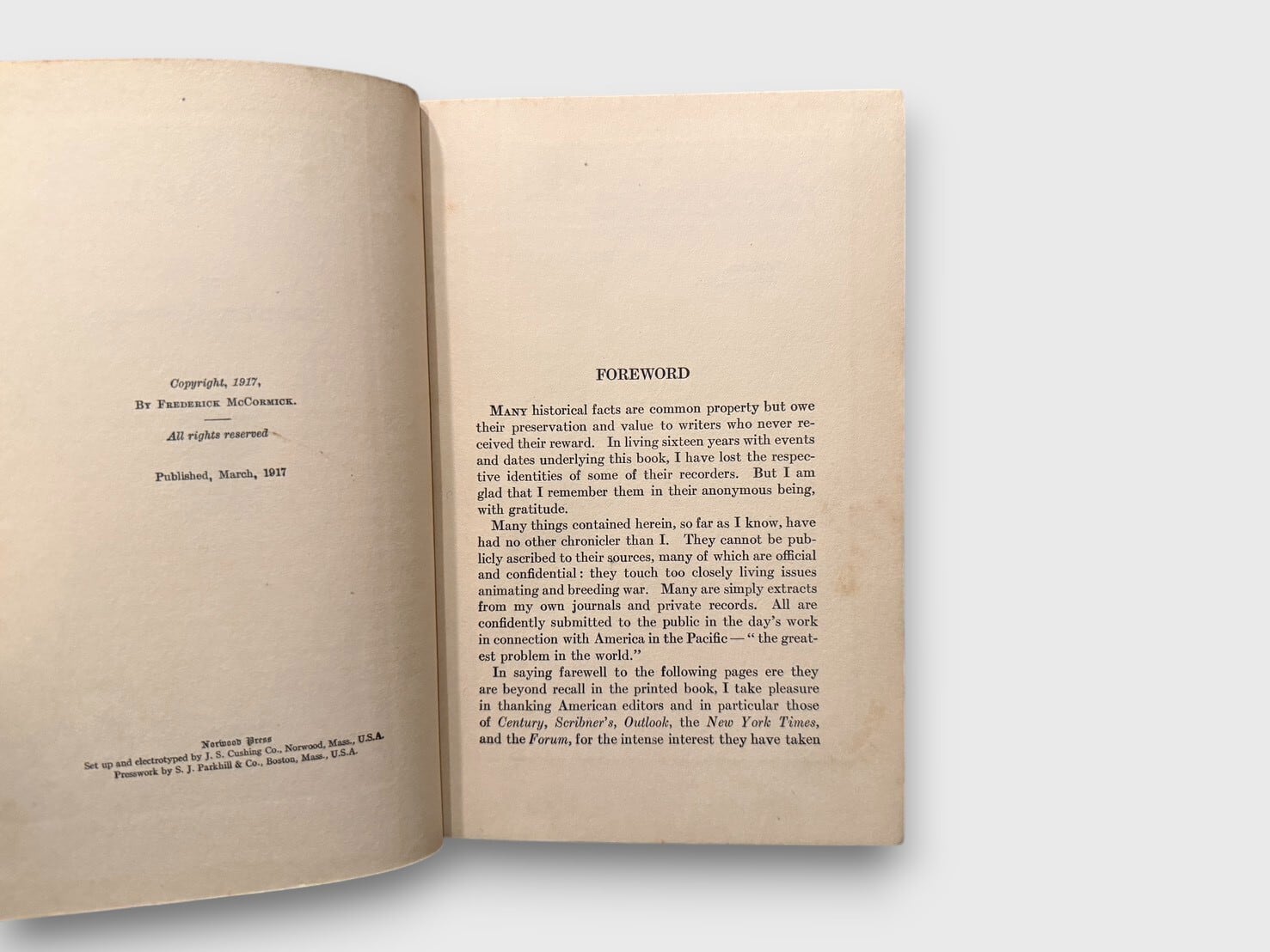 第一次世界大戦期の国際情勢を背景に、日本の台頭と太平洋地域における勢力均衡を論じた同時代的著作。著者Frederick McCormickは、ロシア・満州・東アジア情勢に通じたジャーナリストであり、本書では日露戦争後から第一次大戦期にかけての日本の外交・軍事的動向を詳細に分析している。1917年刊行の初版であり、戦時下アメリカから見た東アジア観を示す資料的価値を持つ一冊である。