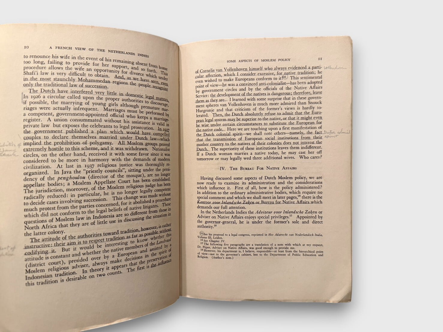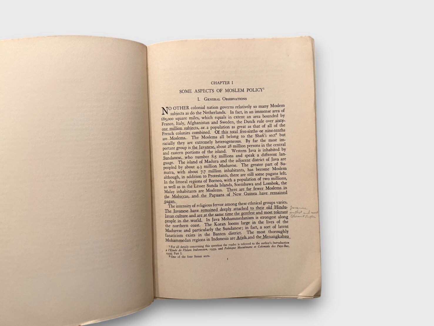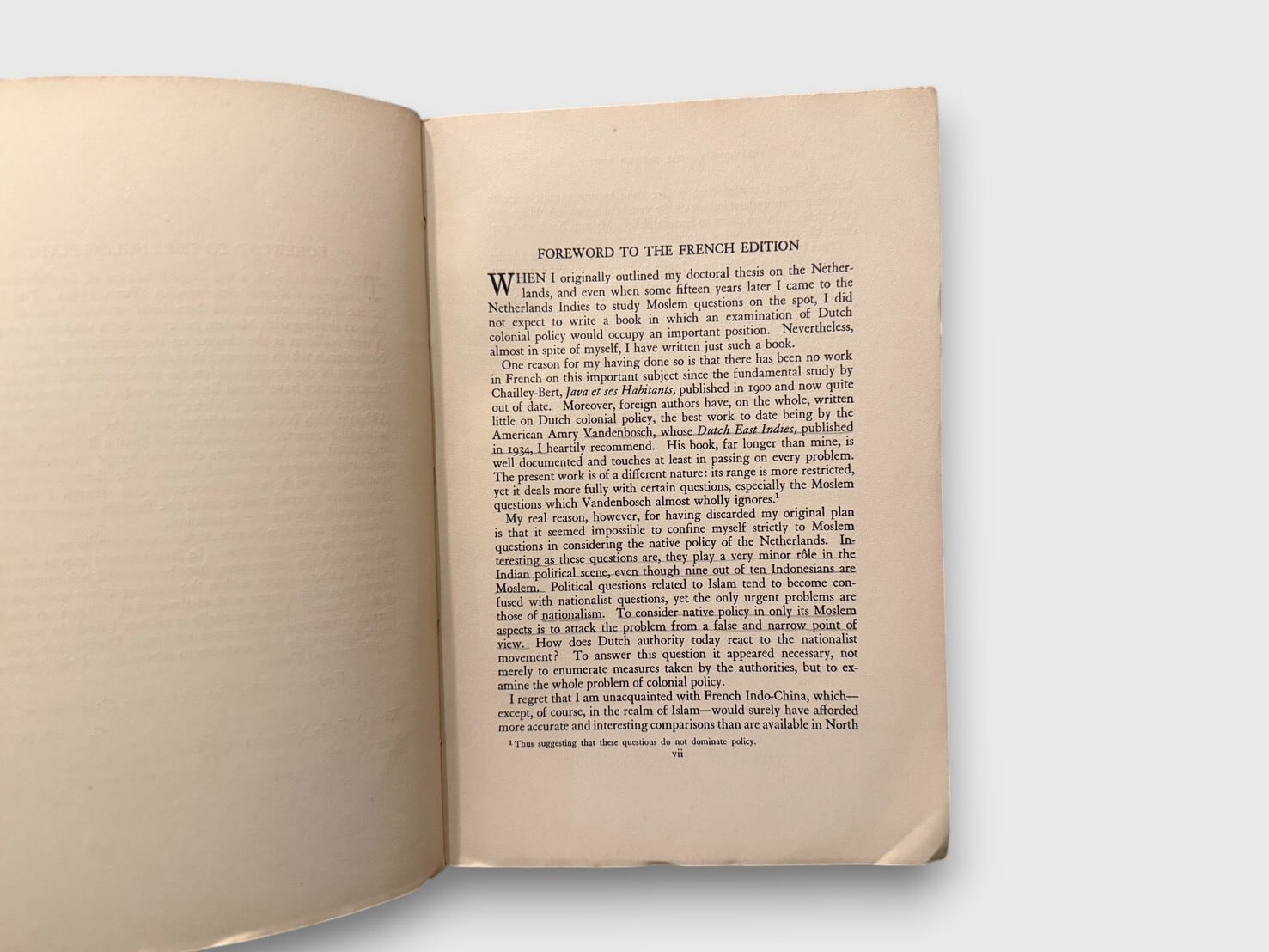 フランス人研究者G. H. Bousquetによるオランダ領東インド(現インドネシア)の植民地政策研究の英語版。。本書はPhilip E. Lilienthalによる英訳版で、Institute of Pacific Relationsの後援のもと1940年に上海で刊行された。内容は主にオランダのイスラム政策、民族運動、植民地統治構造を分析したものであり、第二次世界大戦直前期の東南アジア情勢を理解する上で重要な同時代資料である。上海刊行という出版地の特異性も含め、戦前期の国際的知的ネットワークを示す学術的価値の高い一冊である。