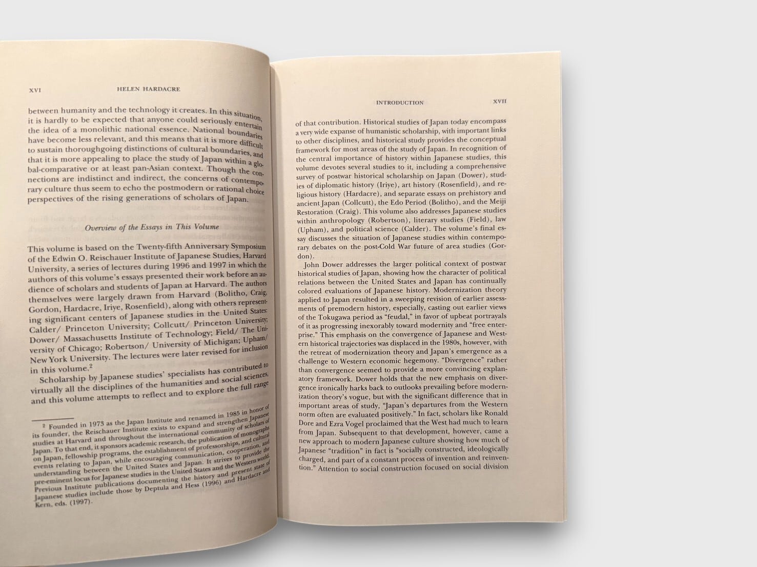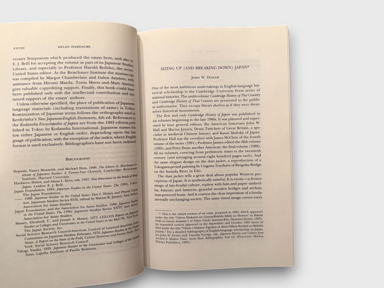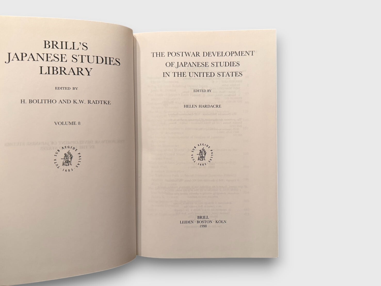 Brill’s Japanese Studies Library(Vol. 8)として刊行された、日本研究の学術史に関する論集。編者は宗教学・日本宗教研究で知られるHelen Hardacre。第二次世界大戦後のアメリカにおける日本研究の制度的発展、方法論の変遷、各分野(歴史・文学・宗教・人類学・政治学・法学など)の展開を、多数の研究者による論考で総括する。戦後の冷戦構造、近代化論、ポストモダン批評、エリアスタディーズ論争といった理論的背景を踏まえ、日本研究という学問領域がどのように形成され、変容してきたかを俯瞰する一冊である。1998年刊行初版。