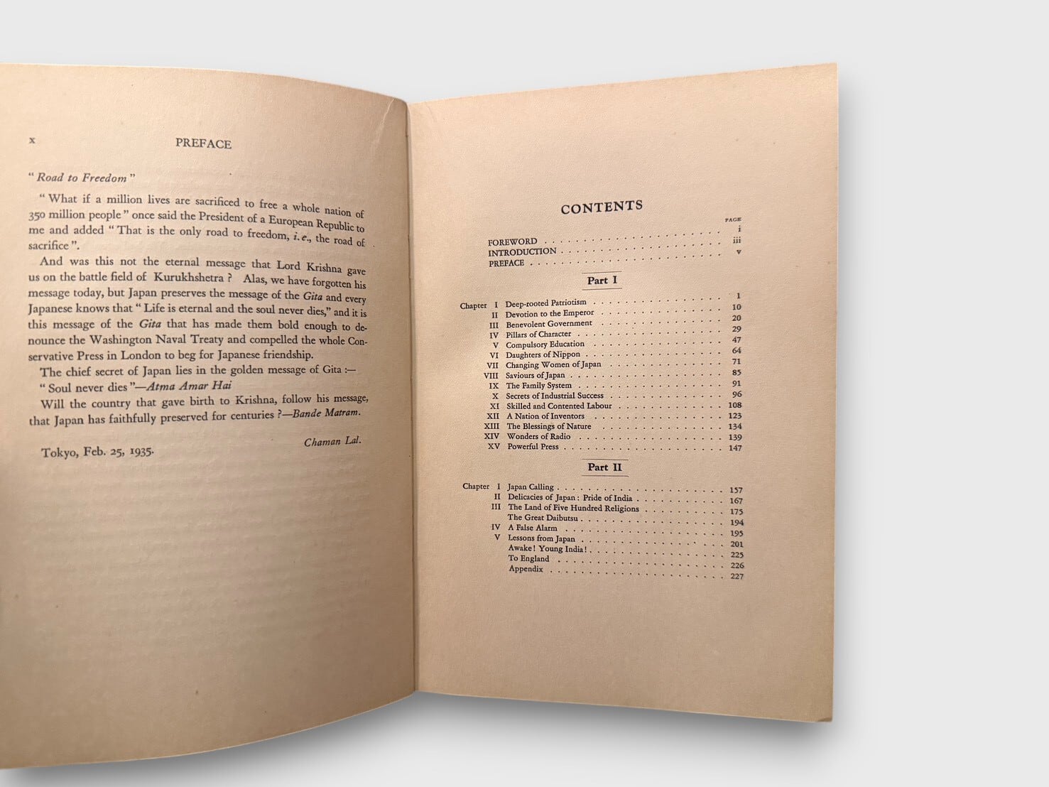 インド人著者 Chaman Lal による、日本論。副題に “Through Indian Eyes” とある通り、日本の近代的発展をインドの知識人の視点から論じた一冊である。日本の産業発展、教育制度、国民性、国家意識などを論じつつ、当時のアジア的連帯や反植民地主義的文脈を背景に、日本の近代化を肯定的に紹介する構成となっている。本文中には写真図版を多数収録。1930年代の日本像を、インド知識人の視点から捉えた一次資料としての価値を持つ。戦前期アジアにおける思想交流・国際認識史を考察するうえで重要な資料である。1935年刊行推定初版。
