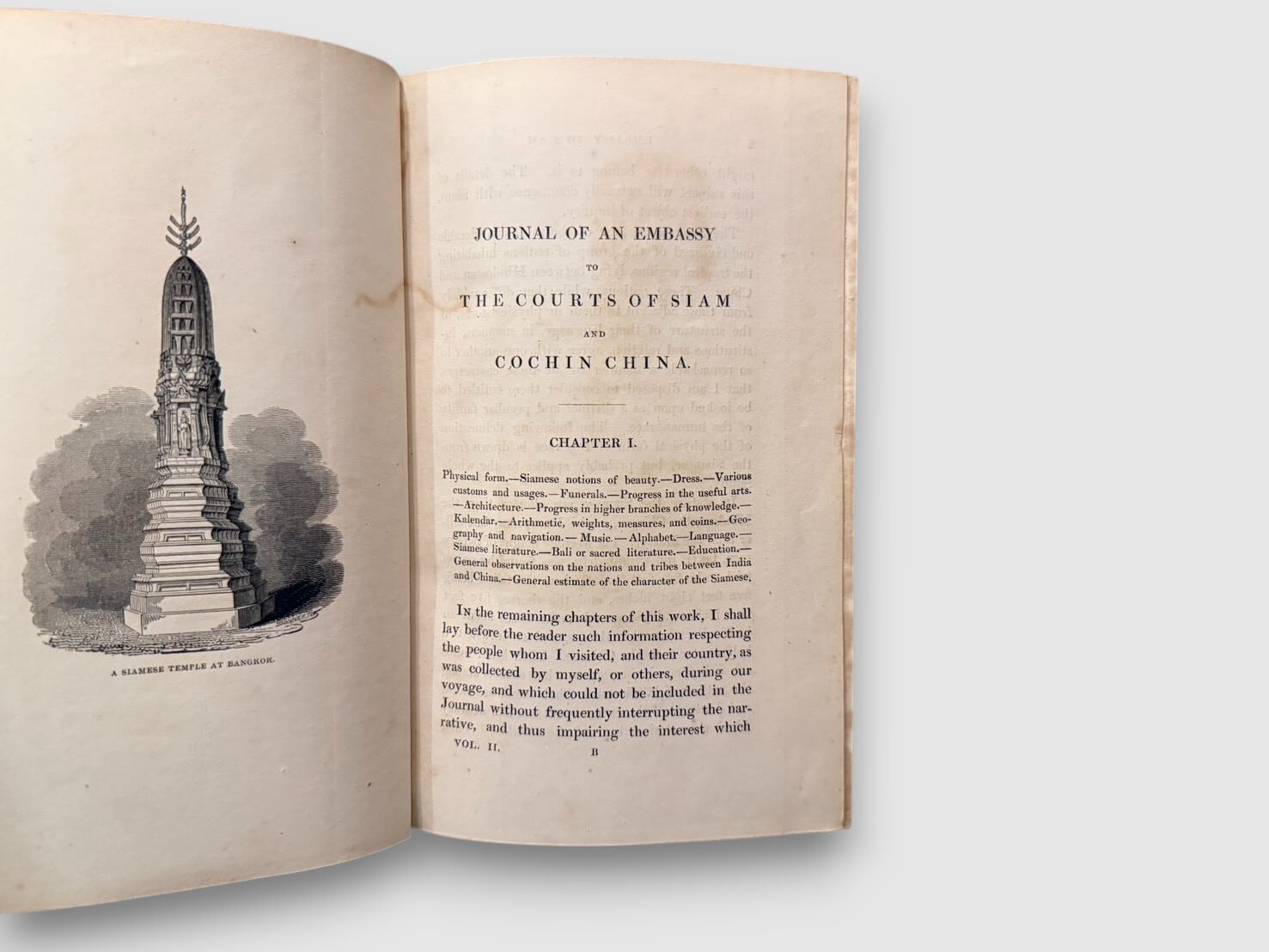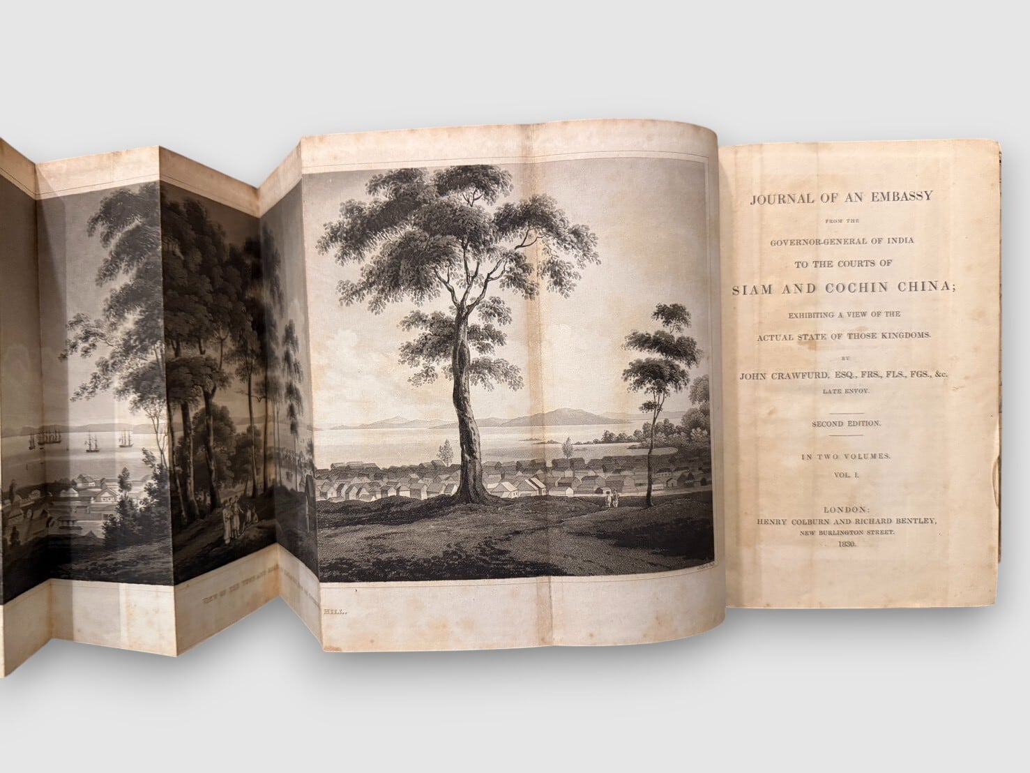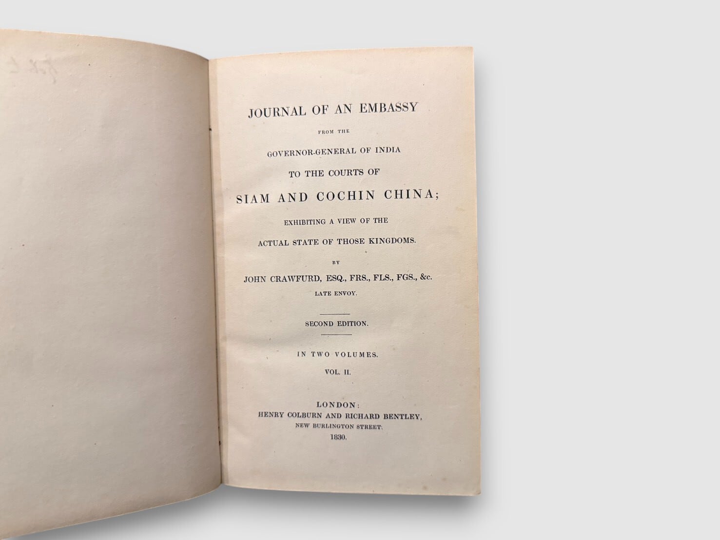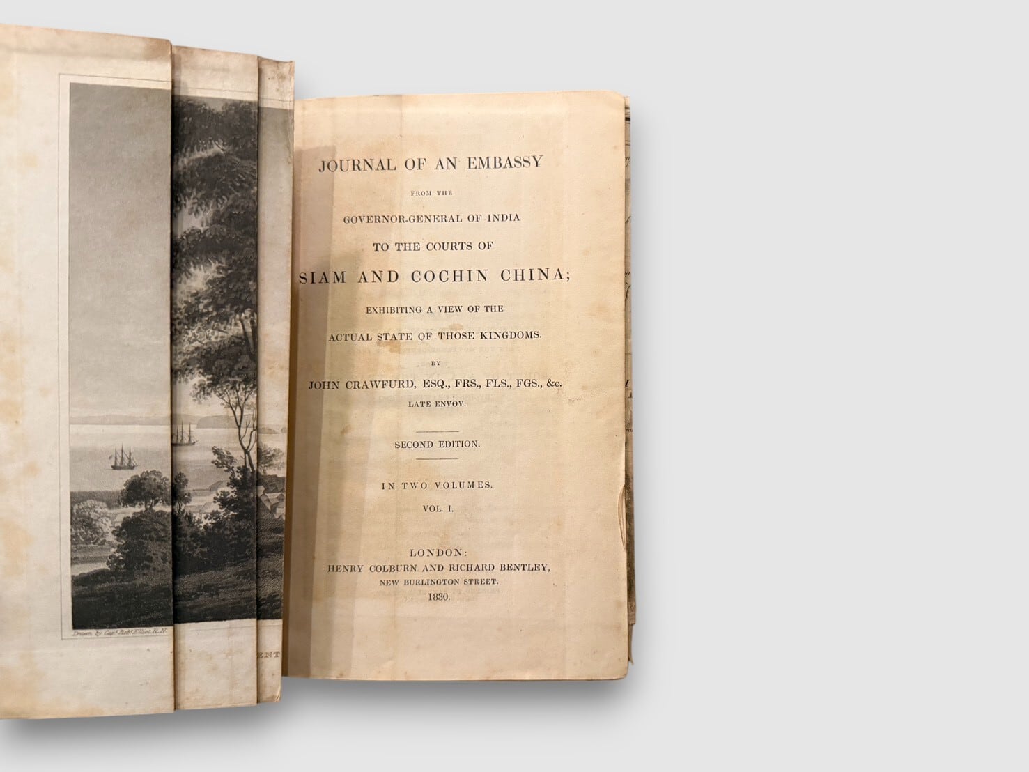 イギリス東インド会社の外交使節として派遣された John Crawfurd による公式報告記録。シャム(現タイ)およびコーチン・チャイナ(現ベトナム南部)への外交使節の経過、政治状況、交易、社会制度、宗教、自然環境などを詳細に記録する。当時のバンコク、シンガポール、シャム宮廷の視覚資料としても参照される図版多数収録。19世紀初頭の英語圏における東南アジア認識を示す非常に貴重な全2巻揃。1830年刊行第2版。