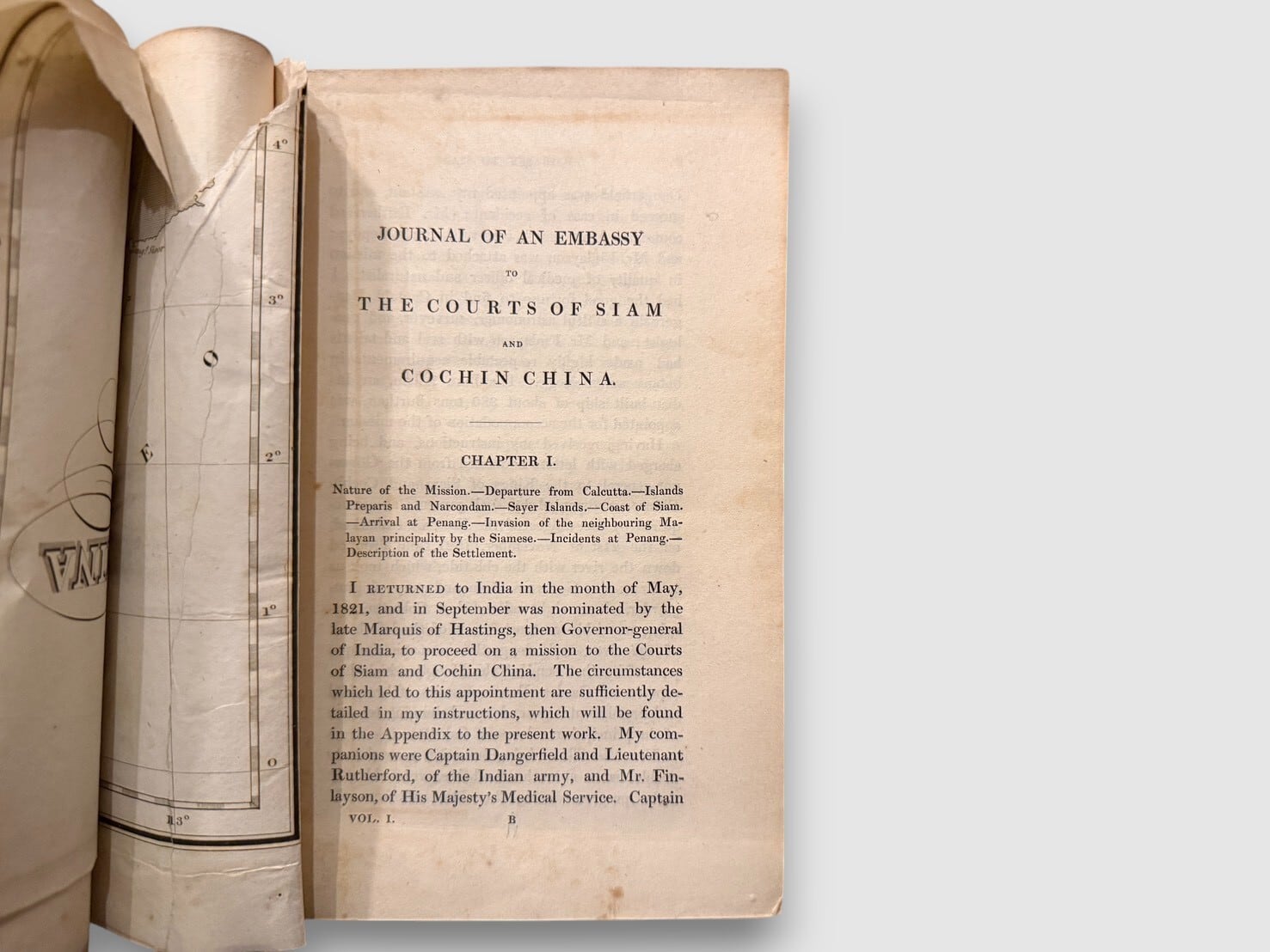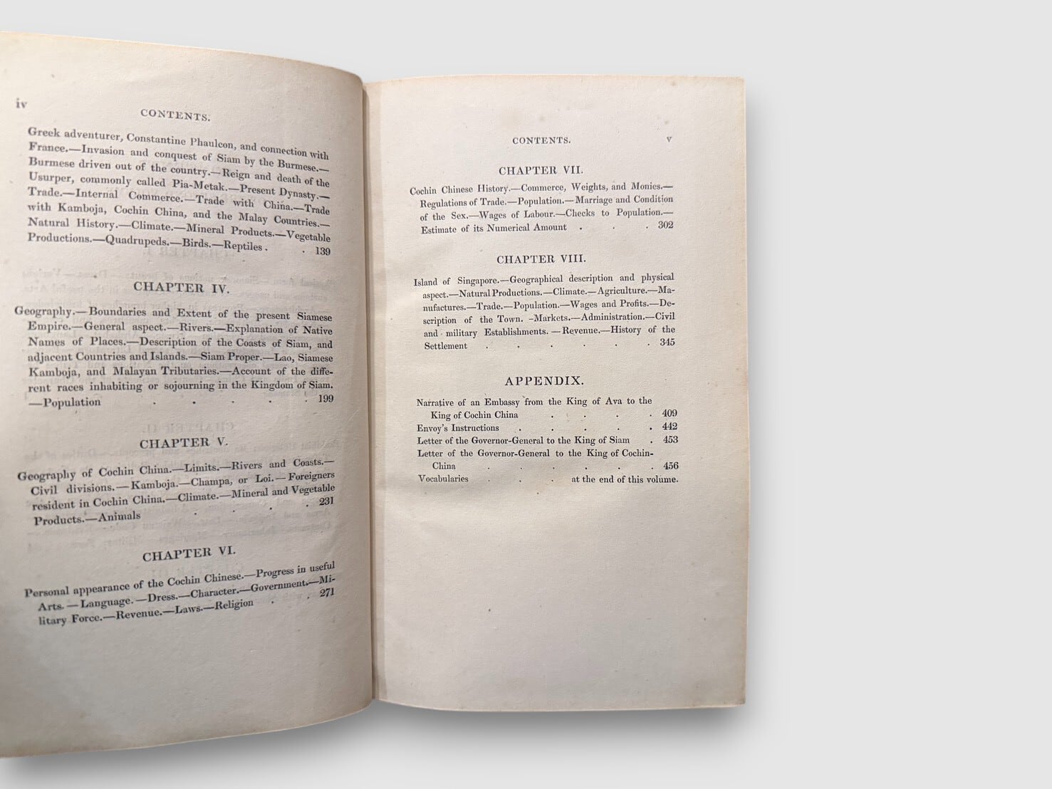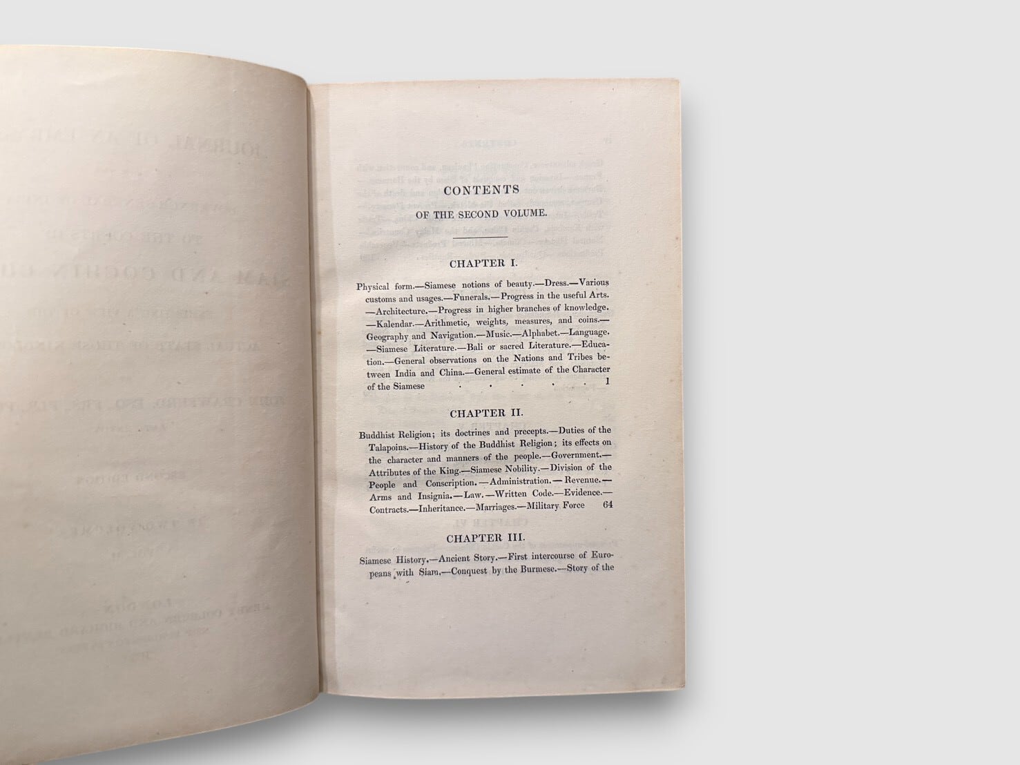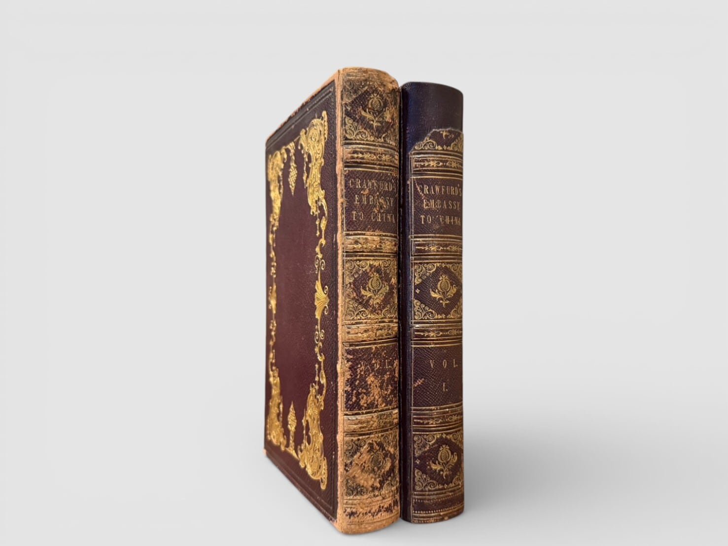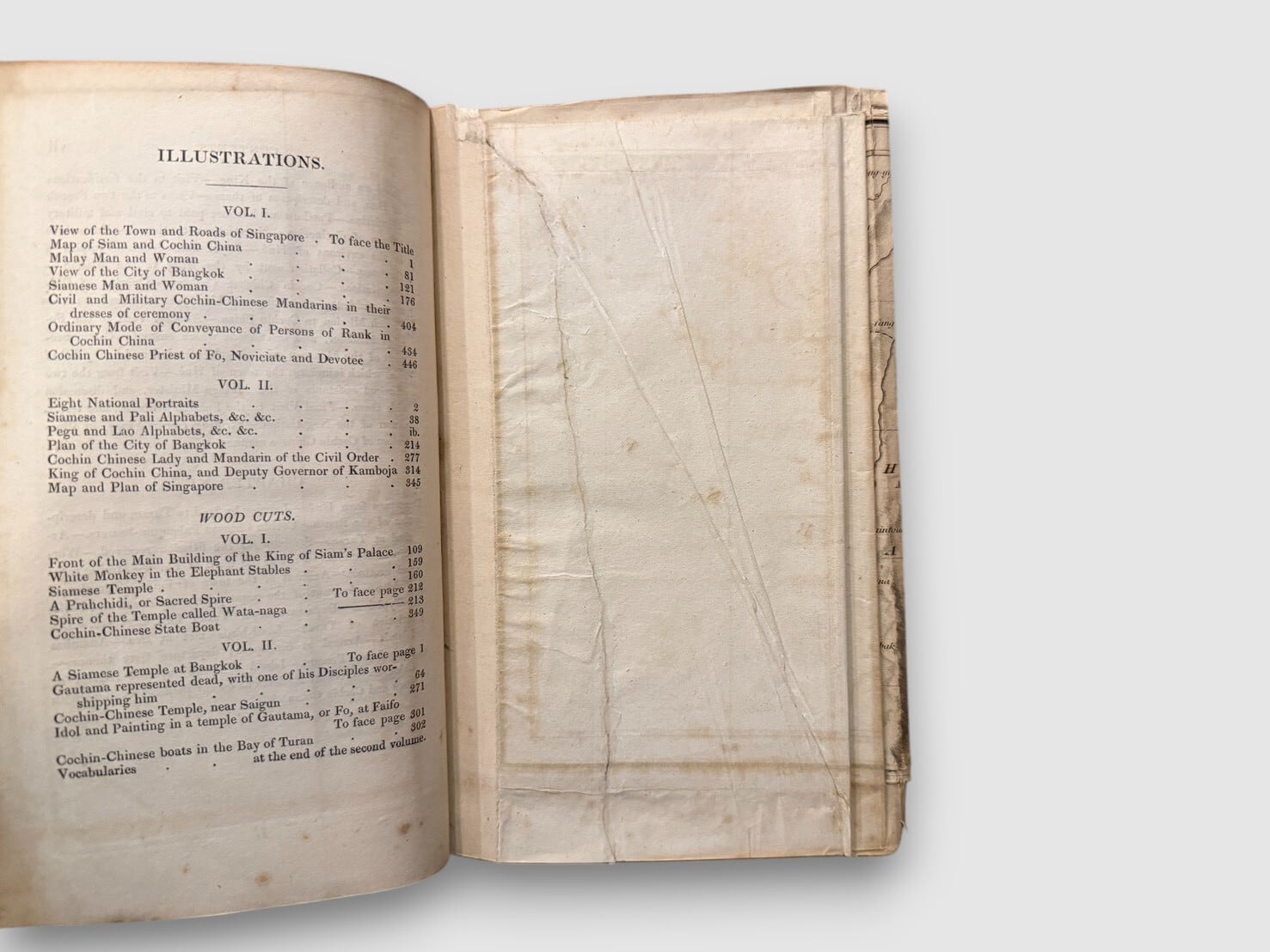 イギリス東インド会社の外交使節として派遣された John Crawfurd による公式報告記録。シャム(現タイ)およびコーチン・チャイナ(現ベトナム南部)への外交使節の経過、政治状況、交易、社会制度、宗教、自然環境などを詳細に記録する。当時のバンコク、シンガポール、シャム宮廷の視覚資料としても参照される図版多数収録。19世紀初頭の英語圏における東南アジア認識を示す非常に貴重な全2巻揃。1830年刊行第2版。