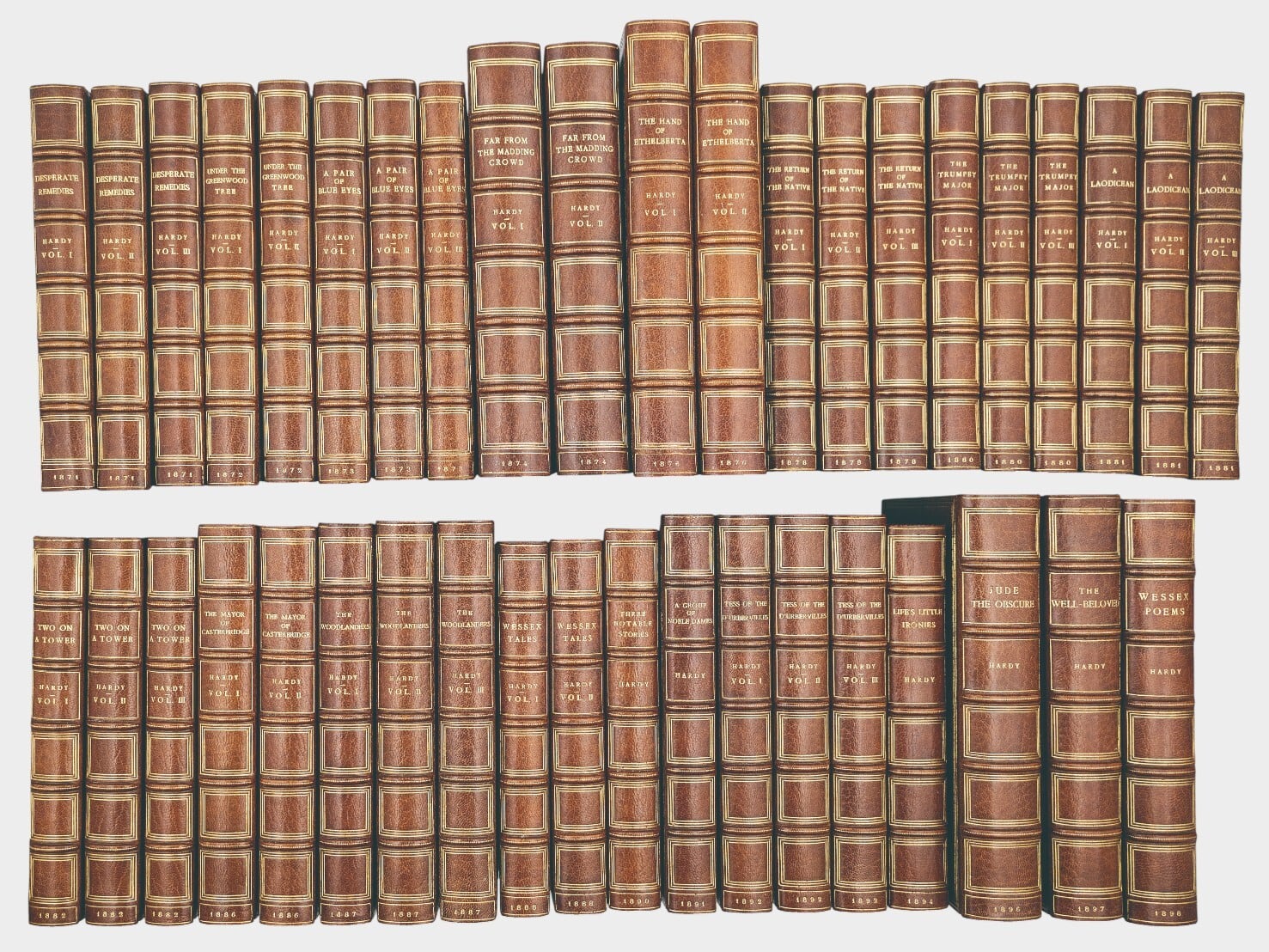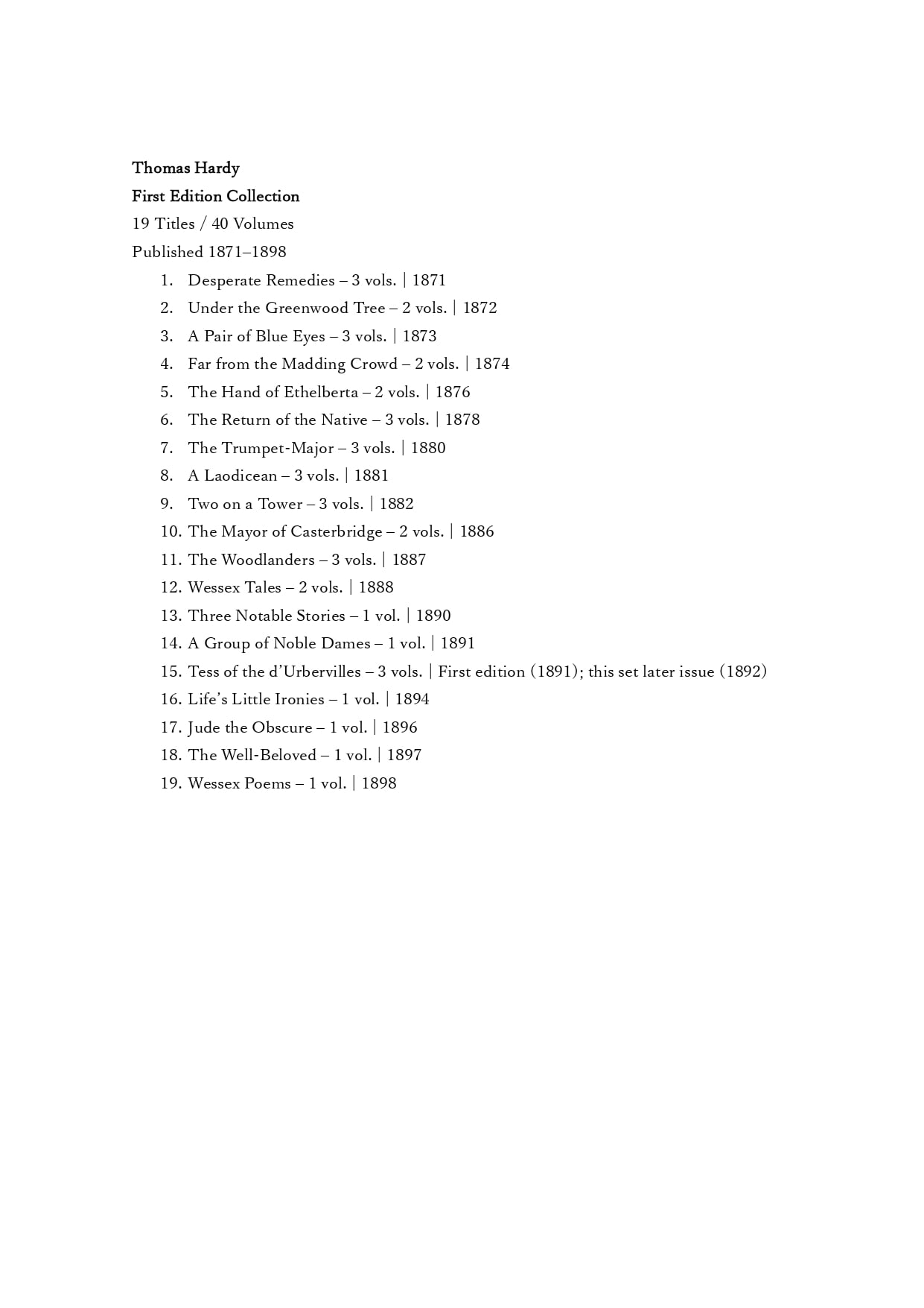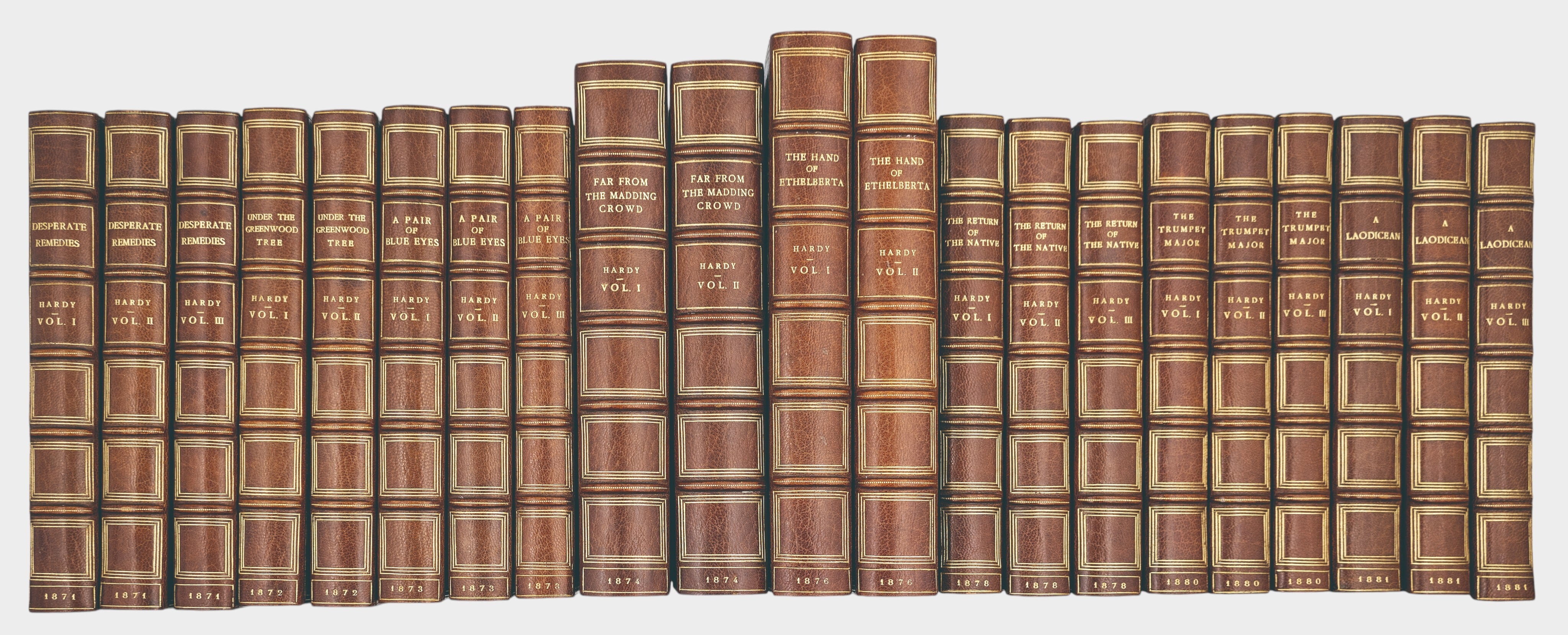 トマス・ハーディの初版作品を中心に構成された全19作品・40冊のコレクション。1871年刊行の Desperate Remedies から、1898年の詩集 Wessex Poems までを含む。各作品はそれぞれの初版時の原出版社(Tinsley Brothers, Smith, Elder, Osgood, McIlvaine ほか)による刊行版である。装丁は全冊Riviereによる総革装。背金装飾と均整の取れた統一意匠を持つ。