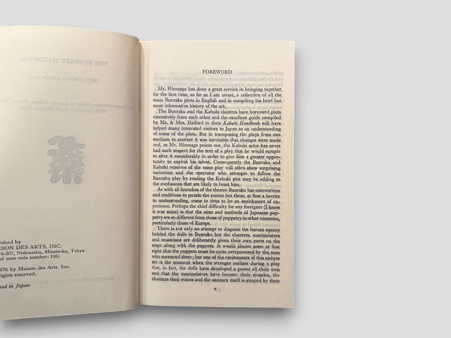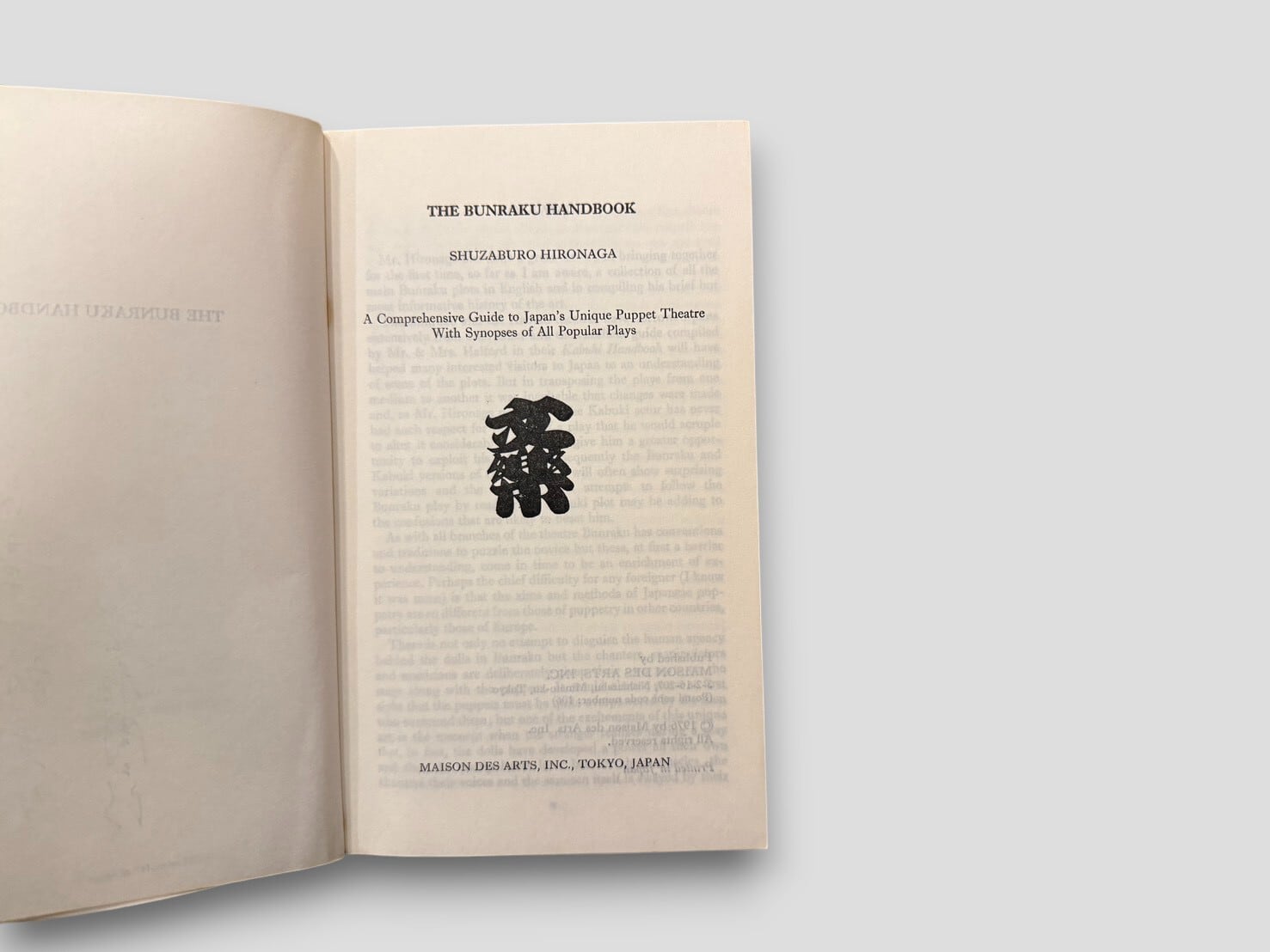 日本の伝統人形劇「文楽」を英語で解説した研究書。1964年に Bunraku, Japan’s Unique Puppet Theatre のタイトルで刊行された原版をもとに改訂された1976年版である。英語圏読者に向けて文楽の概要と上演作品を紹介することを目的とした一冊。著者献呈本。